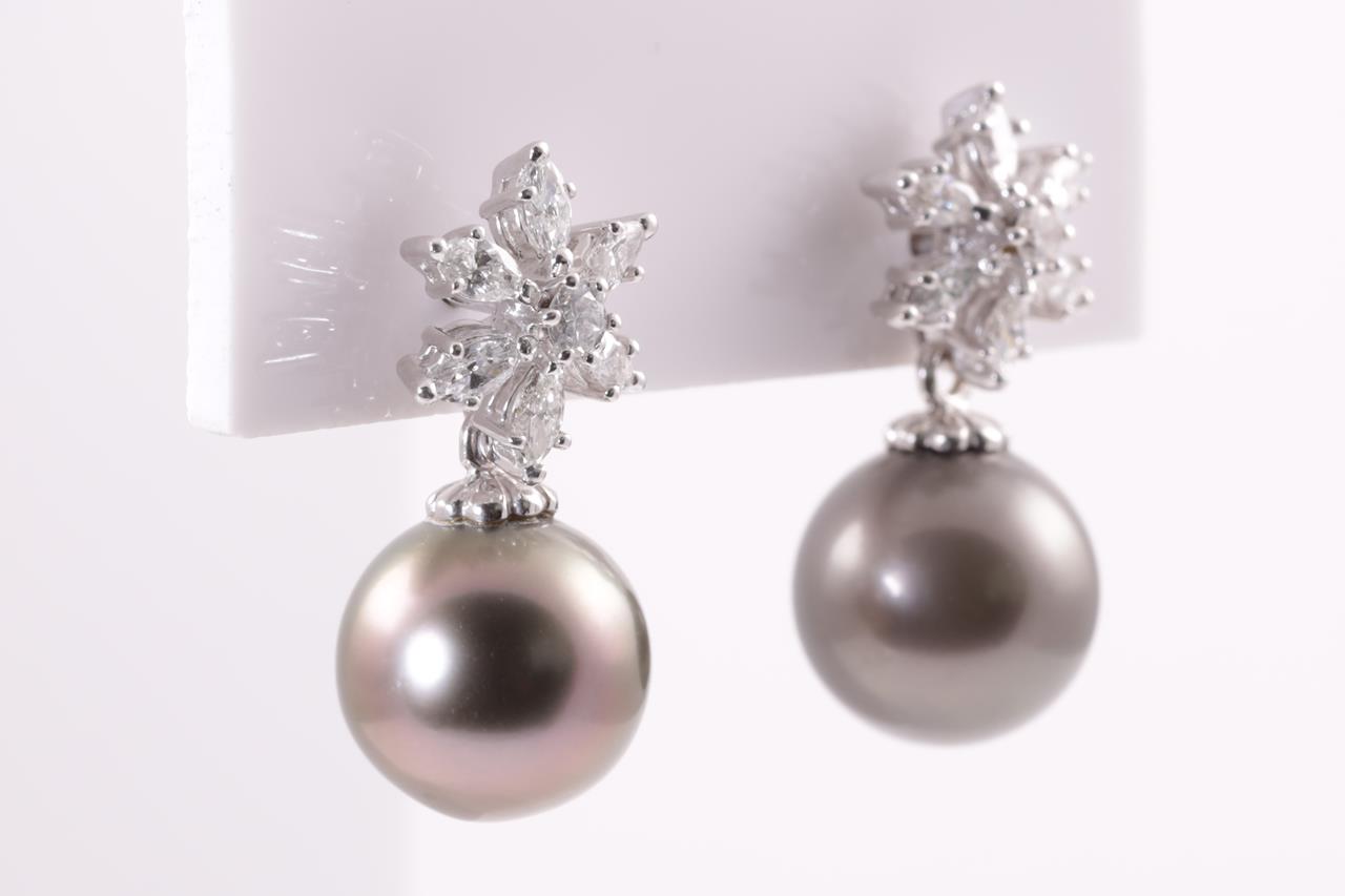 Pearl and Diamond Earrings with Tahitian Pearls of 11mm and round and marquise Diamonds totalling approximately 0.70cts (Estimated grading: G-H VS). 18ct white gold. Weight 8g. (Pre-owned)
