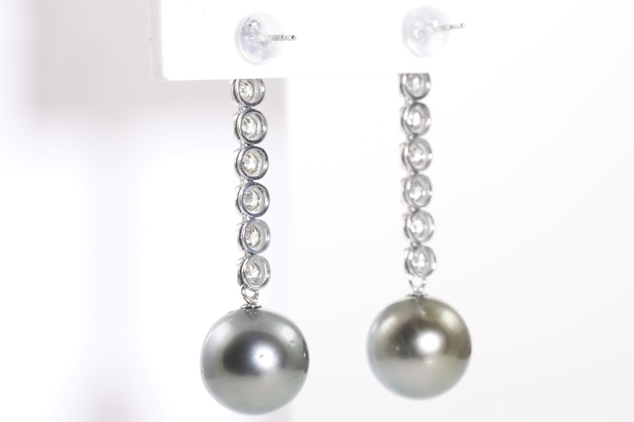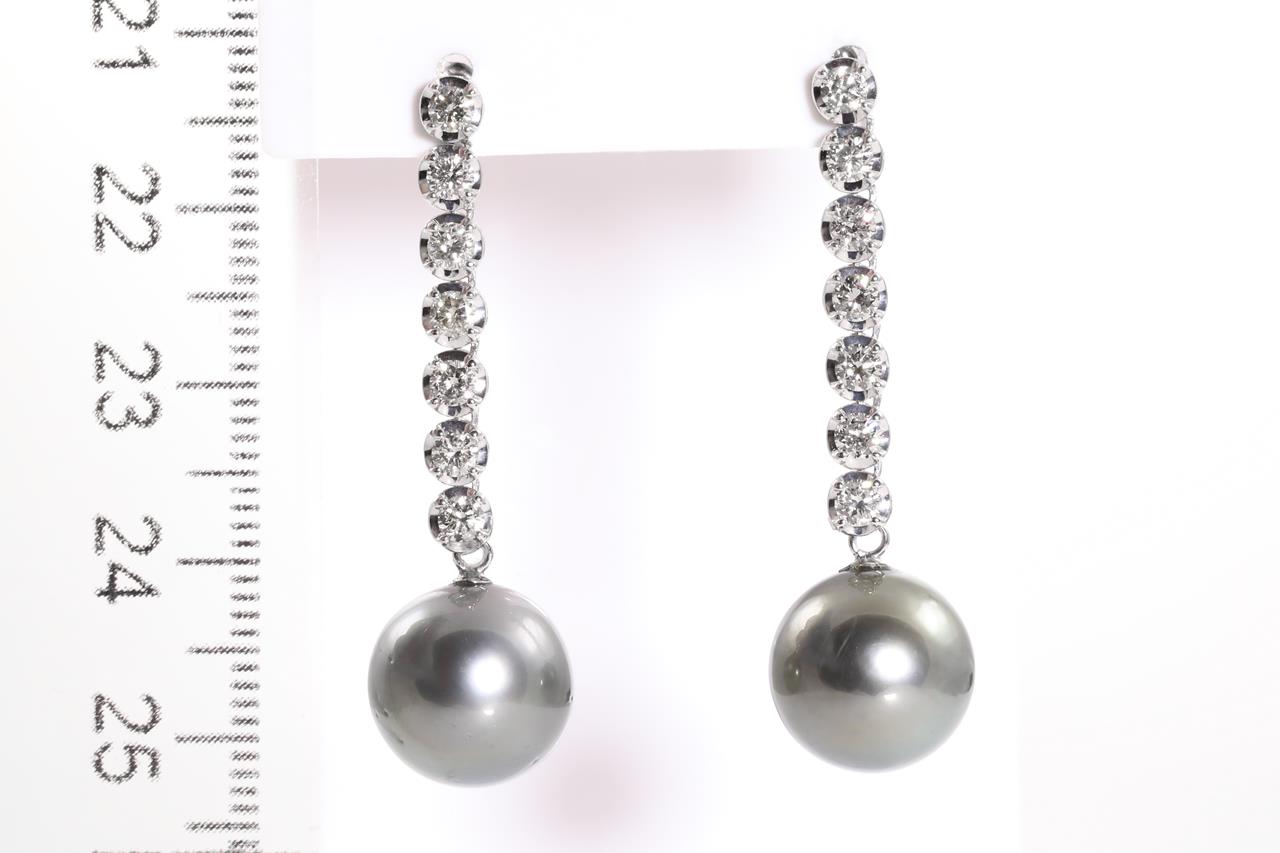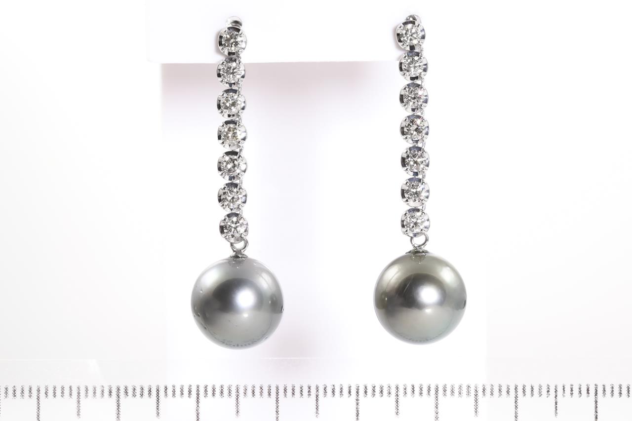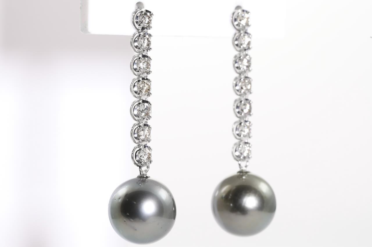 Tahitian Pearl earrings with Tahitian Pearls of 11.70mm and round Diamonds totalling 1.00cts (Estimated grading: J-L SI). 18ct white gold with gold & silicon backs. Weight: 6.7g. (Pre-owned)