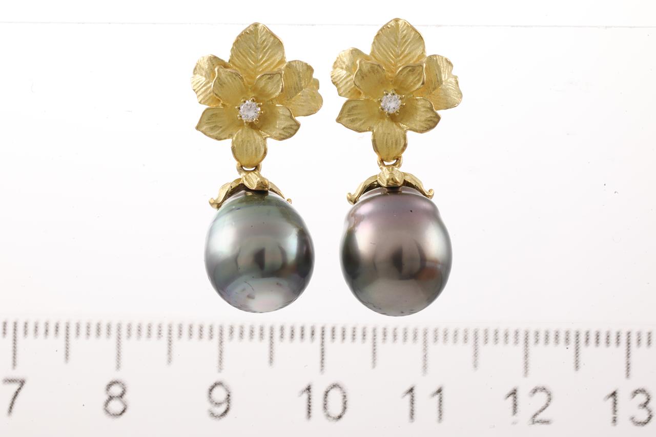Pearl and Diamond earrings with drop shape Tahitian Pearls of 10.6mm and Diamonds totalling approximately 0.04cts. 18ct yellow gold. Weight: 8.6g. (Pre-owned)