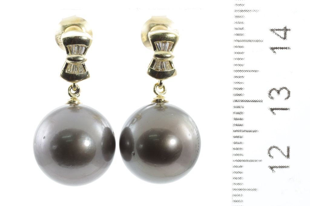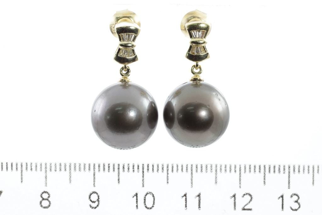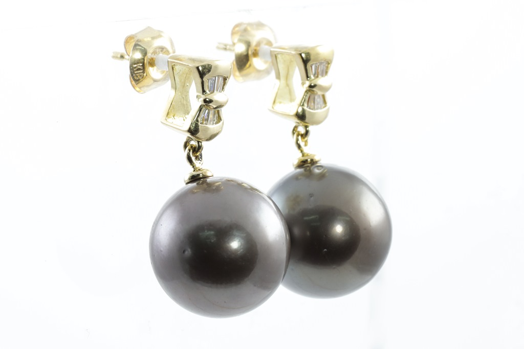Pearl and Diamond Earrings with Tahitian Pearls of 13.5mm and baguette Diamonds totalling approximately 0.24cts. 18ct yellow gold. Weight: 10.4g (Pre-owned)