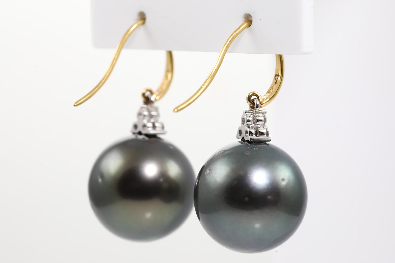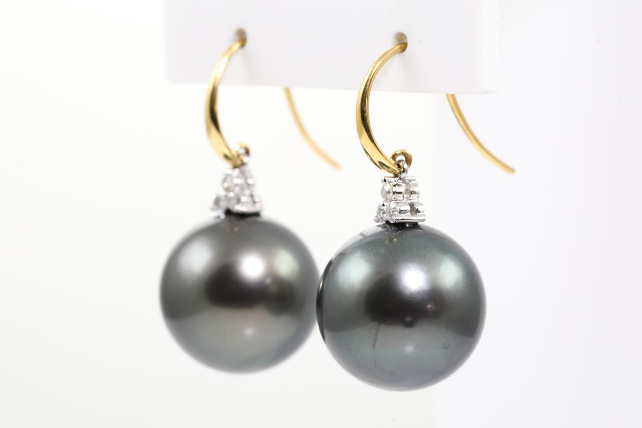 Tahitian Pearl and Diamond shepherd hook earrings with 16.6mm Tahitian Pearls and round Diamonds totalling approximately 0.20cts (Estimated Grading H SI). 18ct white and yellow gold. Weight 15.3g. (As New)