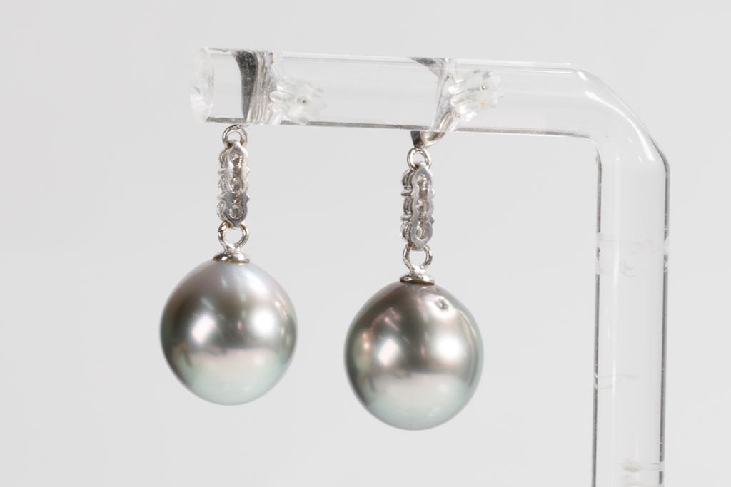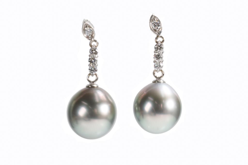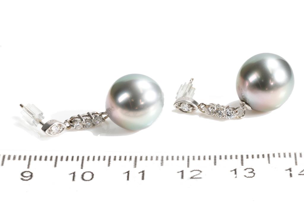 Tahitian Pearl earrings with Tahitian Pearls of 11.0mm and round Diamonds totalling 0.26cts. 18ct white gold with silicon backs. Weight: 5.4g. (Pre-owned)