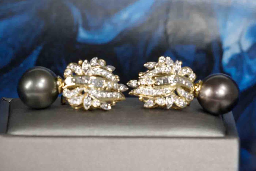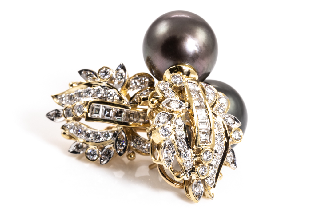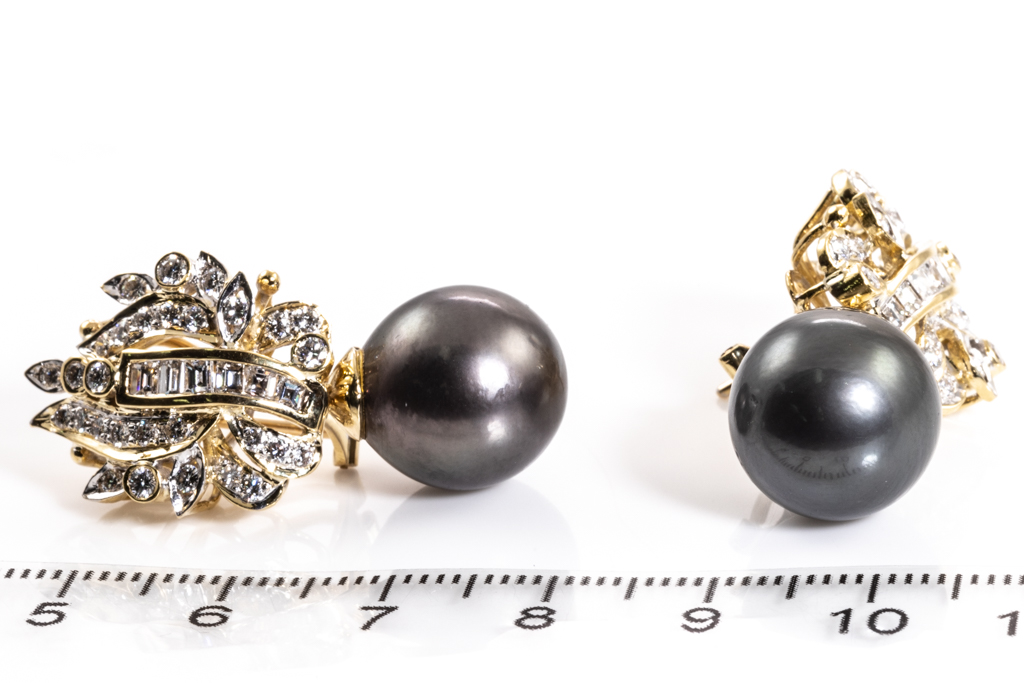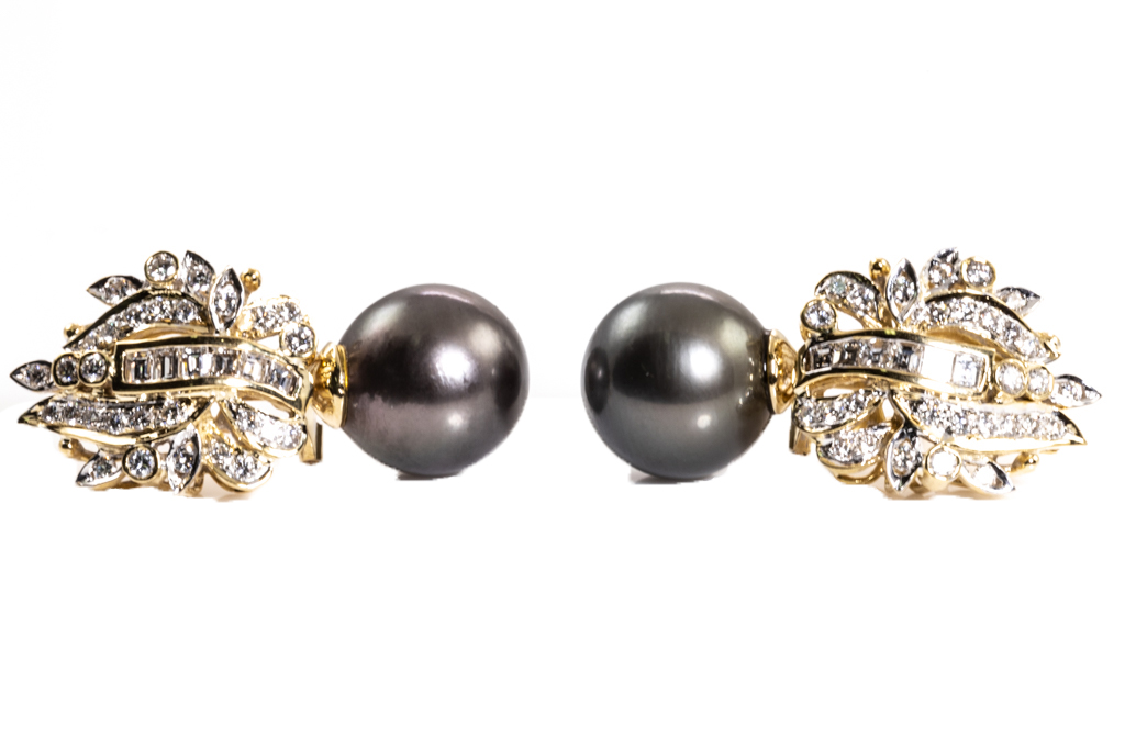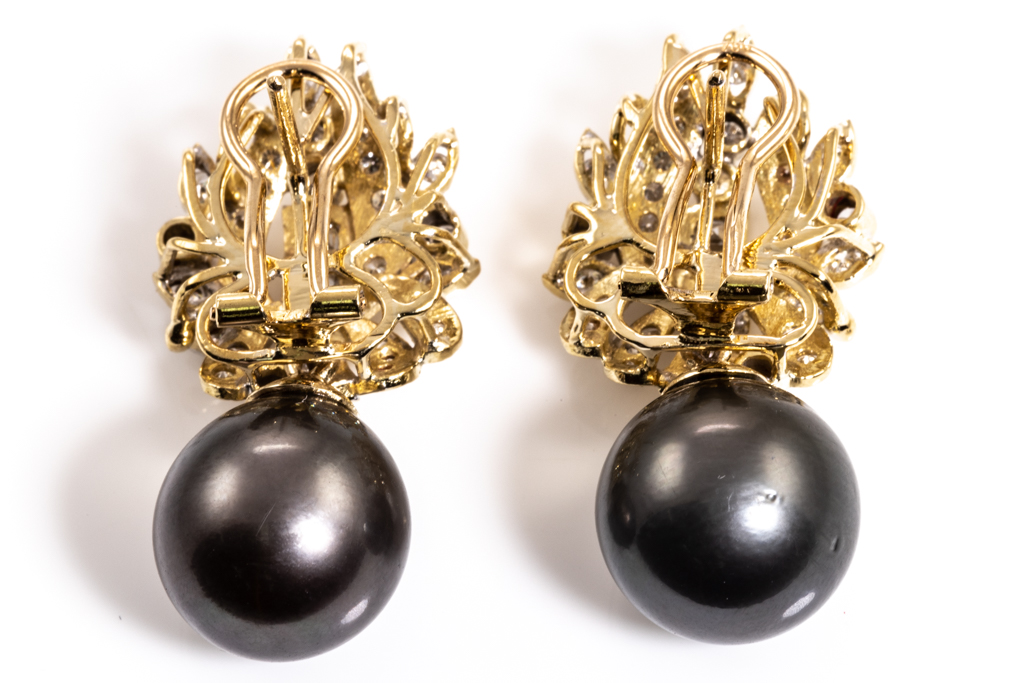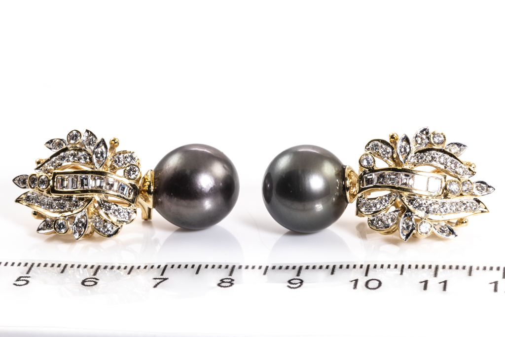 Pearl and Diamond earrings with Tahitian Pearls of 12.9-13.3mm and round & carre cut Diamonds totalling 1.80cts (Estimated grading: F-G VS-SI). 18ct yellow gold. Weight: 18.7g (Pre-owned)