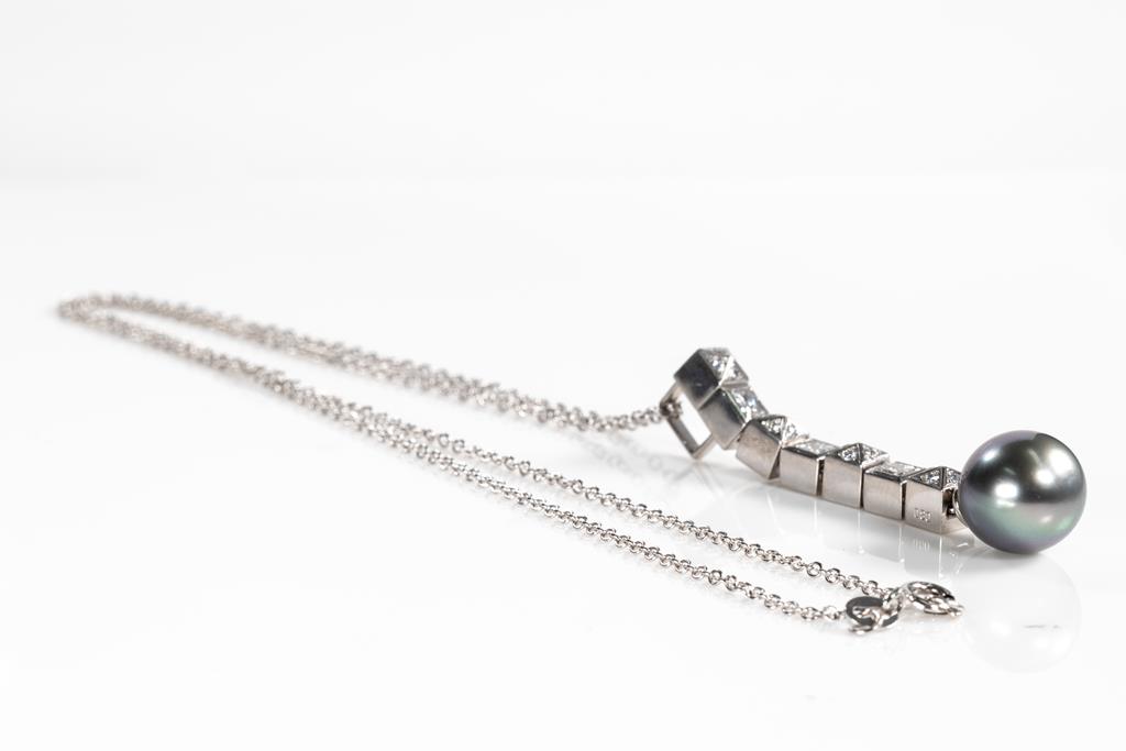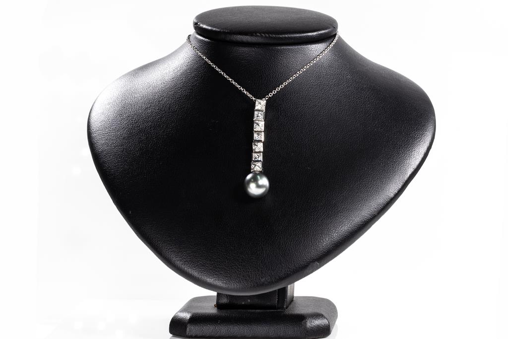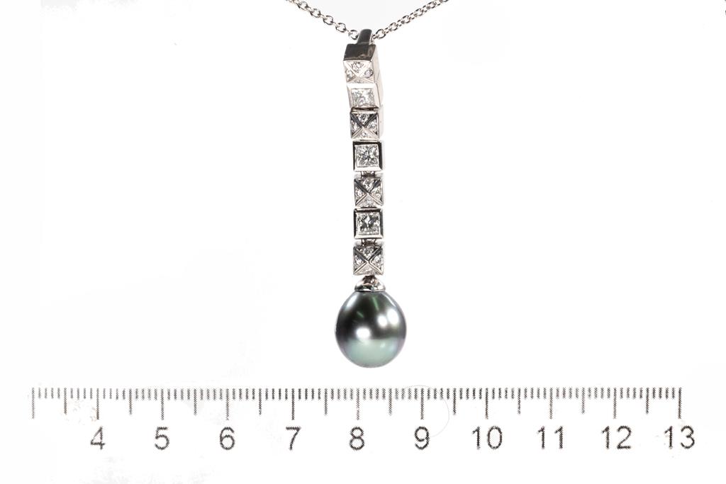 Pearl and Diamond pendant with Tahitian Pearl of 11.1mm and Diamonds totalling 0.80cts (Estimated grading: G VS). Platinum pendant, includes 44cm 18ct white gold chain. Weight: 12.7g (Pre-owned)