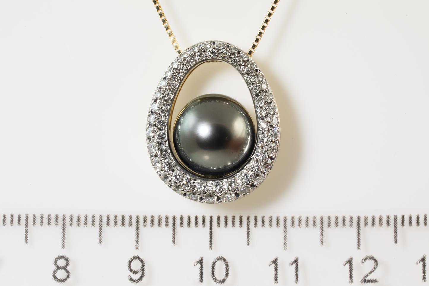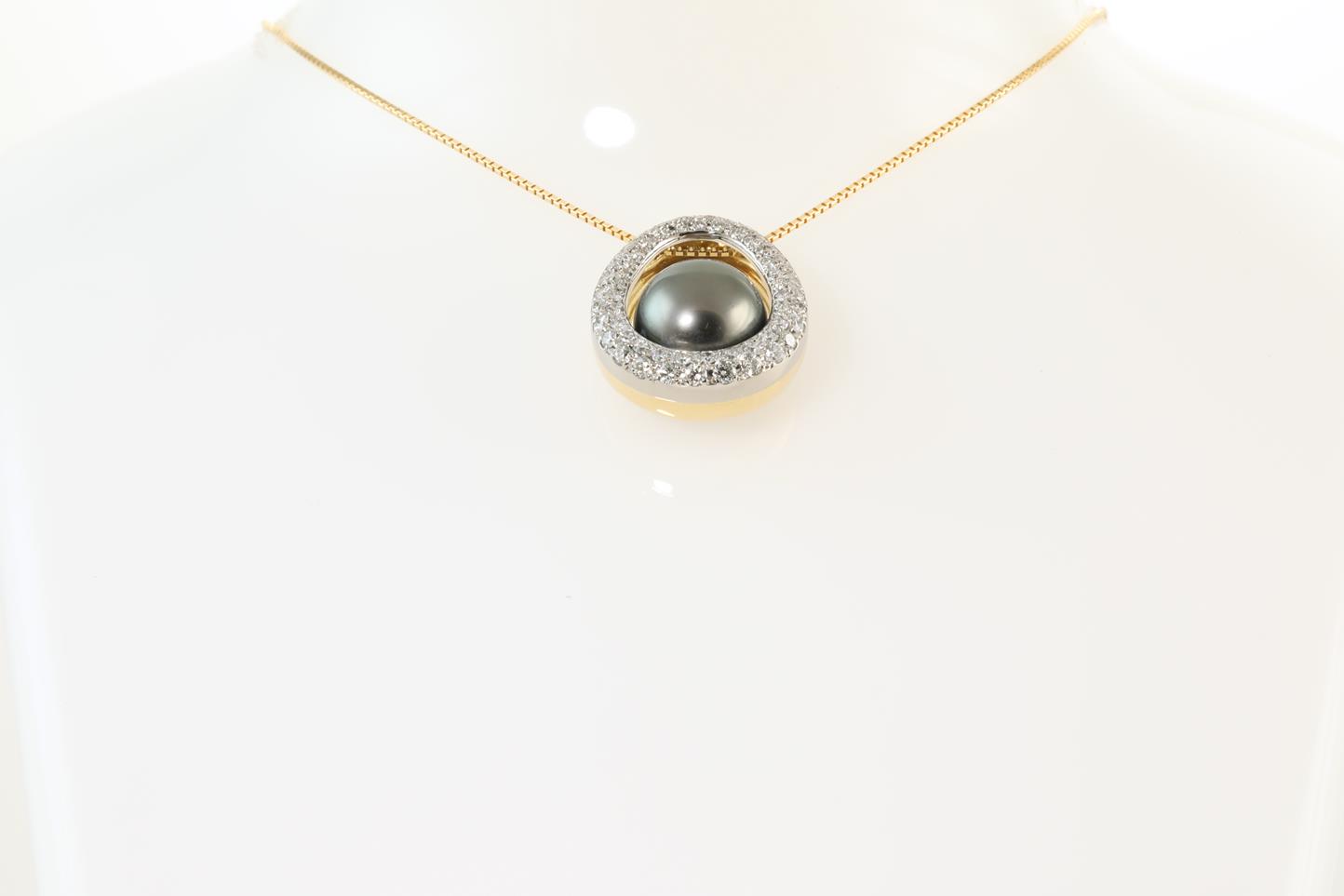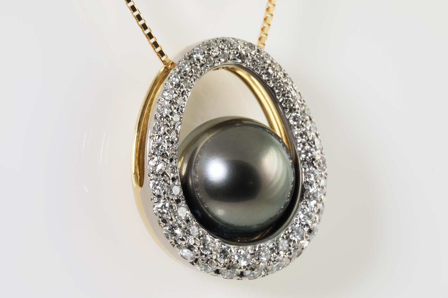 Pearl and Diamond pendant with Tahitian Pearl of 11.0mm and Diamonds totalling 0.70cts (Estimated grading: G SI). 18ct yellow gold with 18ct yellow gold 45cm adjustable chain. Weight: 9.3g (Pre-owned)