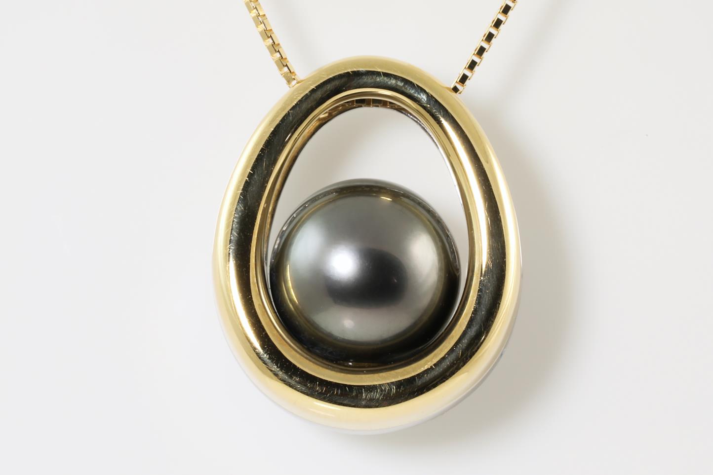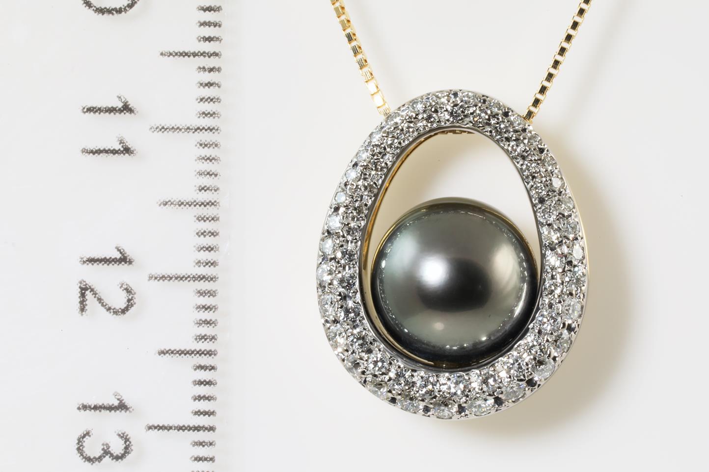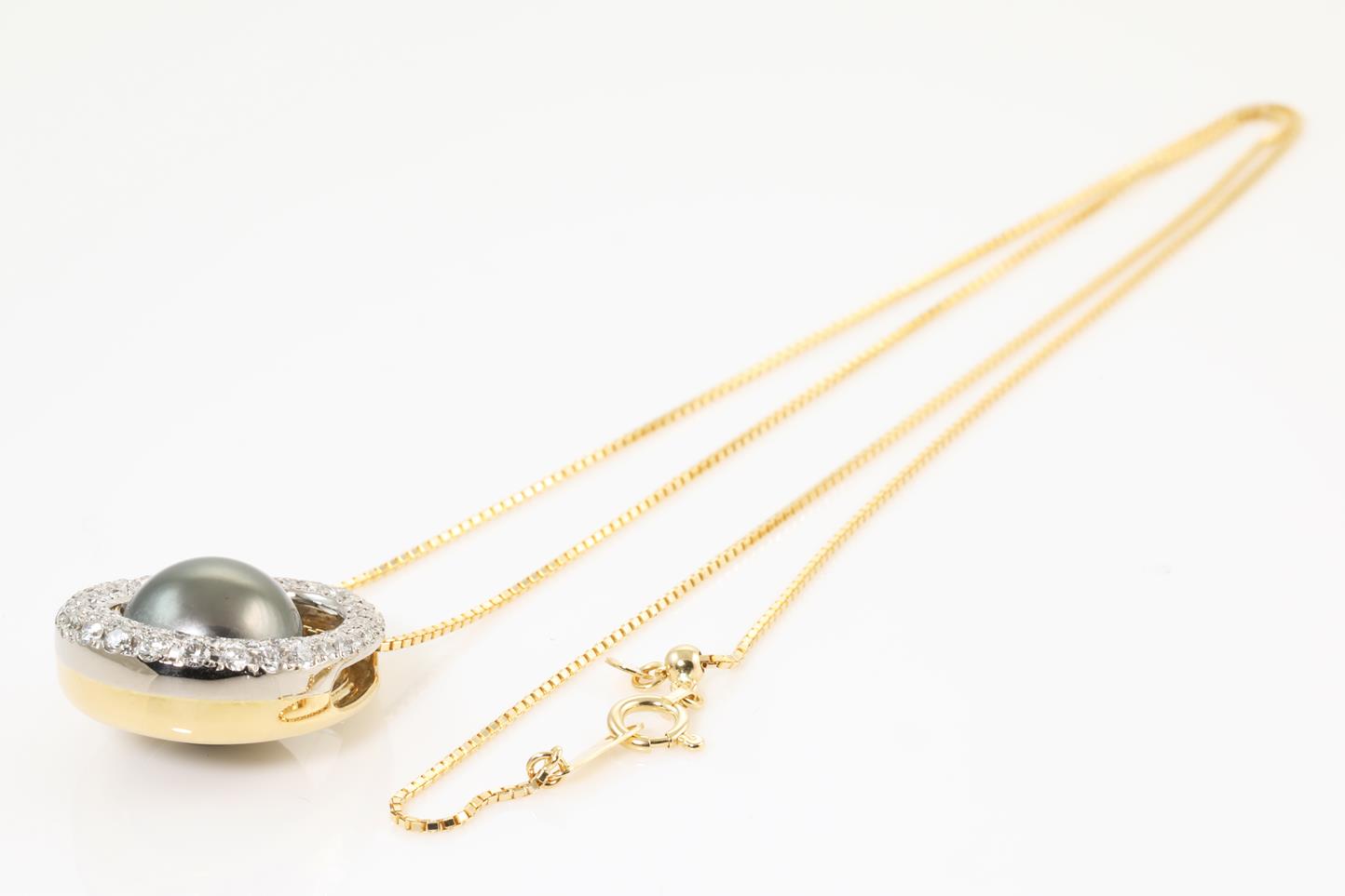Pearl and Diamond pendant with Tahitian Pearl of 11.0mm and Diamonds totalling 0.70cts (Estimated grading: G SI). 18ct yellow gold with 18ct yellow gold 45cm adjustable chain. Weight: 9.3g (Pre-owned)