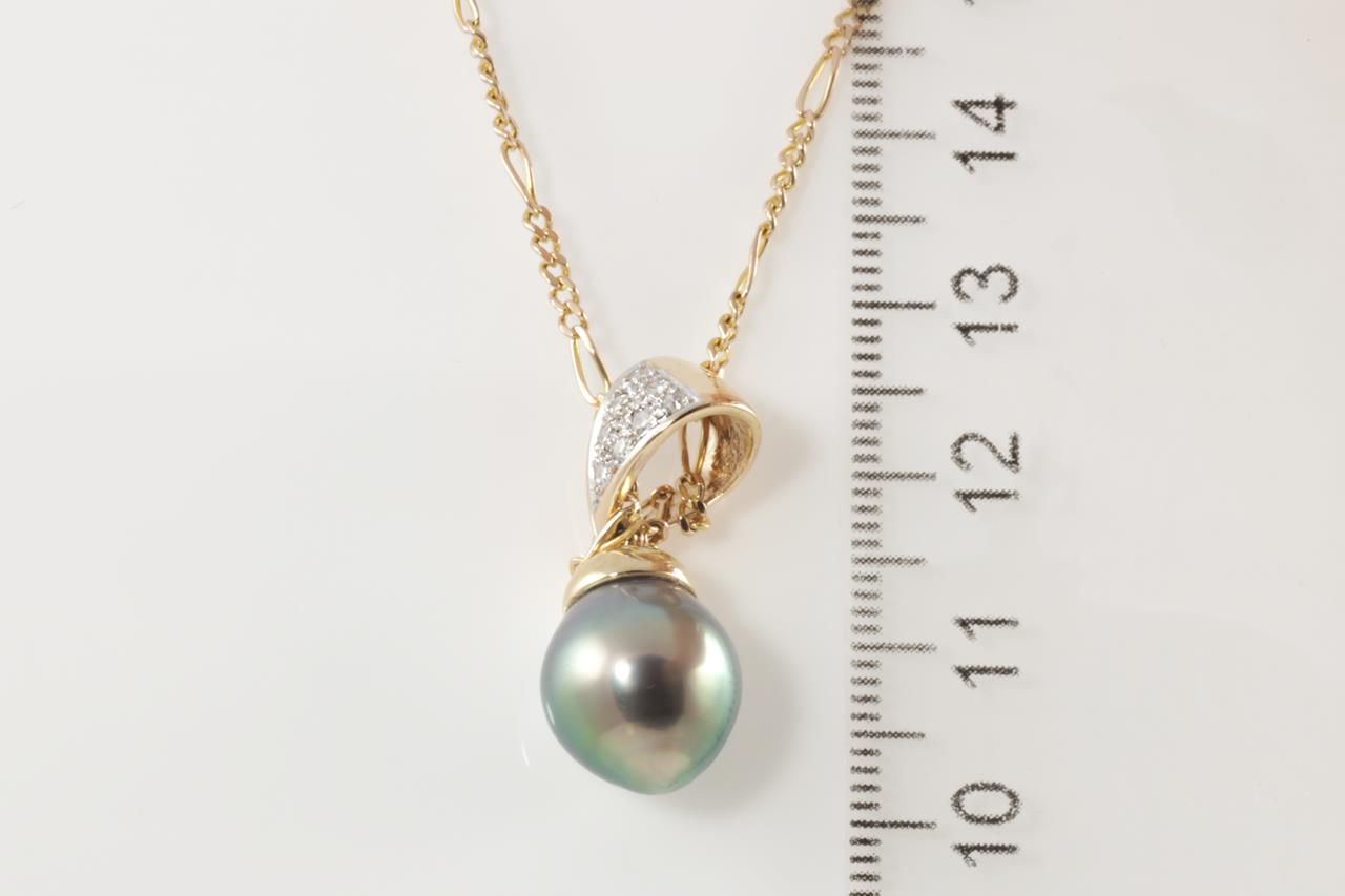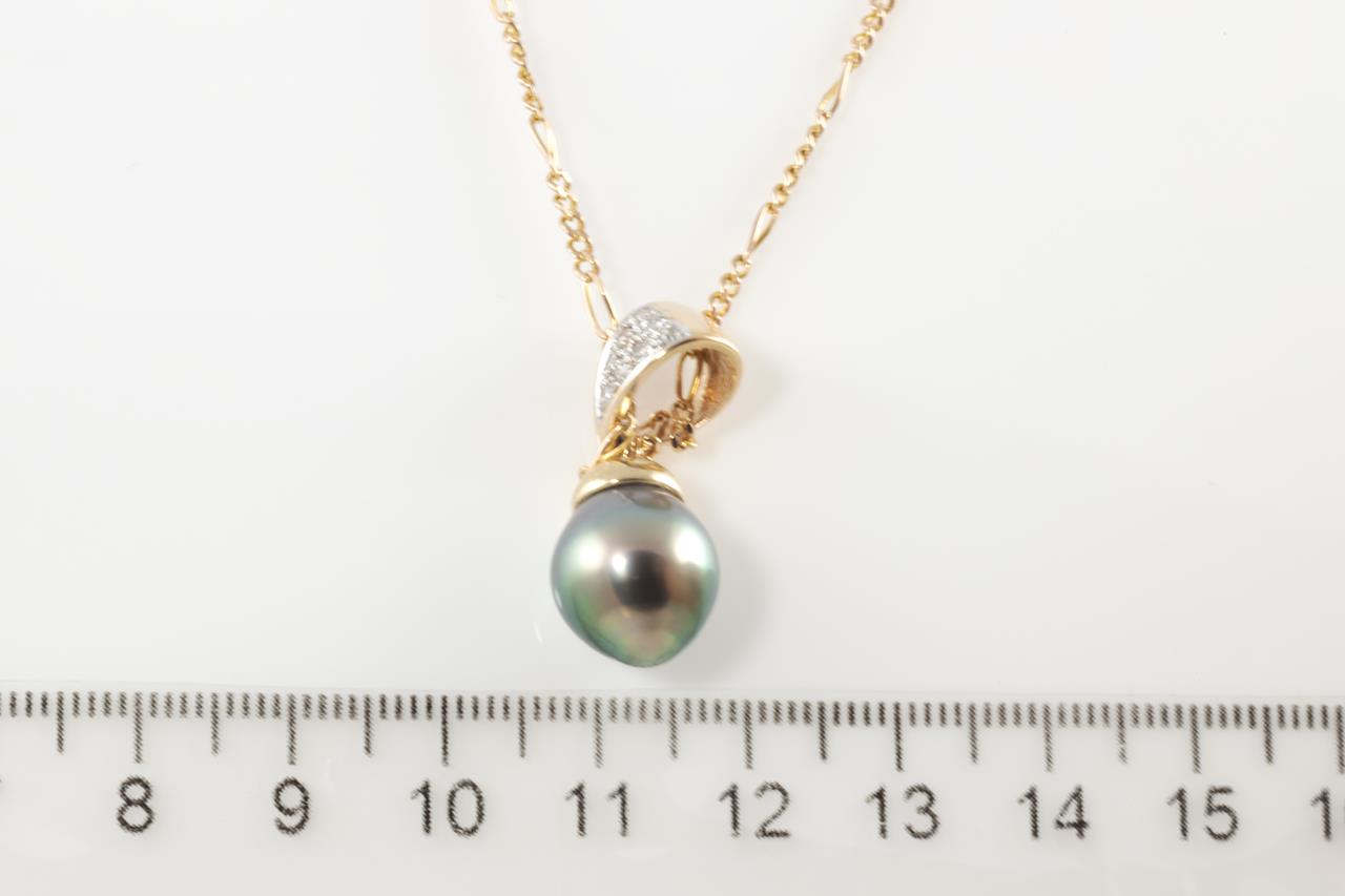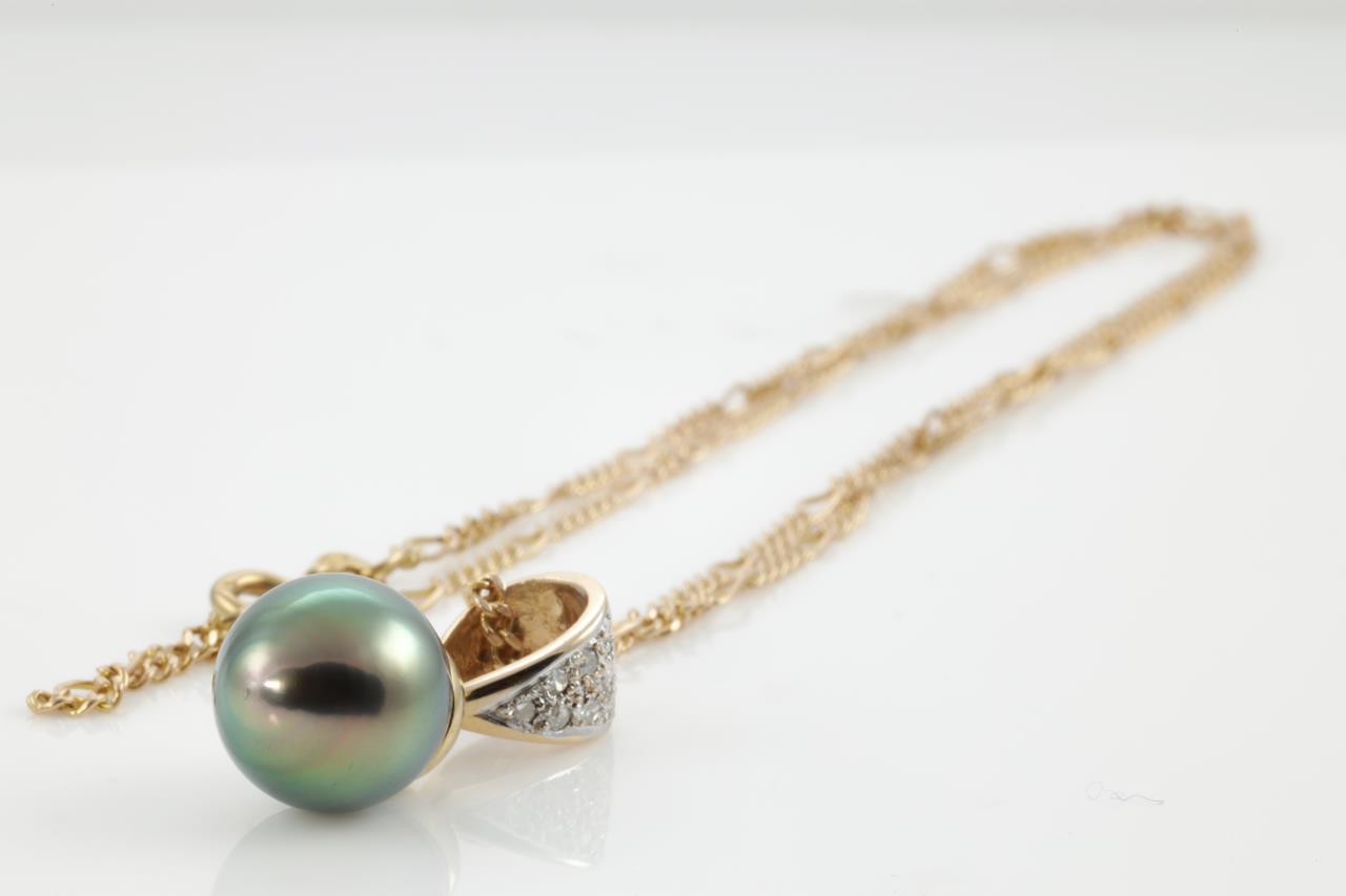 Pearl and Diamond pendant with a Tahitian pearl of 11mm and Diamonds totalling approximately 0.16cts. 9ct yellow gold with 49cm chain. Weight: 6.9g (Pre-owned)