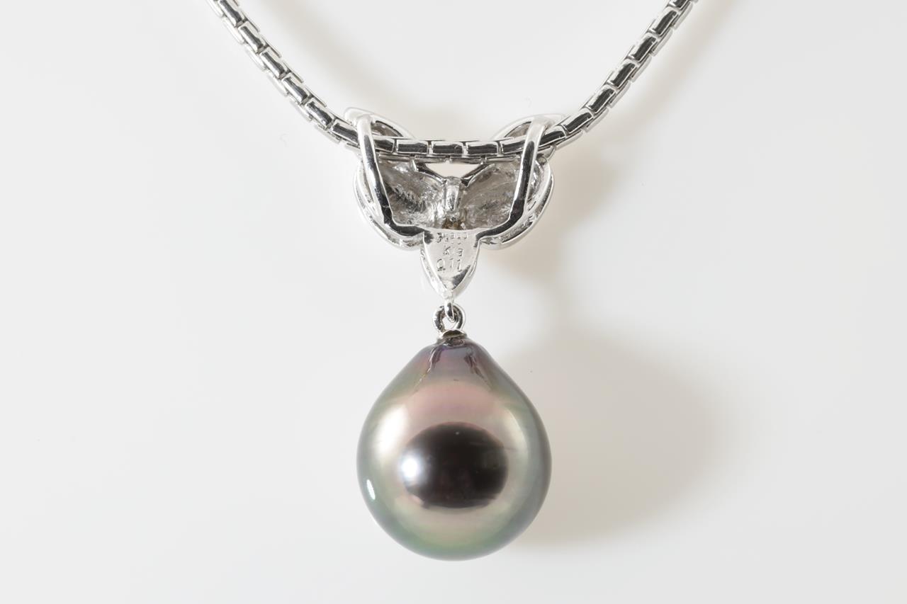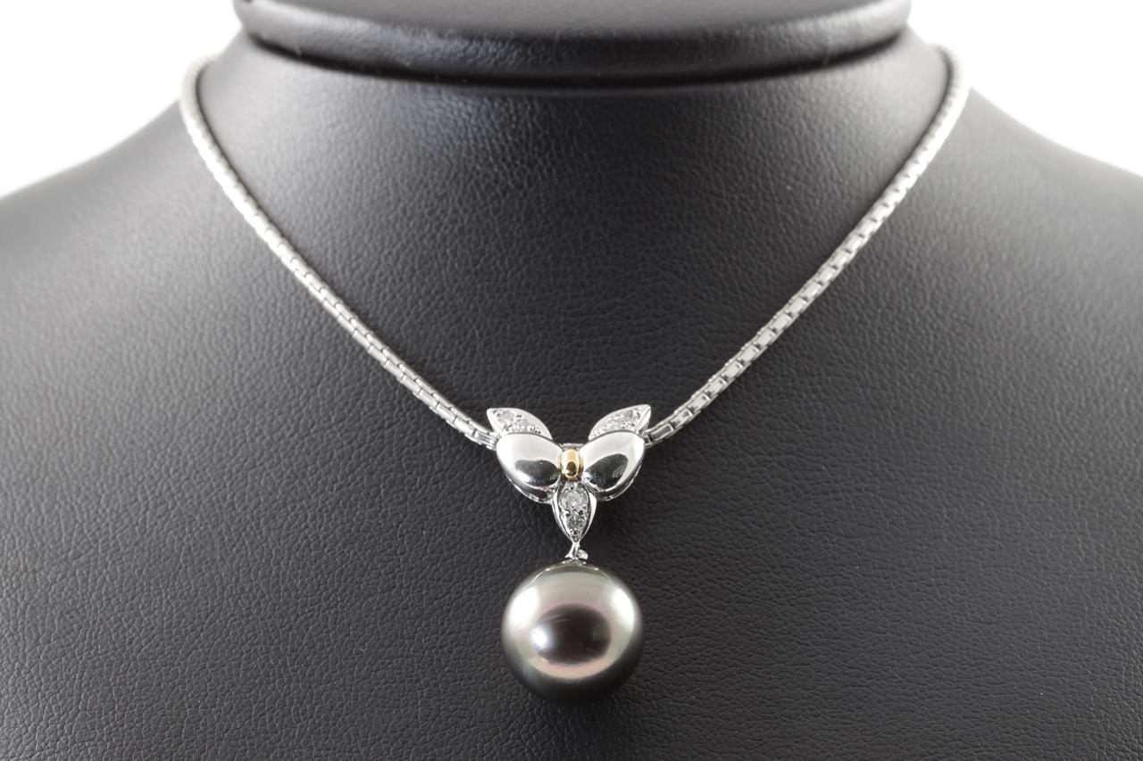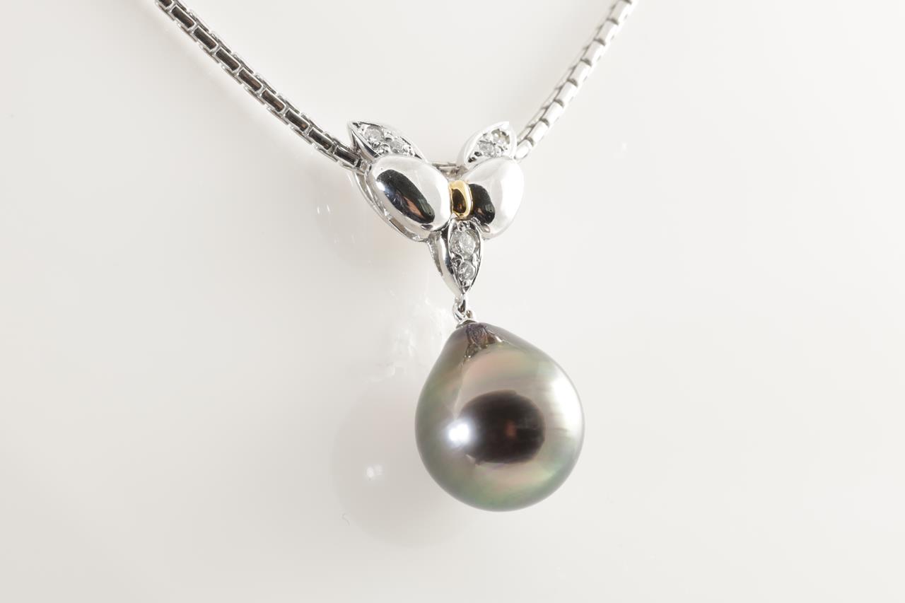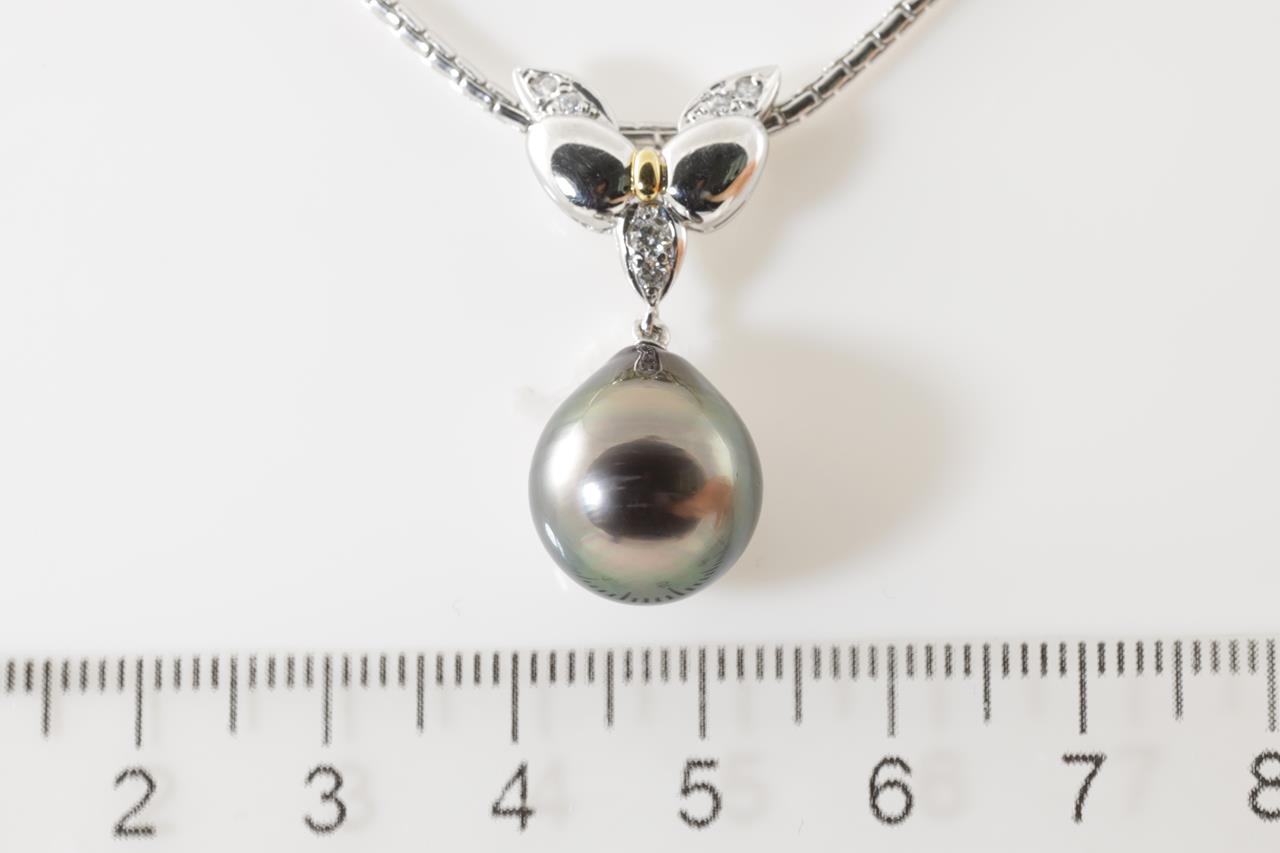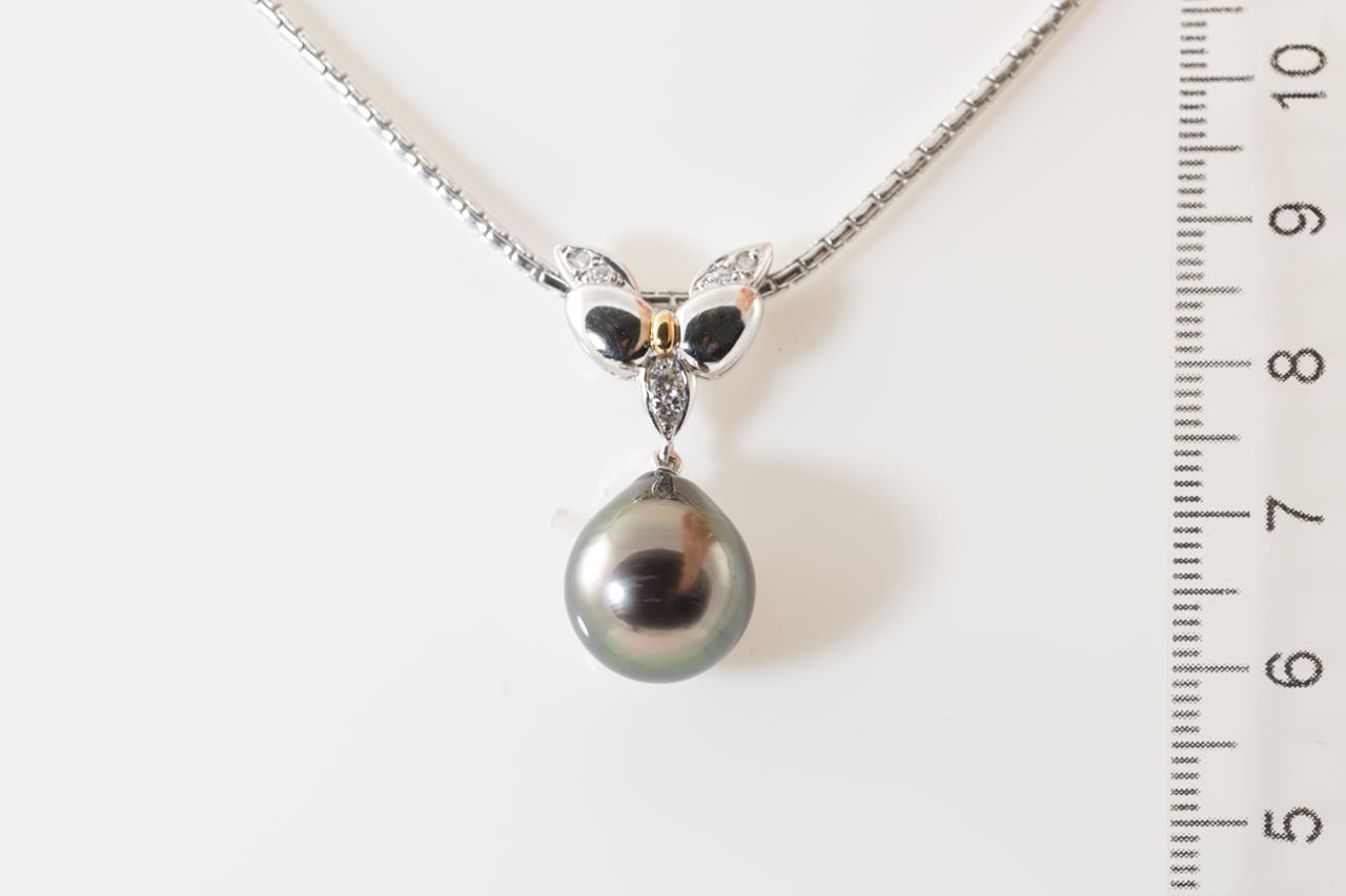 Pearl and Diamond pendant with a drop shape Tahitian Pearl of 12.4mm and Diamonds totalling 0.11cts. 18ct yellow gold & platinum with 51cm adjustable platinum chain. Weight: 19.5g. (Pre-owned)