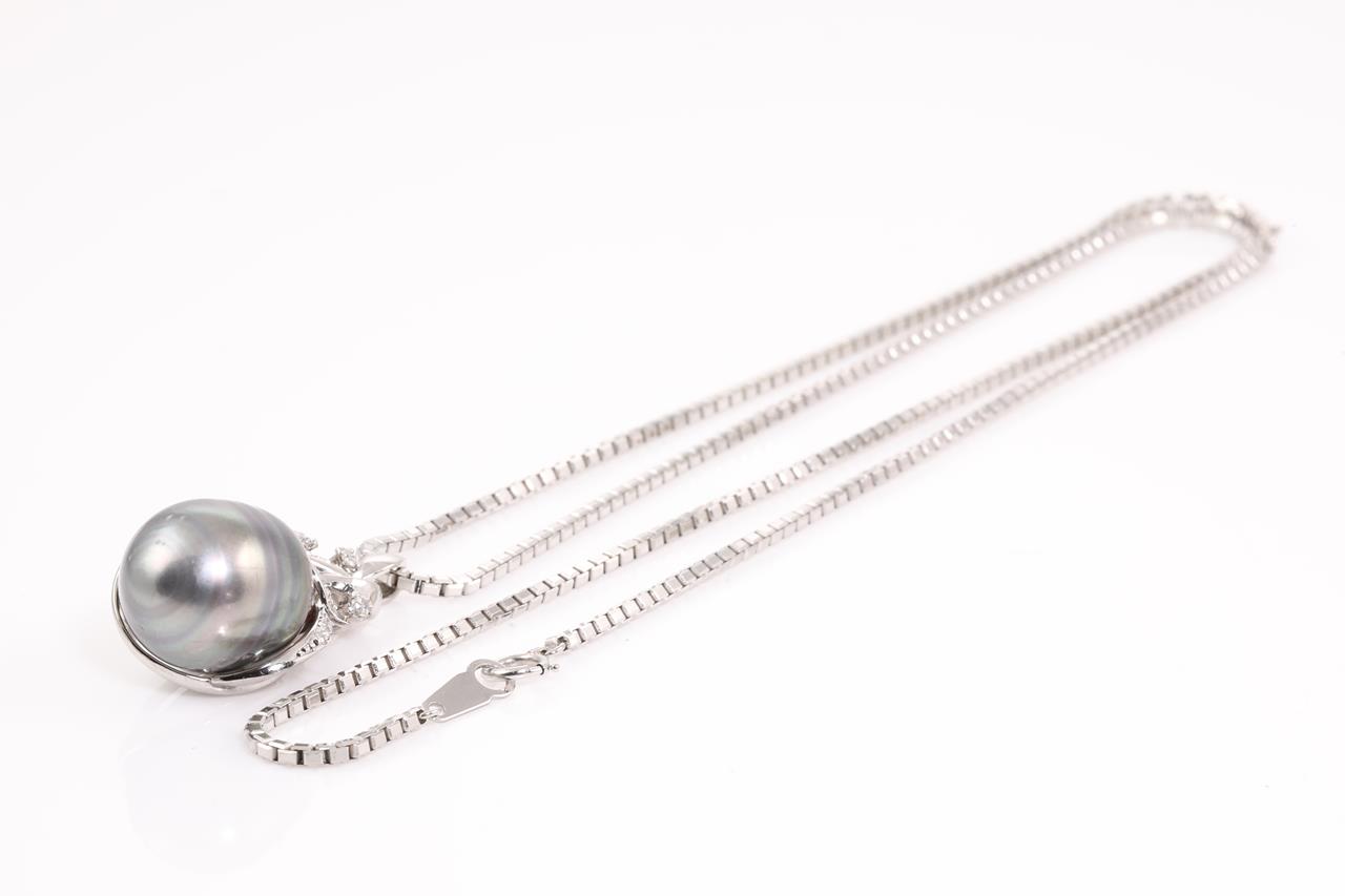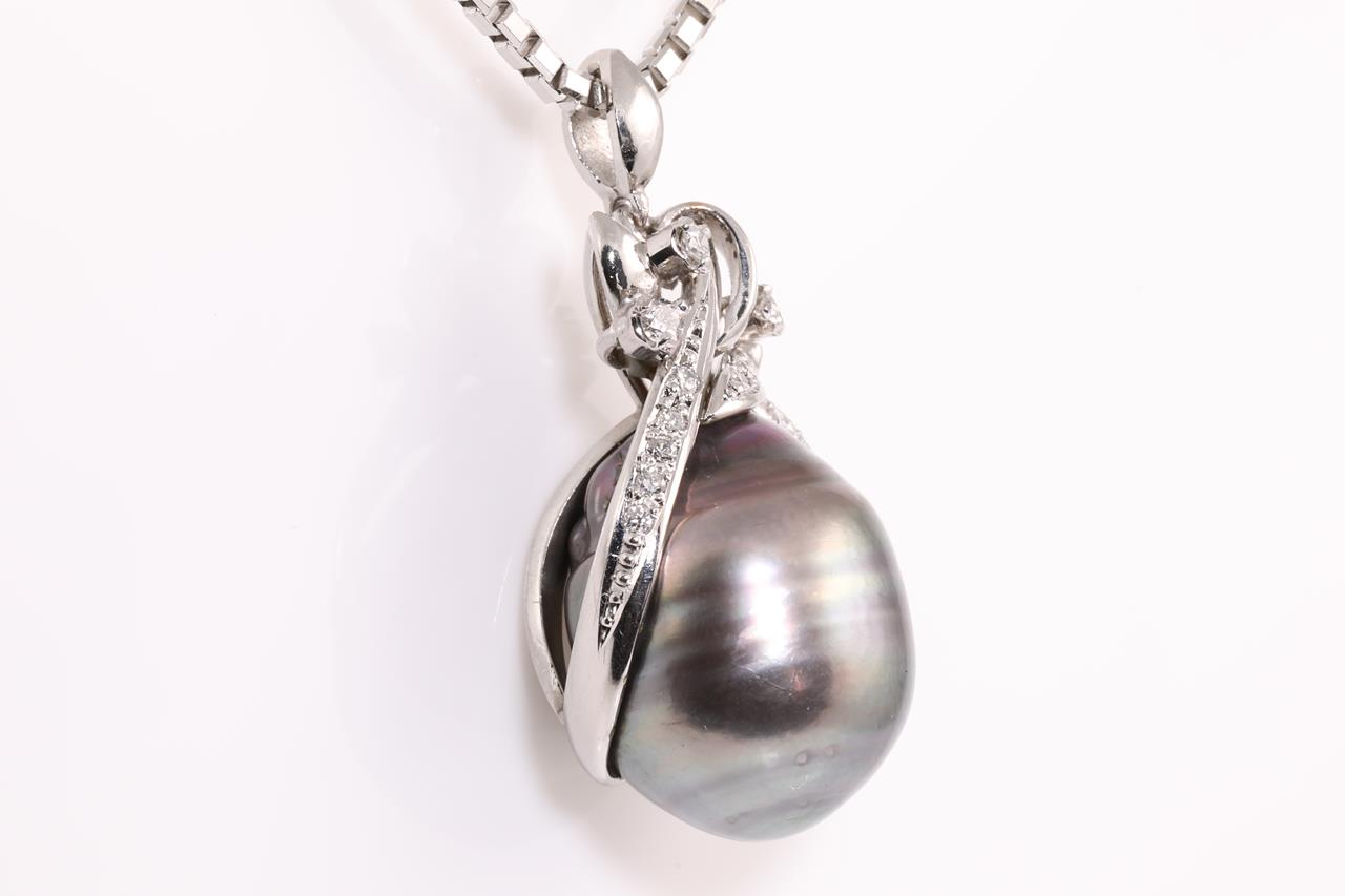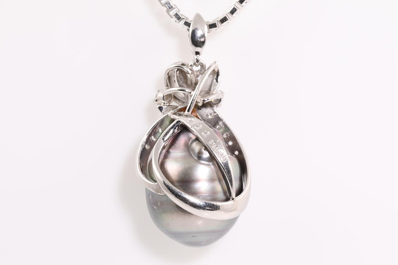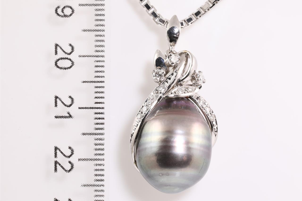 Pearl and Diamond pendant with a Tahitian Pearl of 14.5mm and Diamonds totalling 0.22cts. Platinum with 60cm platinum adjustable chain. Weight: 28.4g. (Pre-owned)