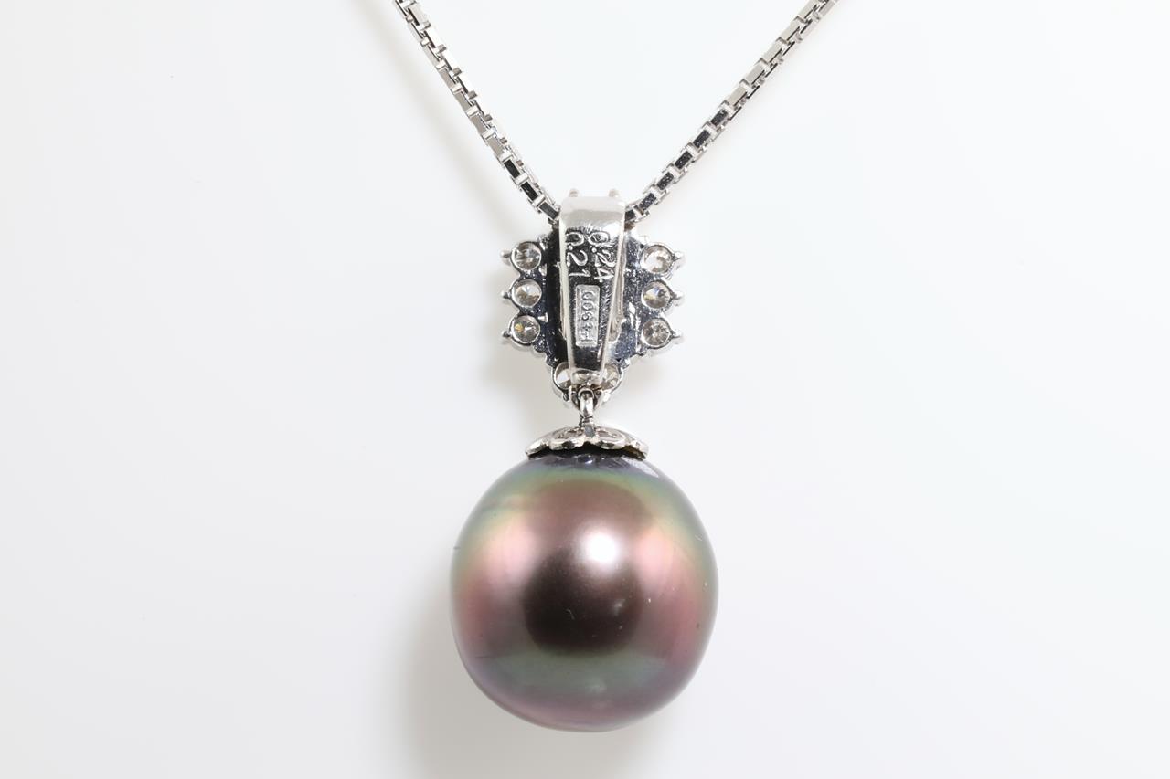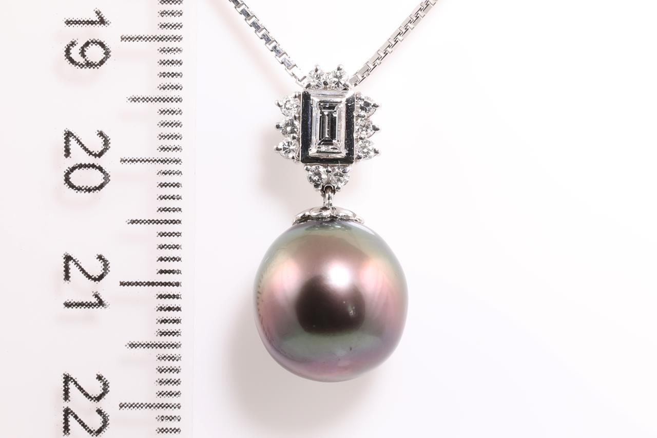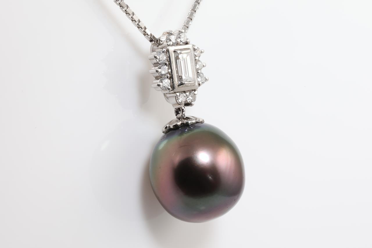 Pearl and Diamond pendant with a Tahitian Pearl of 12.6mm and centre emerald cut diamond and 10 Diamonds totalling 0.45cts (Estimated grading: H SI, H-I SI-P1). Platinum with 40cm platinum adjustable chain. Weight: 8.9g (Pre-owned)