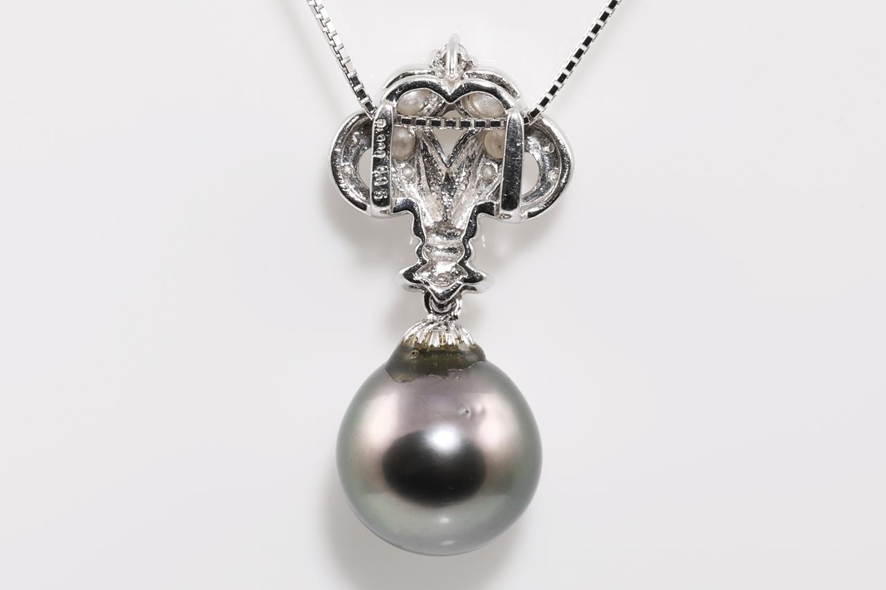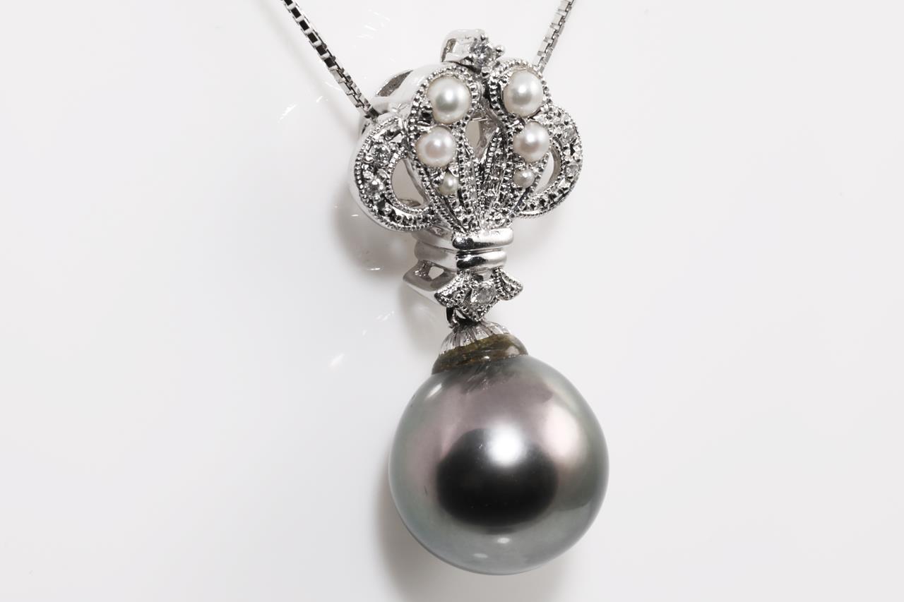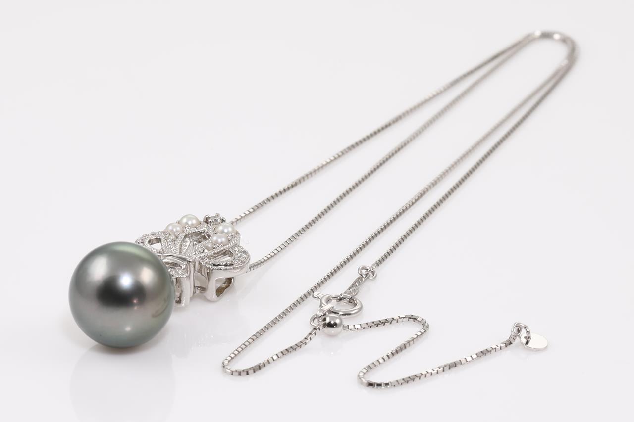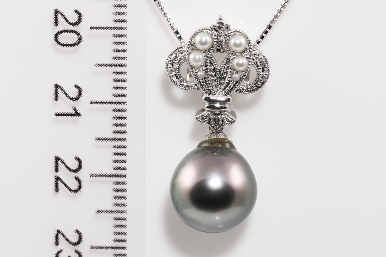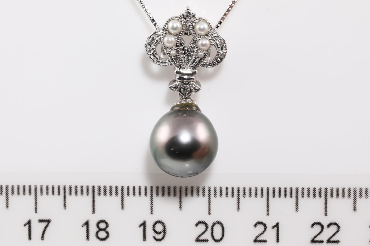 Pearl and Diamond Pendant with Tahitian Pearl of 12.0mm, seed pearls and Diamonds totalling 0.05cts. Platinum with 44cm adjustable 18ct white gold chain. Weight: 7.5g. (Pre-owned)