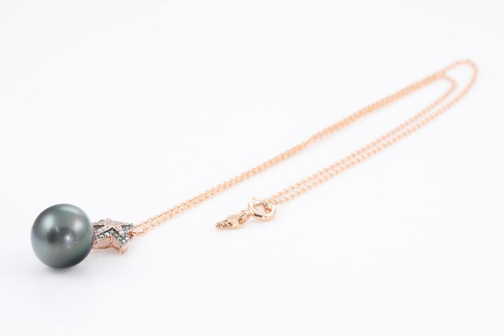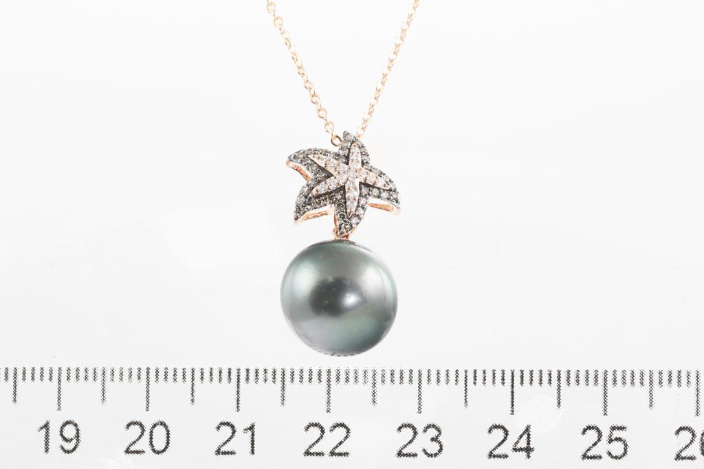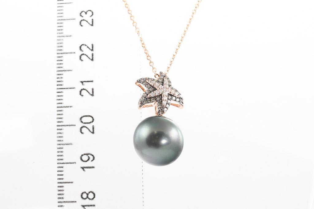 Star shaped Pendant with Tahitian pearl of 12.8mm and round Diamonds totalling approximately 0.26cts. 9ct rose and white gold with rhodium plated finish. Weight 3.9g. On display chain (metal base). (Pre-owned)