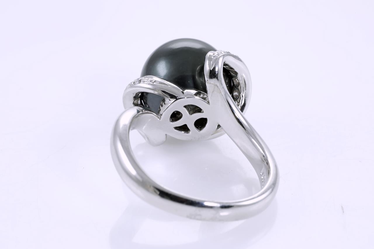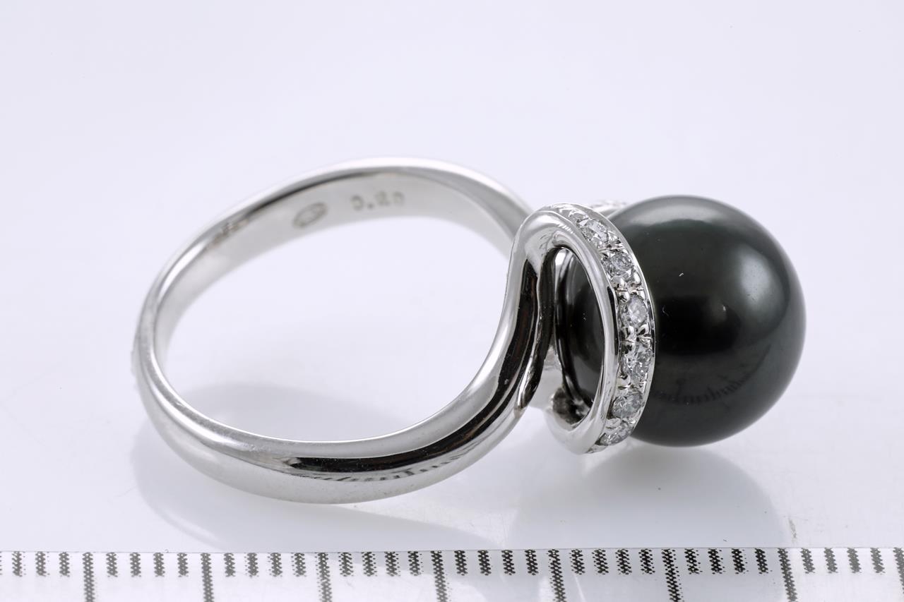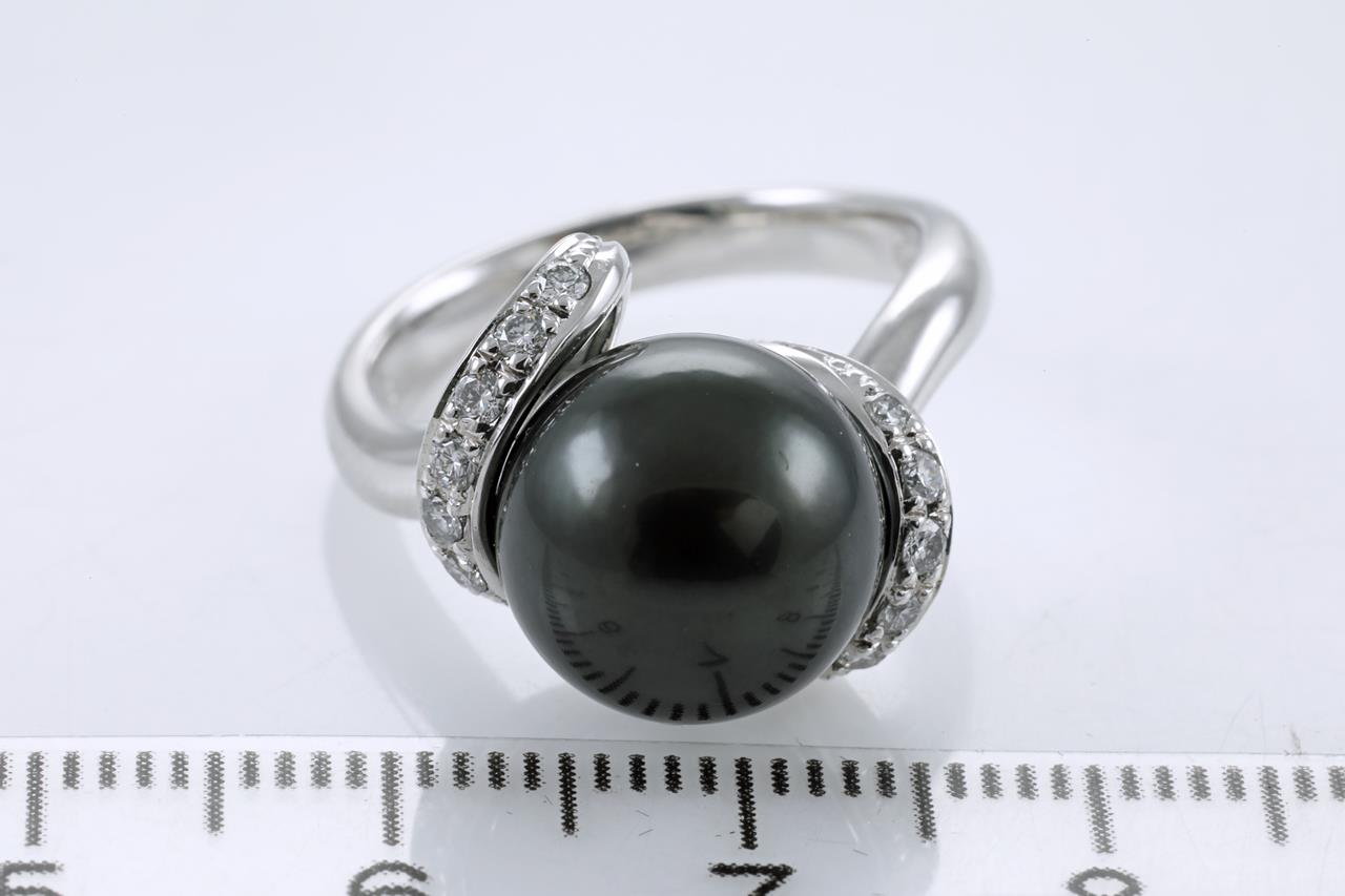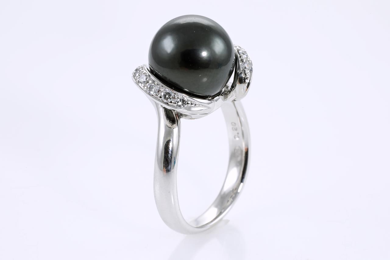 Pearl and Diamond ring with a Tahitian pearl of 11mm and Diamonds totalling 0.20cts. Platinum. Ring size L1/2. Weight: 10.2g (Pre-owned)