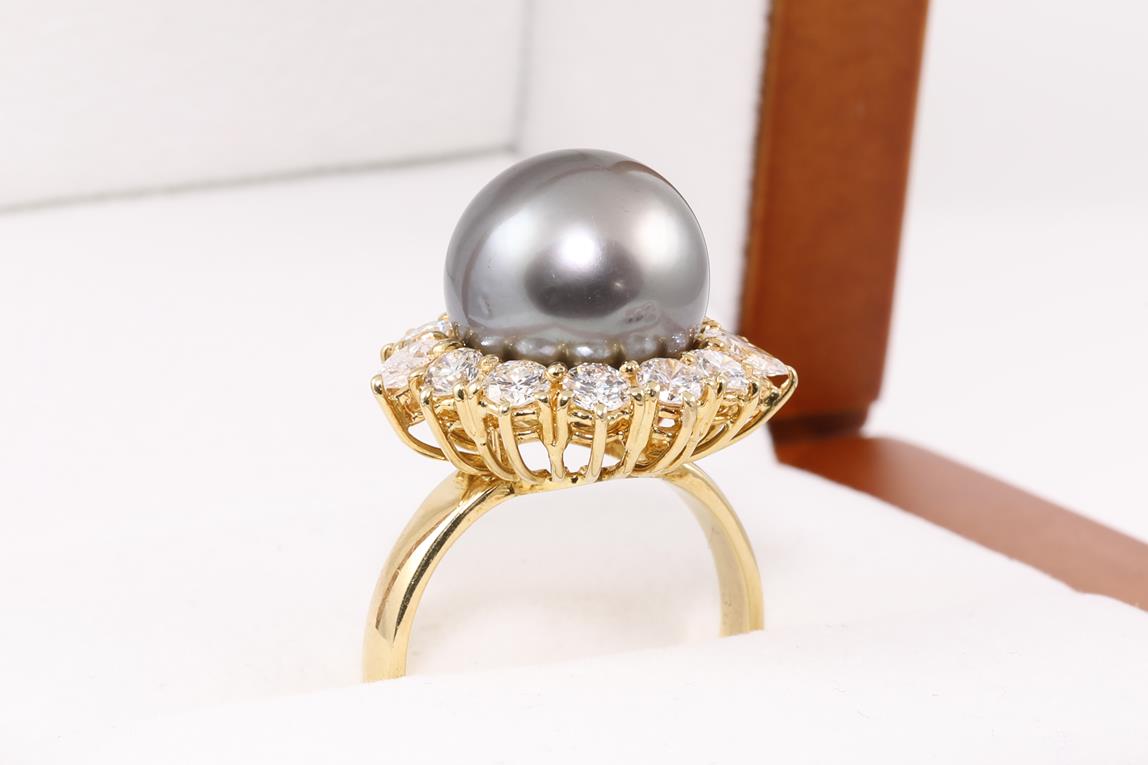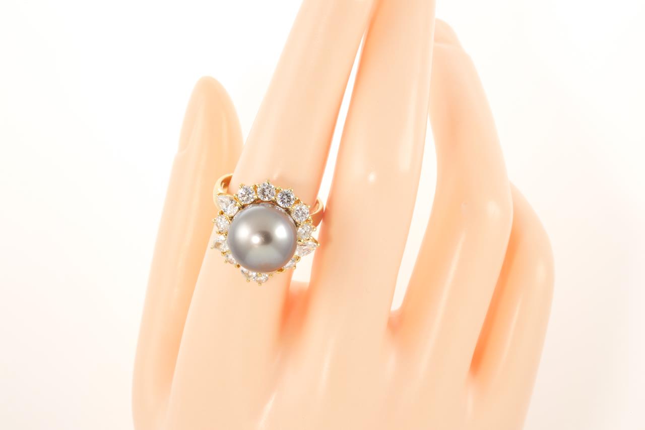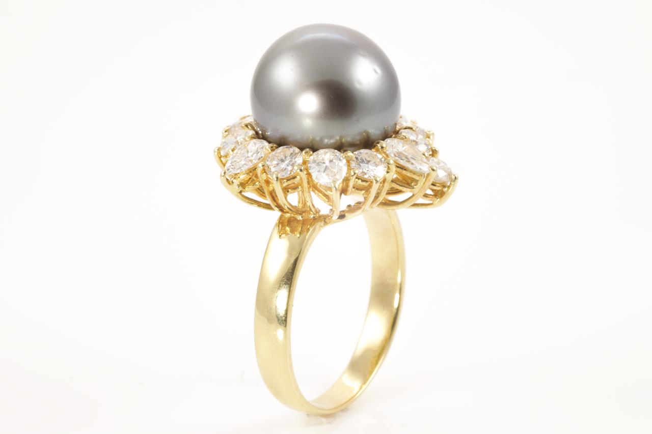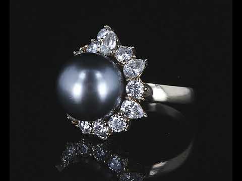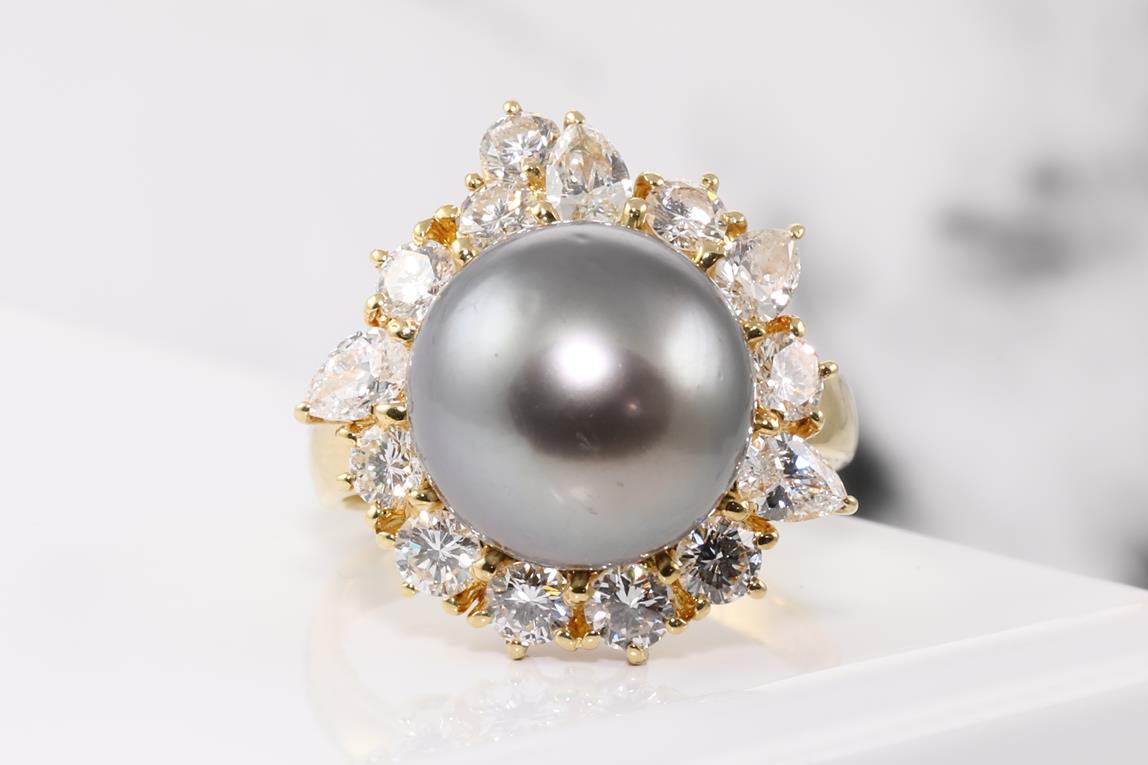 Pearl and Diamond ring with a Tahitian Pearl of 12.5mm with round and marquise cut Diamonds totalling 1.36cts (Estimated grading: H VS-SI). 18ct yellow gold. Ring size P1/2. Weight: 9.8g (Pre-owned)
