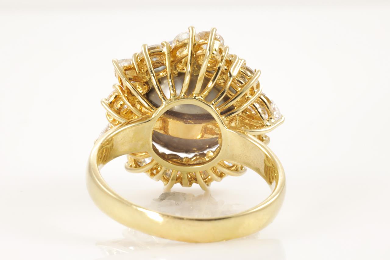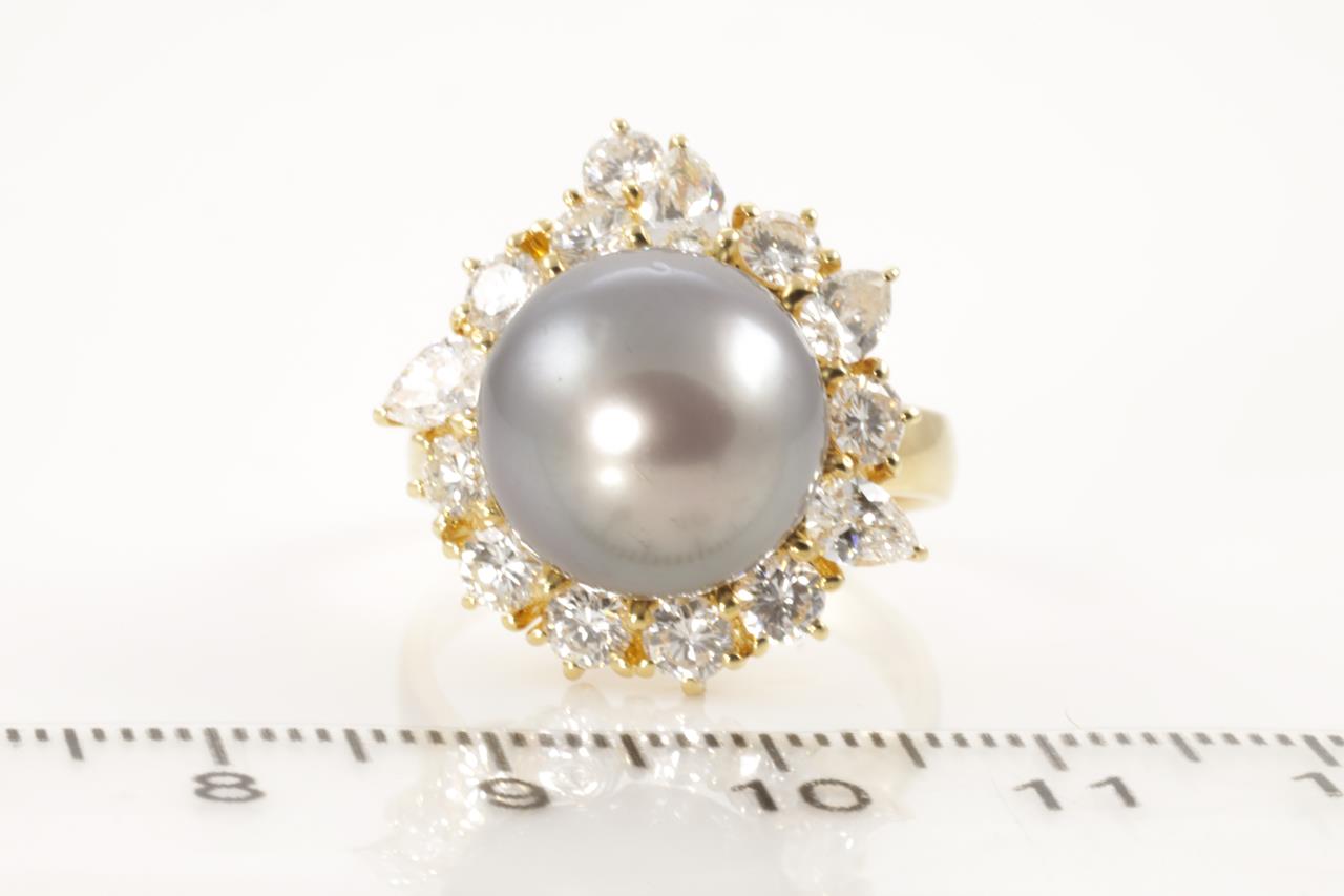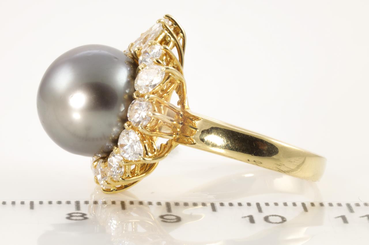 Pearl and Diamond ring with a Tahitian Pearl of 12.5mm with round and marquise cut Diamonds totalling 1.36cts (Estimated grading: H VS-SI). 18ct yellow gold. Ring size P1/2. Weight: 9.8g (Pre-owned)