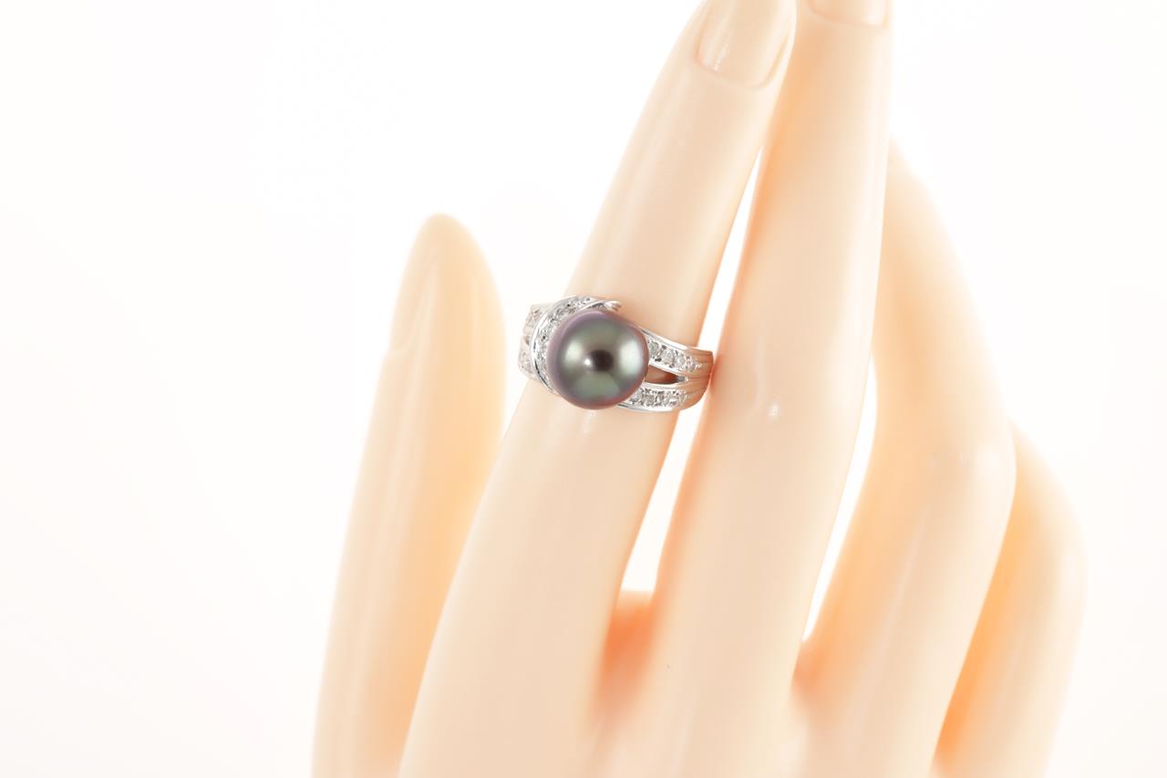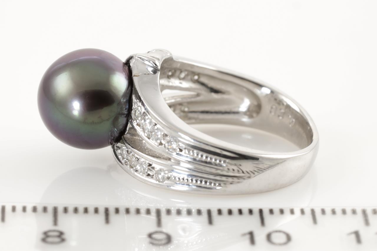 Pearl and Diamond ring with Tahitian Pearl of 10.5mm and round cut Diamonds totalling 0.28cts. Platinum. Ring size K 1/2. Weight: 10.3g (Pre-owned)