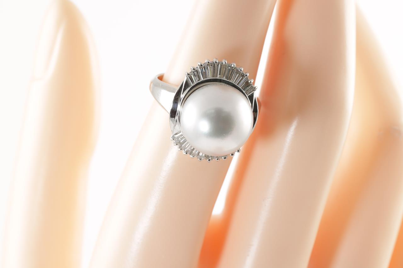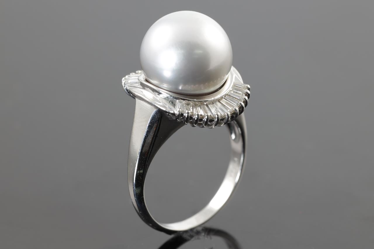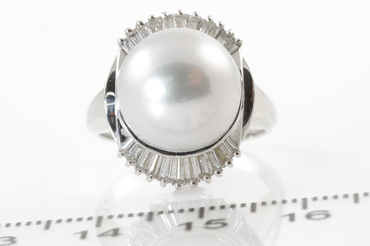 Pearl and Diamond ring with a silver Tahitian Pearl of 12.2mm and baguette Diamonds totalling 0.72cts (Estimated grading: H SI). Platinum. Ring size L1/2. Weight: 11.2g. (Pre-owned)