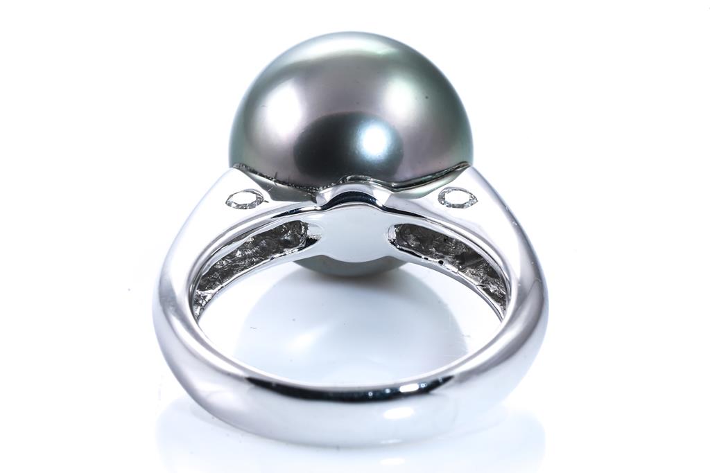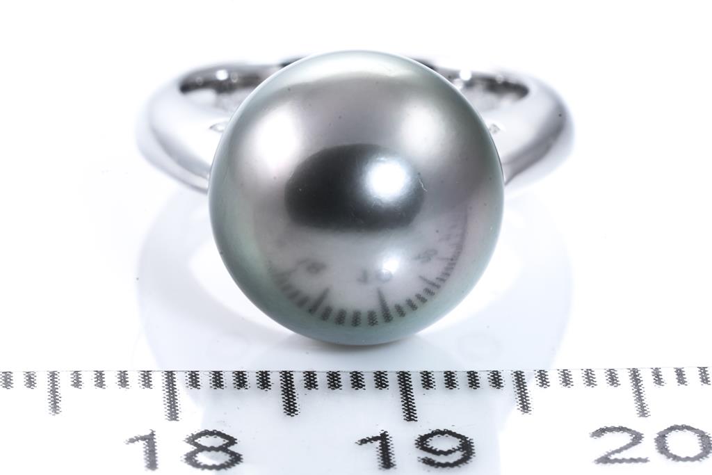 Pearl and Diamond ring with Tahitian Pearl of 12.5mm and Diamonds totalling 0.16cts. Platinum. Ring size: I - ring resizing is not recommended. Weight: 9.3g. (Pre-owned)