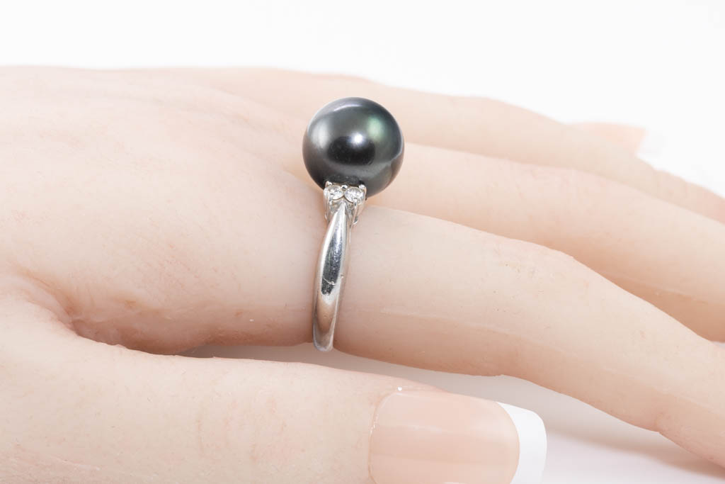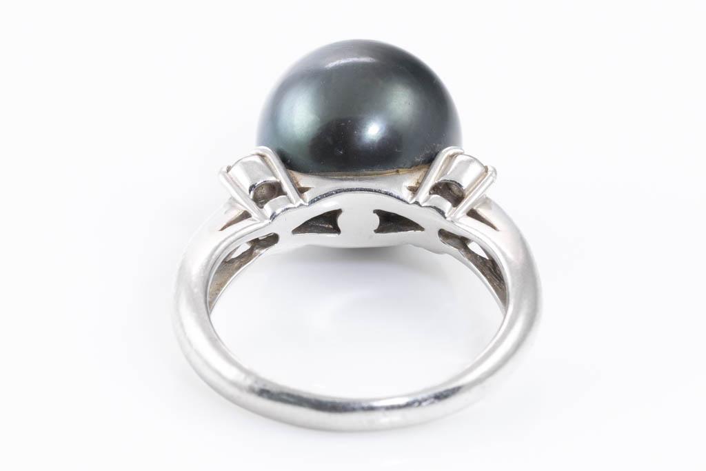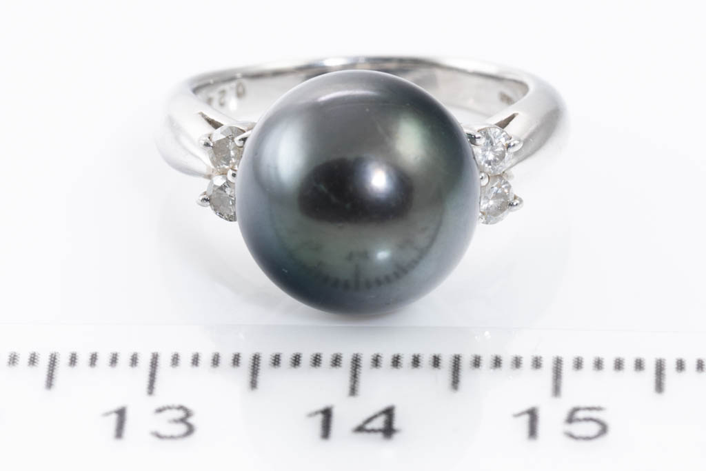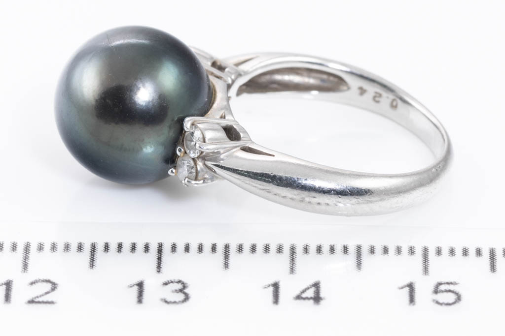 Tahitian Pearl and Diamond Ring with Tahitian Pearl of 12mm and round Diamonds totalling 0.24cts. Platinum. Ring size M. Weight: 8.7g. (Pre-owned)