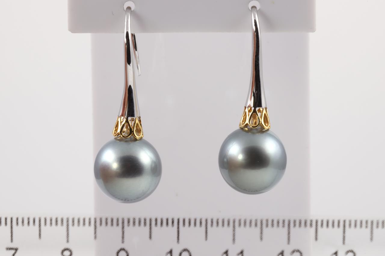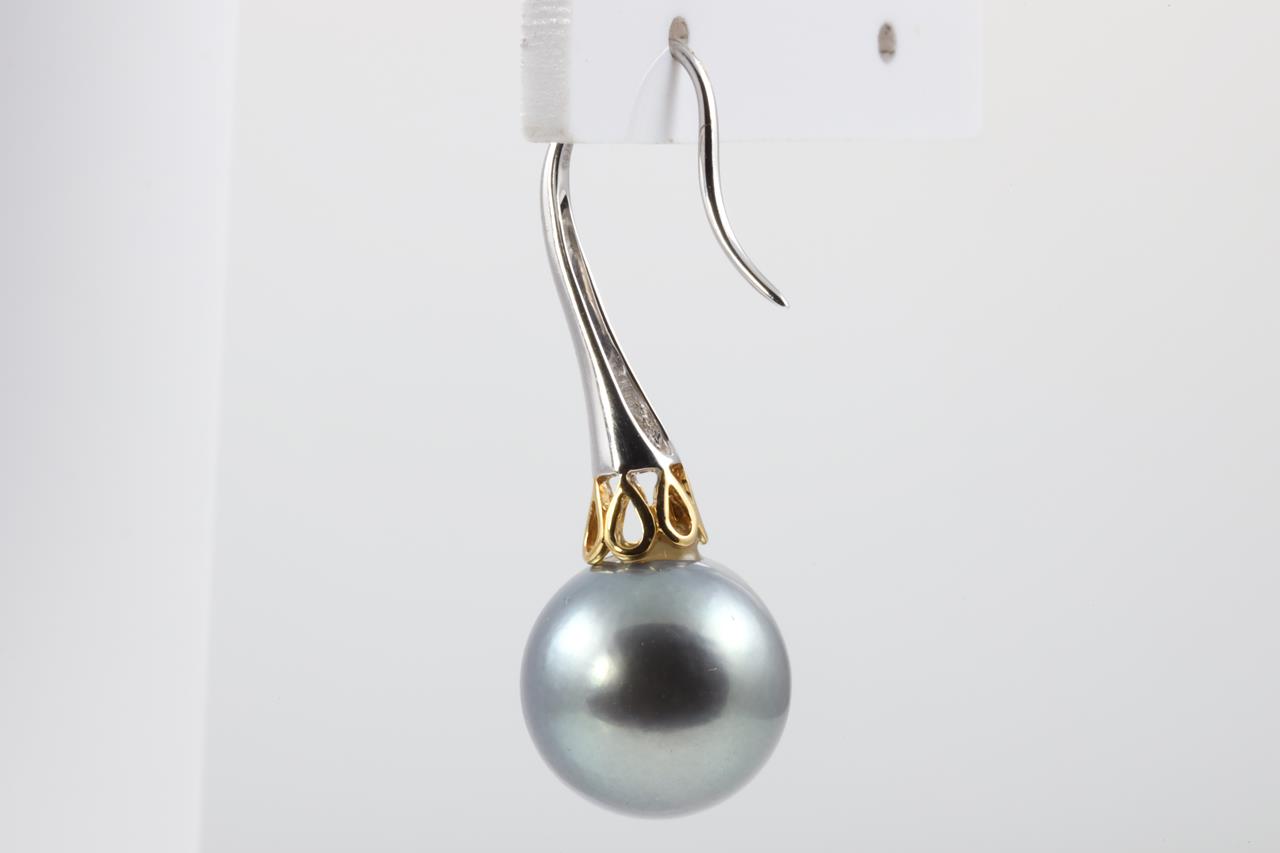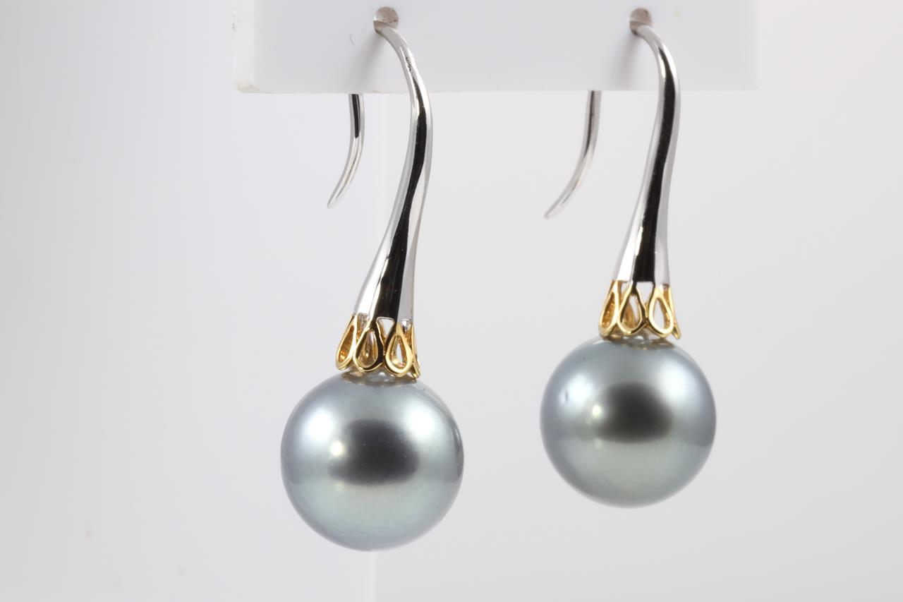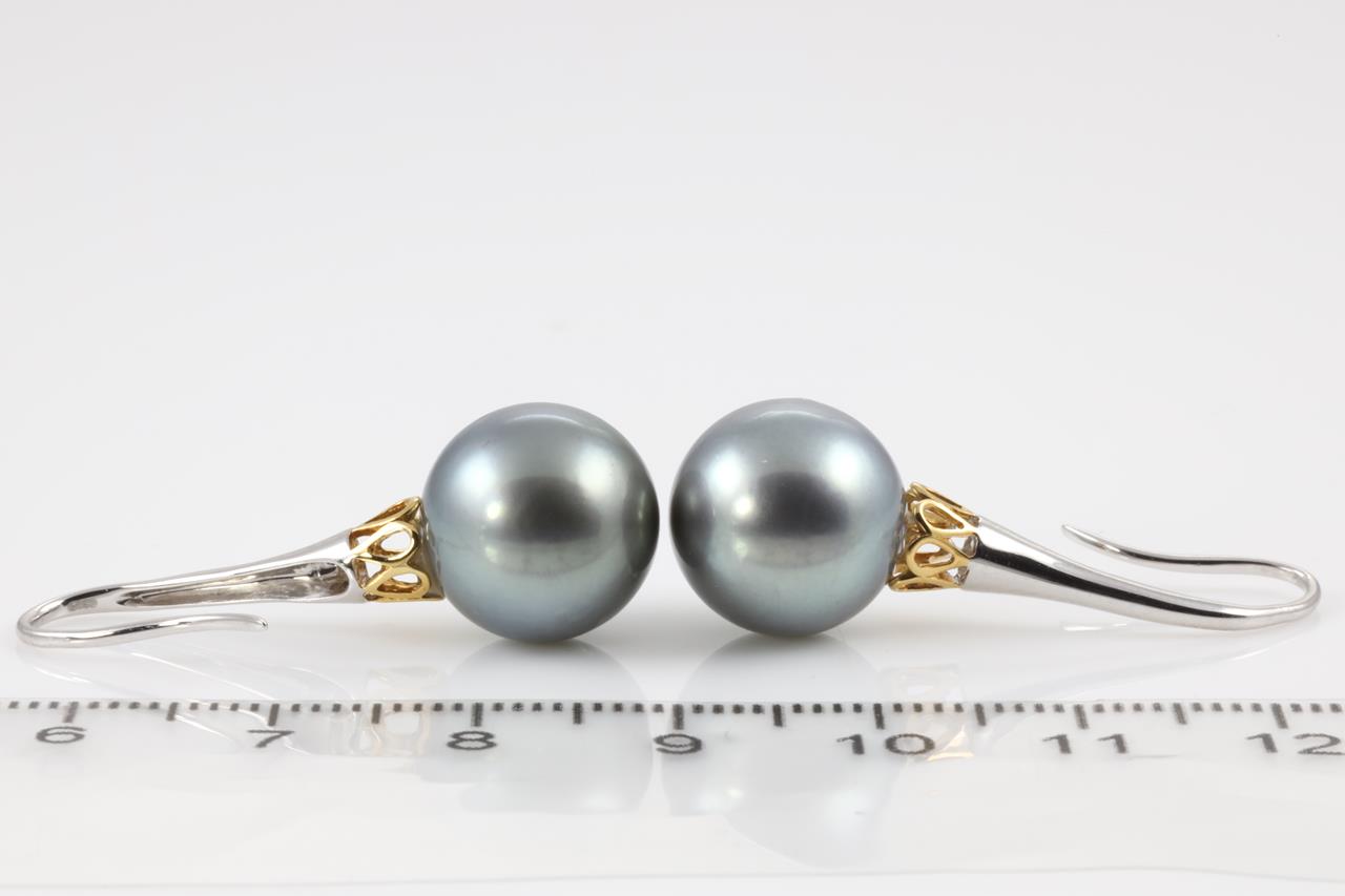 Pearl shepherds hook earrings with Tahitian pearls of 12.3mm. 18ct yellow & white gold. Weight: 7.5g. (Pre-owned)