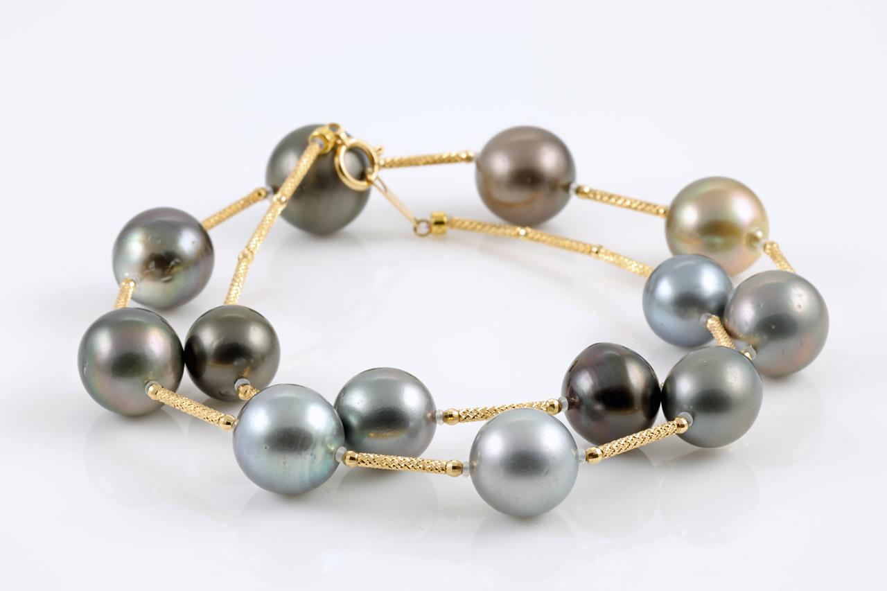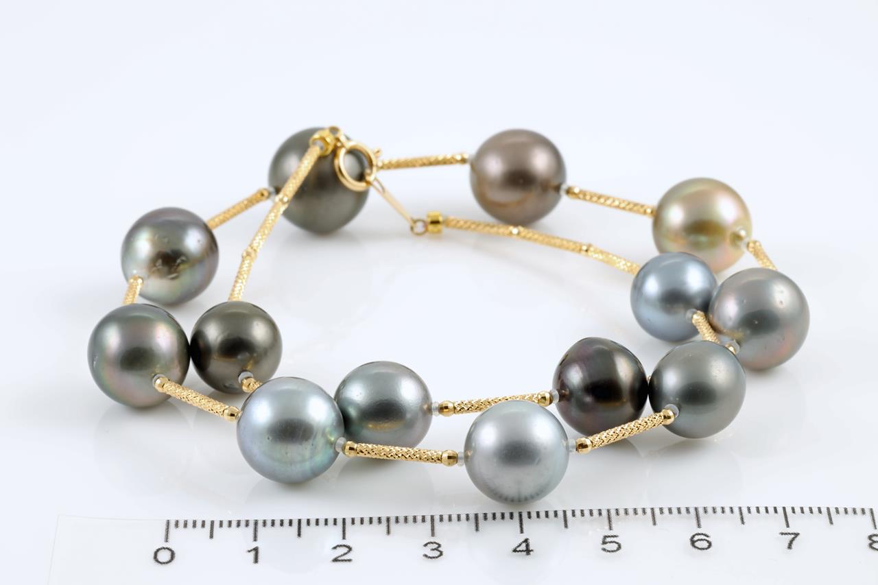 Pearl necklace with 13 graduated Tahitian pearls of 14.0mm-11.0mm. 18ct yellow gold. Weight: 37.0g. Length: 43.5cm. (Pre-owned)