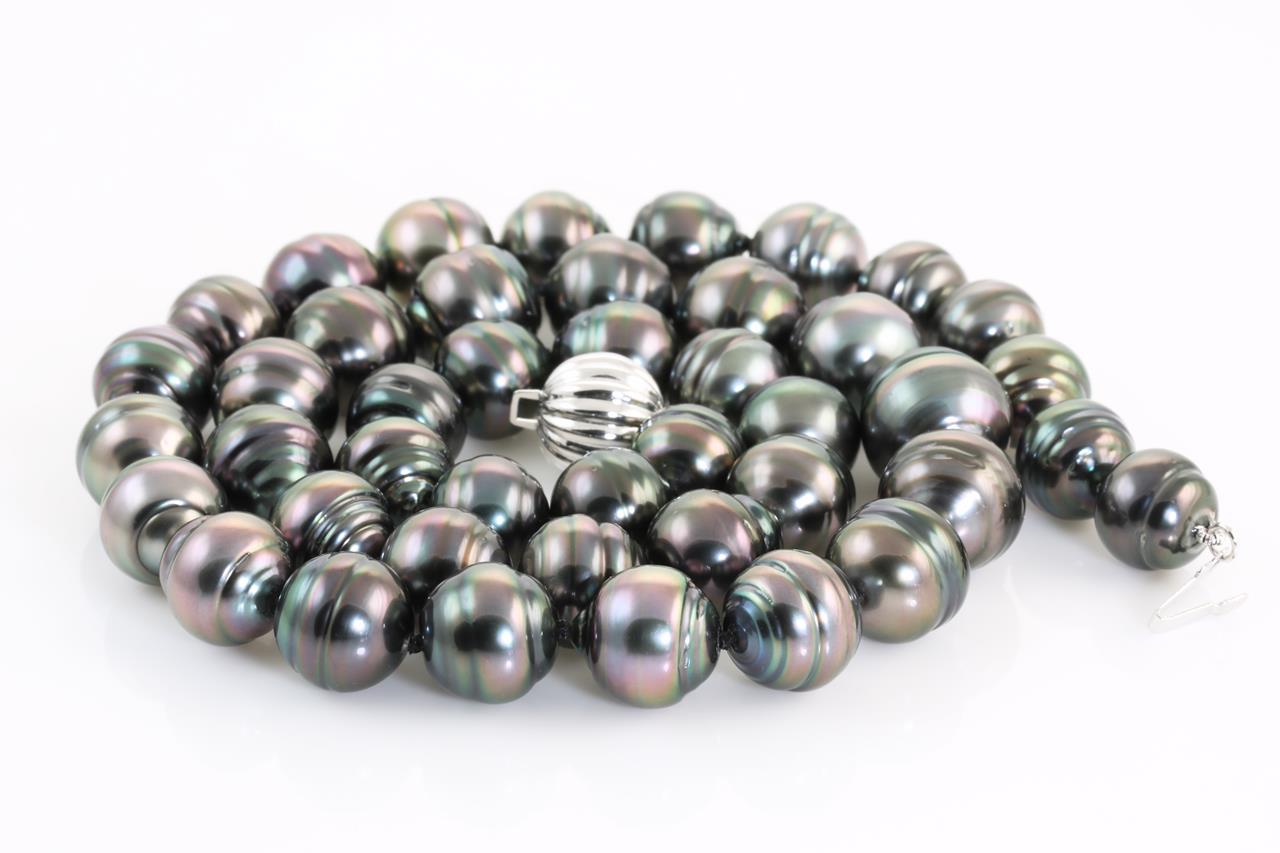 Pearl necklace with 43 Tahitian pearls of 9.0mm-11.5mm. With 9ct white gold clasp. Length: 46.5cm. Weight: 54.9g. (New)