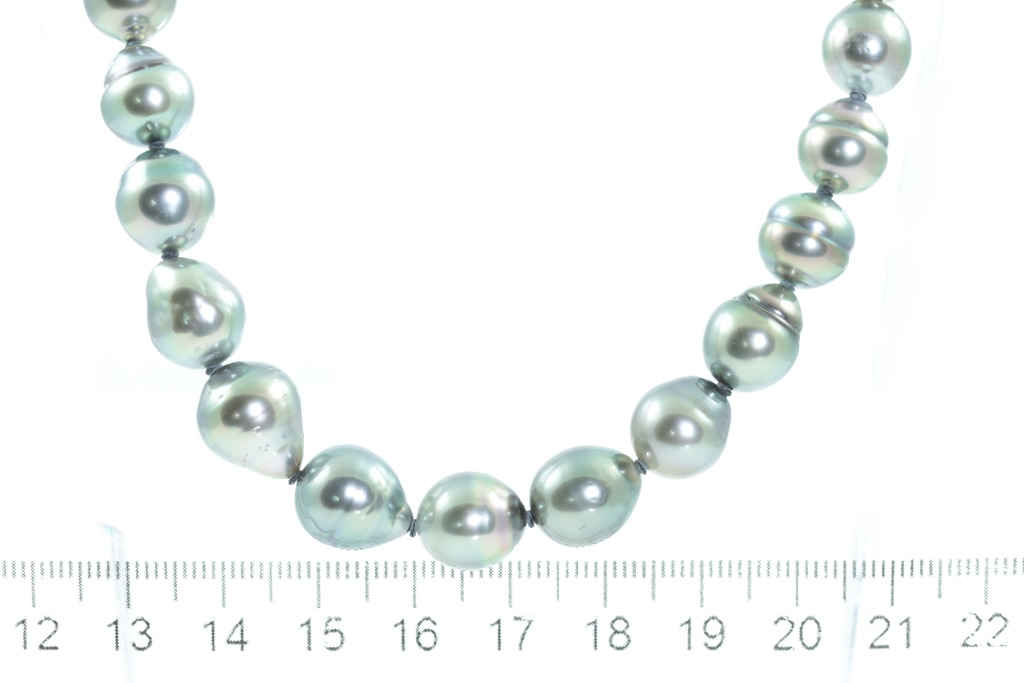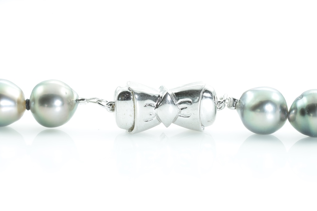 Pearl necklace with Tahitian Pearls of 8mm - 11.2mm. 14ct white gold clasp with 2 round Diamonds totalling approximately 0.02cts. Length: 46cm. Weight: 54.9g. (Pre-owned)