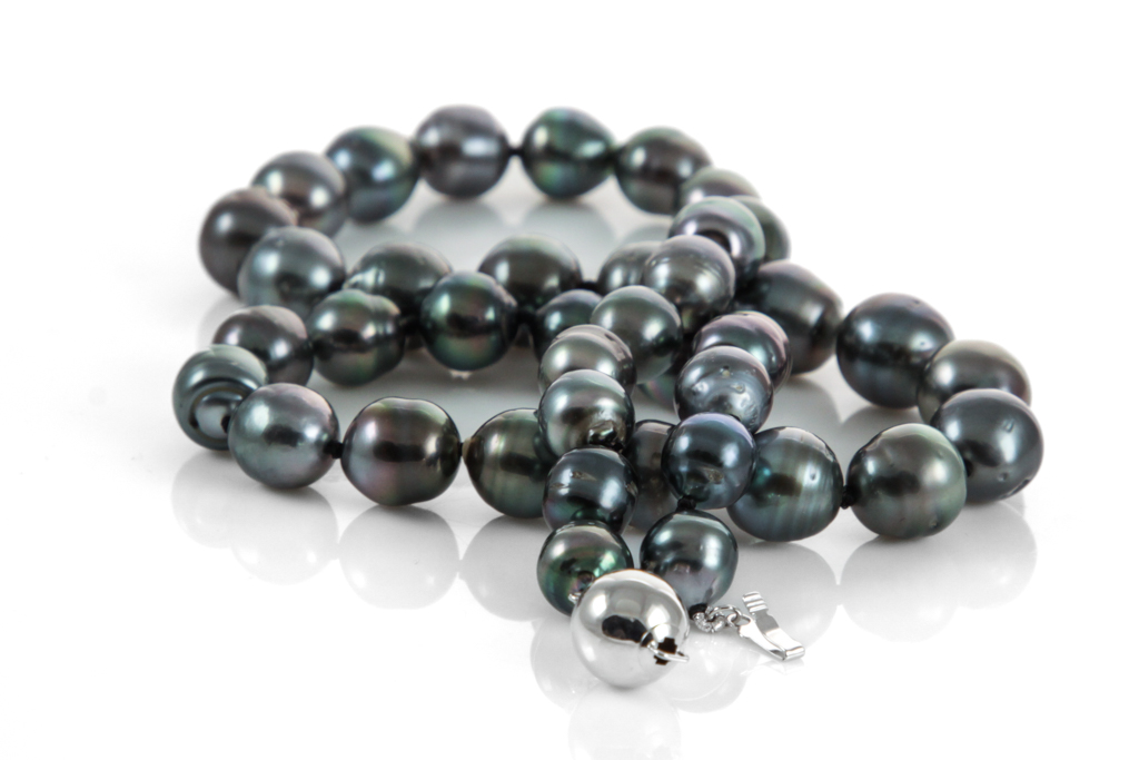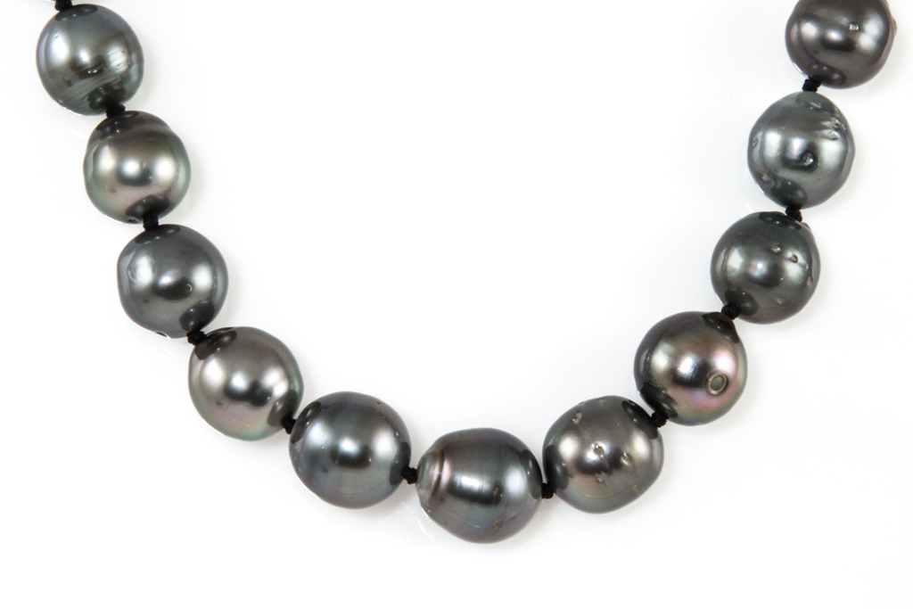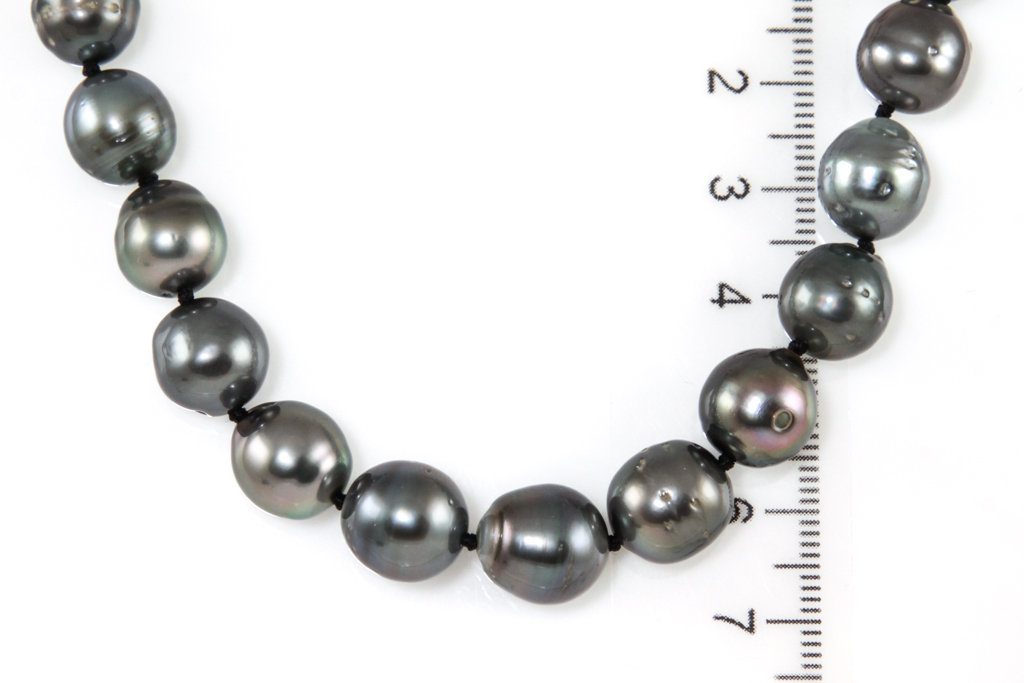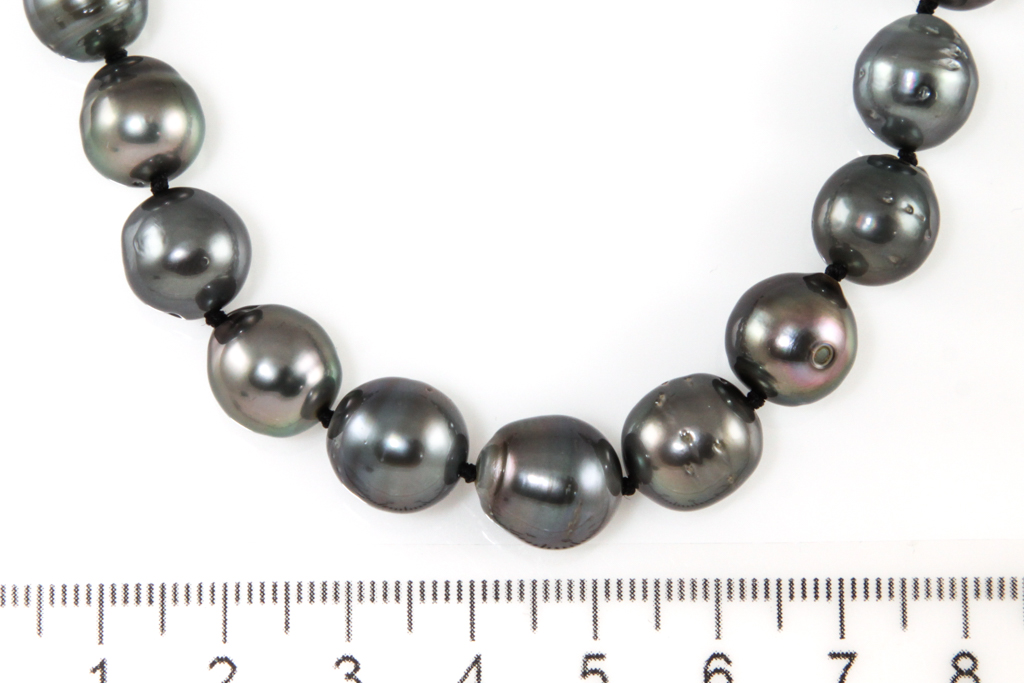 Tahitian Pearl necklace with 41 graduated oval & drop shape Tahitian Pearl of 10.8-8.2mm. 14ct white gold ball clasp. Length: 48cm. Weight: 53.8g. (As new).