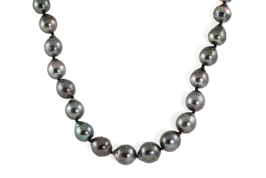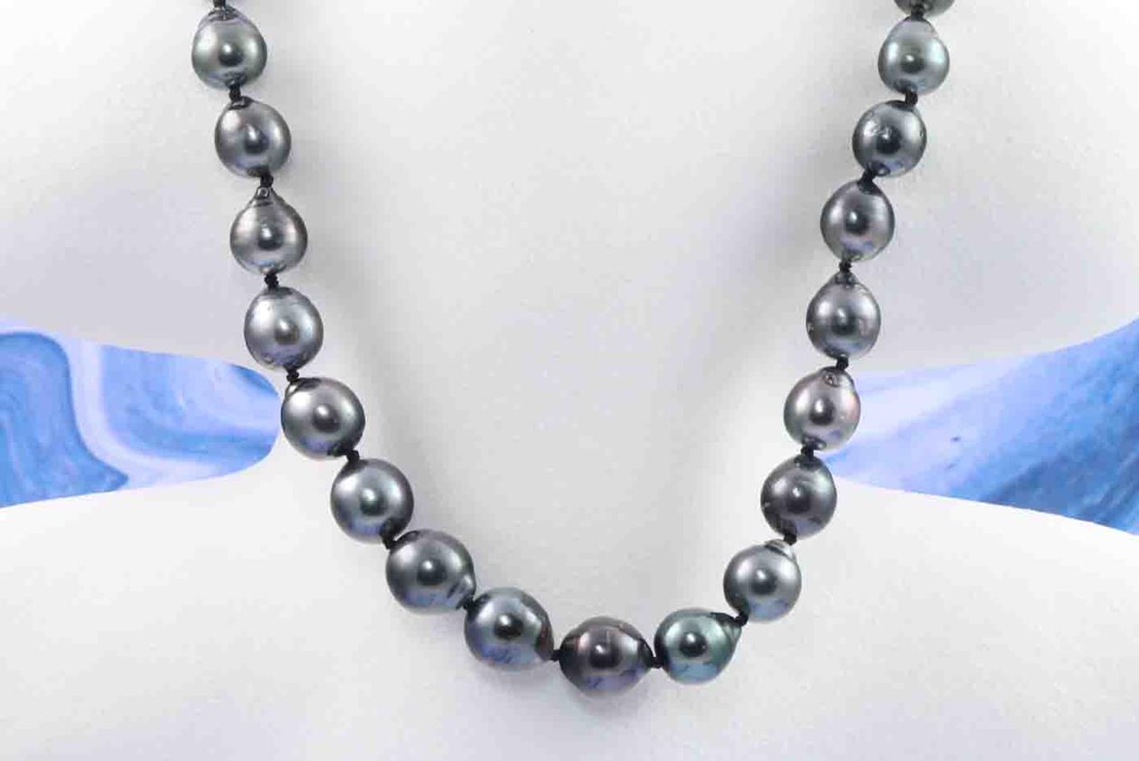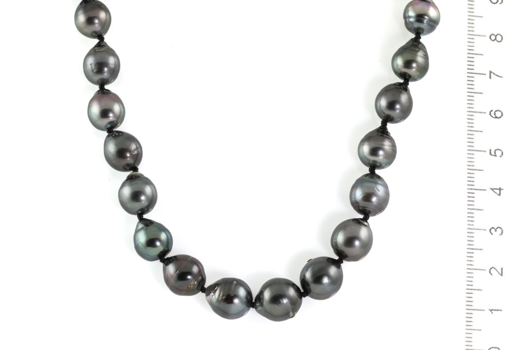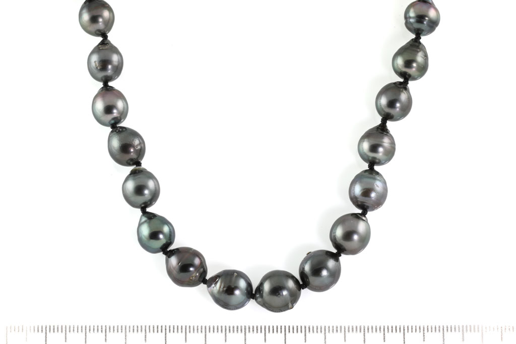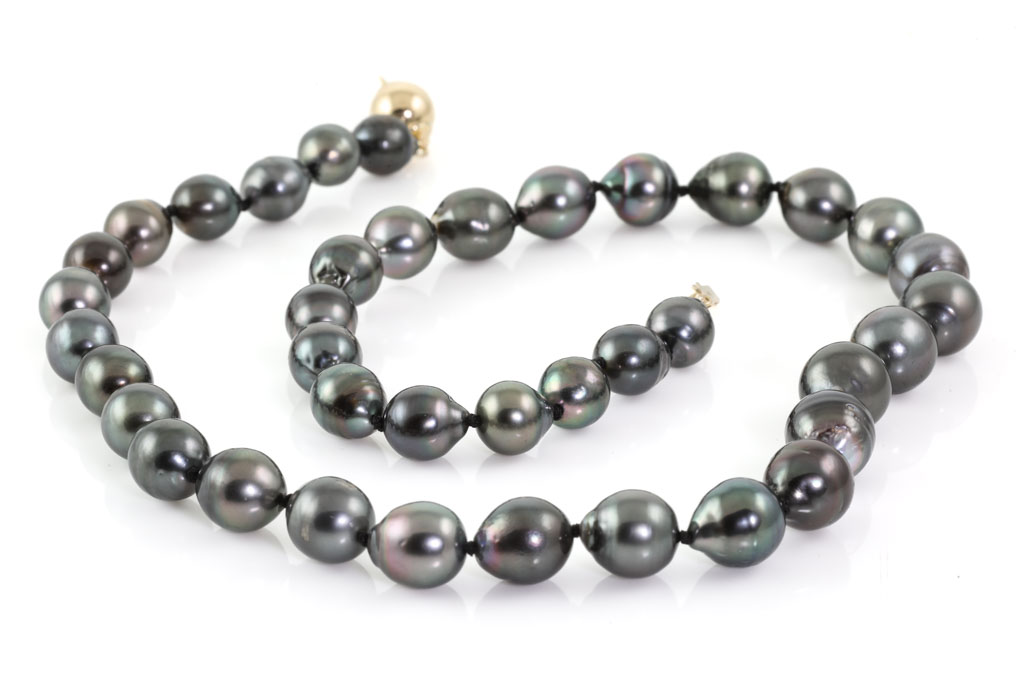 Tahitian Pearl necklace with 39 graduated drop shape Tahitian Pearl of 10.7-8.2mm. 14ct yellow gold ball clasp. Length: 46.5cm. Weight: 46.1g. (As new).