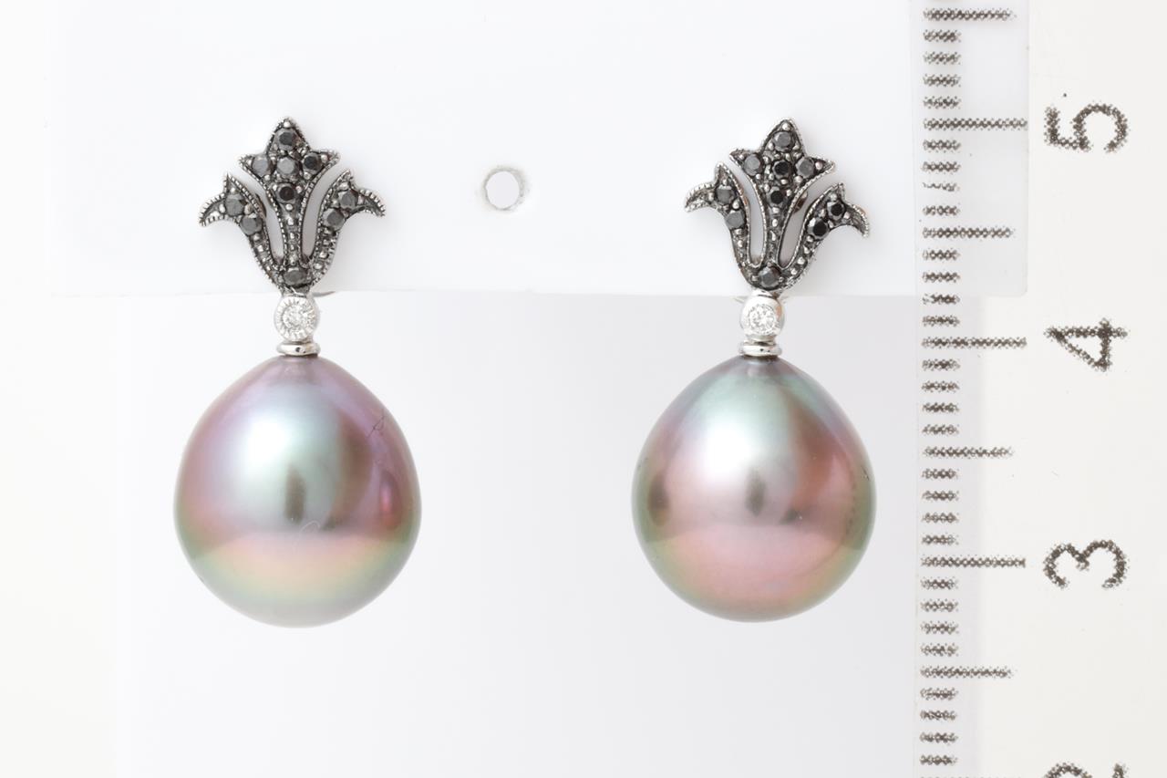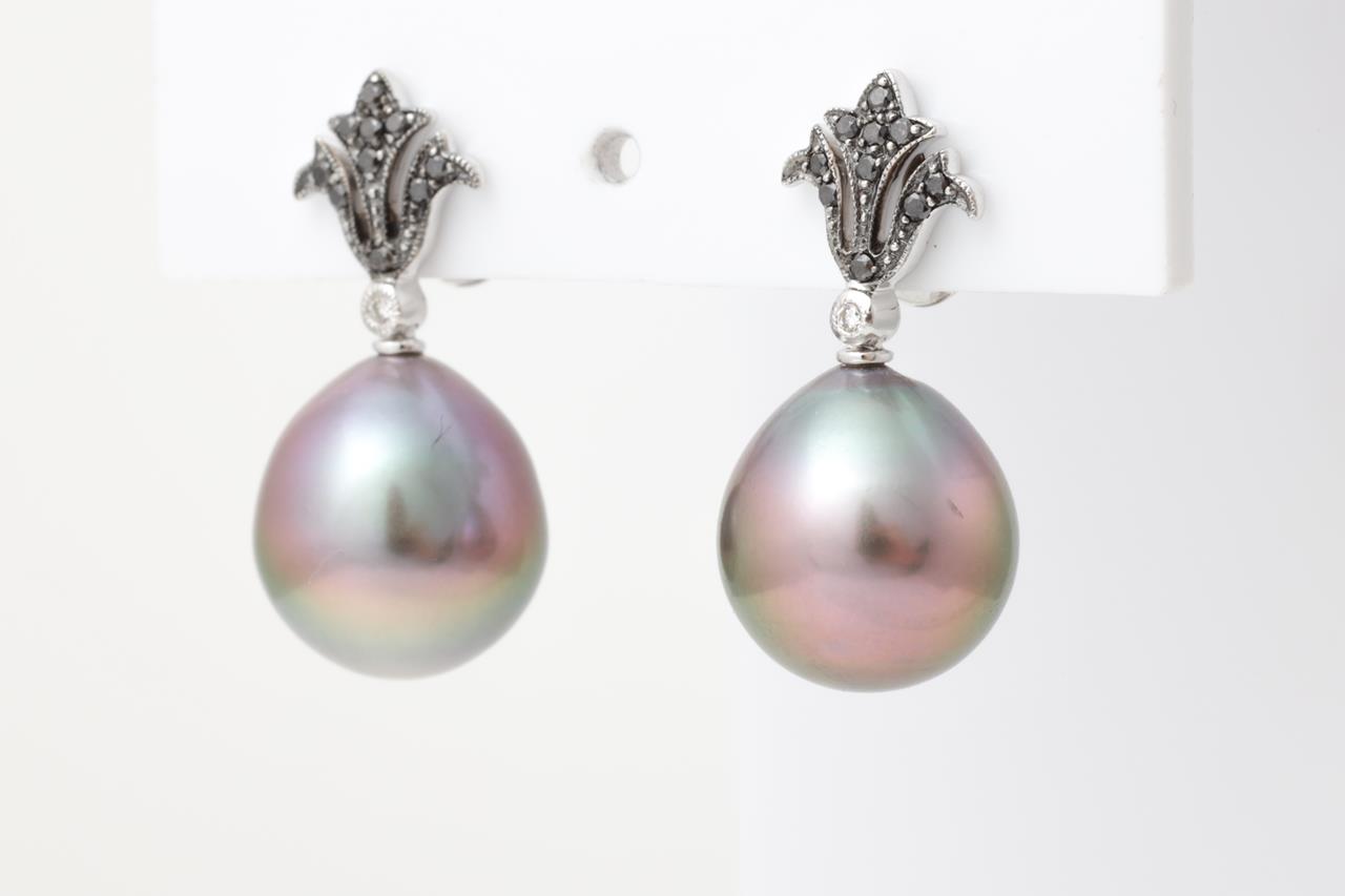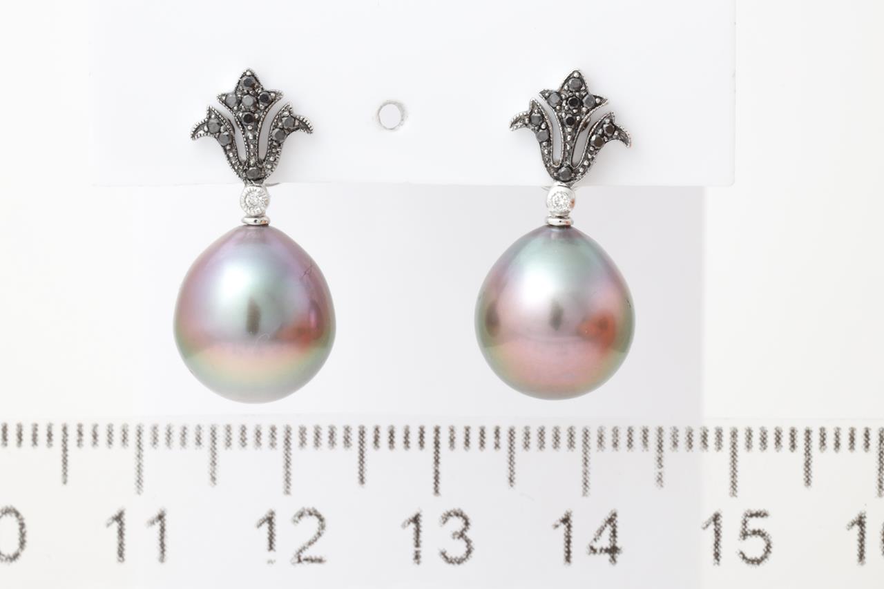 Pearl Earrings with drop shaped Tahitian Pearls of 11mm and round Black and white Diamonds totalling approximately 0.20cts. 18ct white gold. Weight 8.2g. (As New)