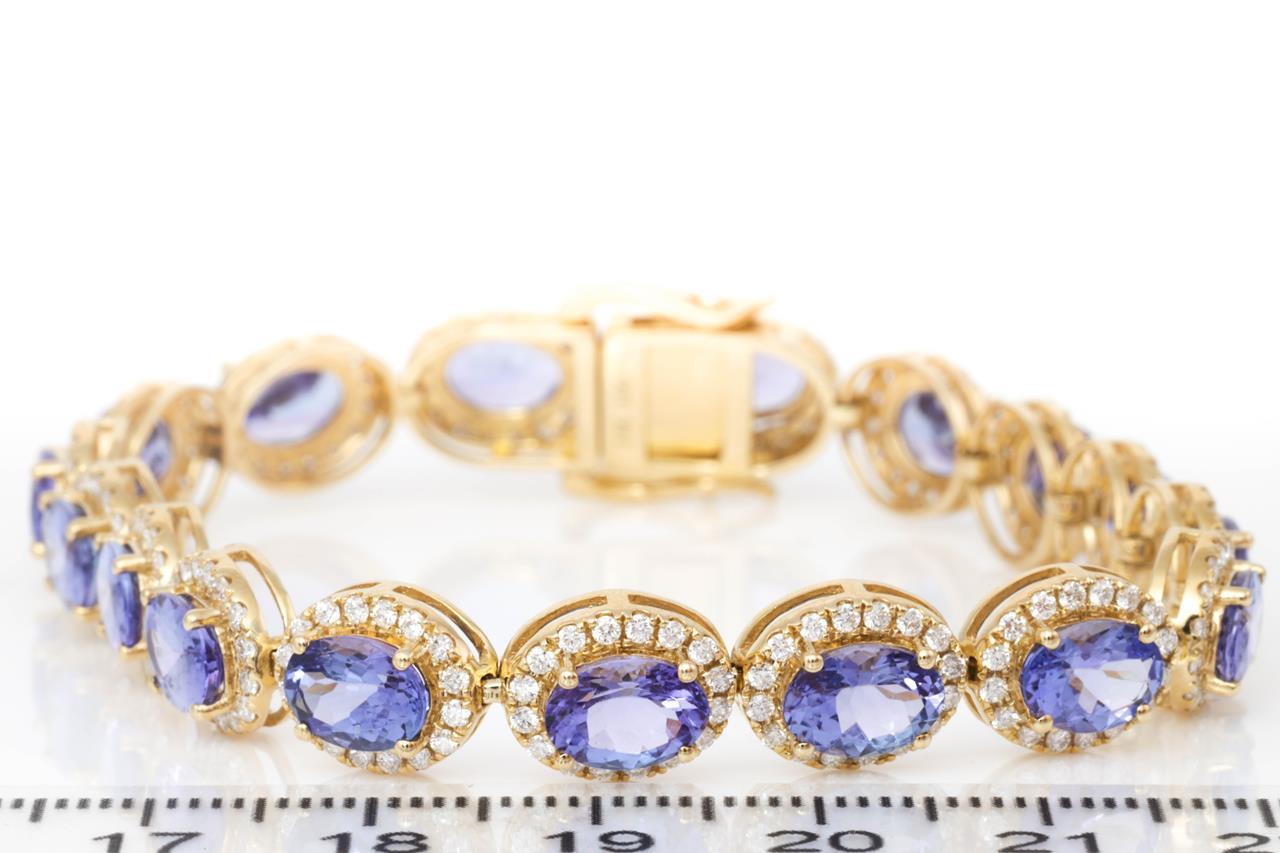 Tanzanite and Diamond Bracelet with 17 centre oval shape Tanzanites totalling 16.14cts and Diamonds totalling 2.35ct (Estimated grading: G-H SI). 14ct yellow gold. Length: 18.5cm. Weight: 17.8g. With certificate #414852. (As new)