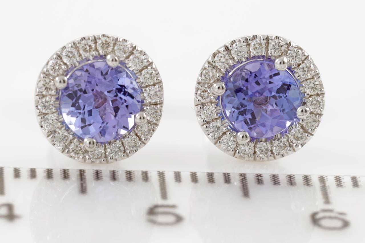 Tanzanite and Diamond earrings with round Tanzanite totalling 1.07cts and Diamonds totalling 0.17cts. 18ct white gold. Weight: 2.1g. (New)