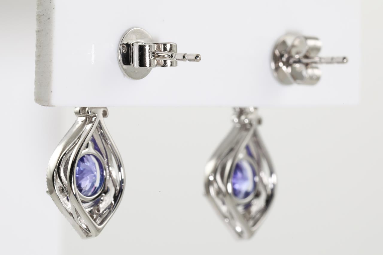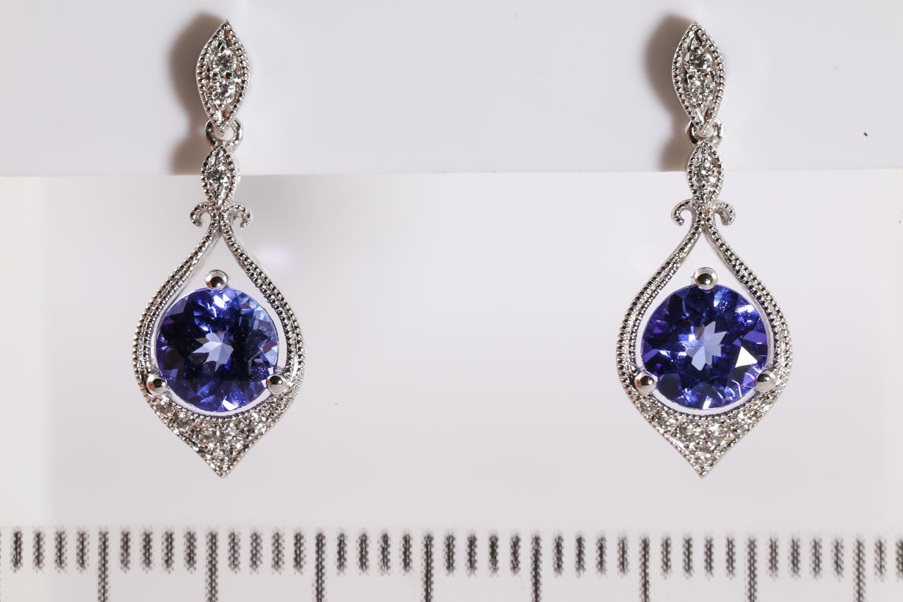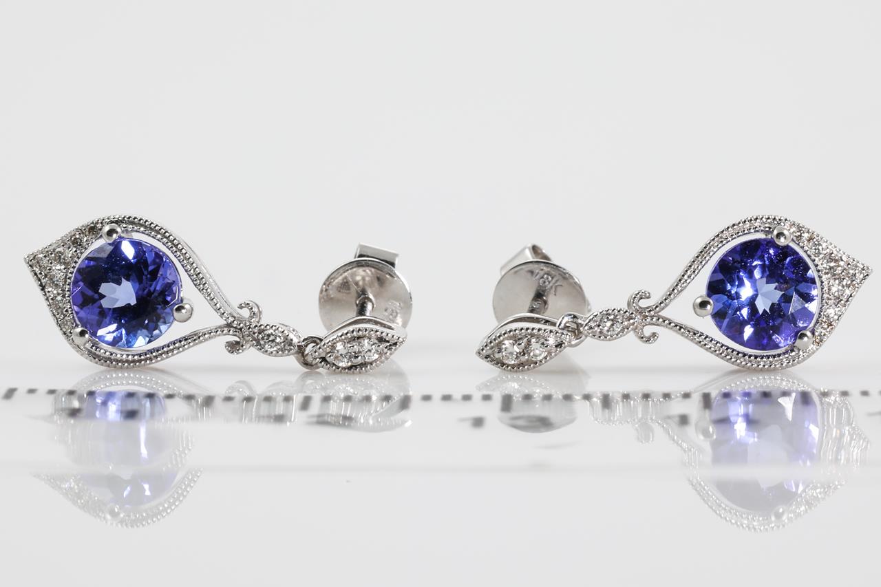 Tanzanite and Diamond earrings with round Tanzanite totalling 1.46cts and Diamonds totalling 0.12cts. 18ct white gold. Weight: 3.1g. (New)