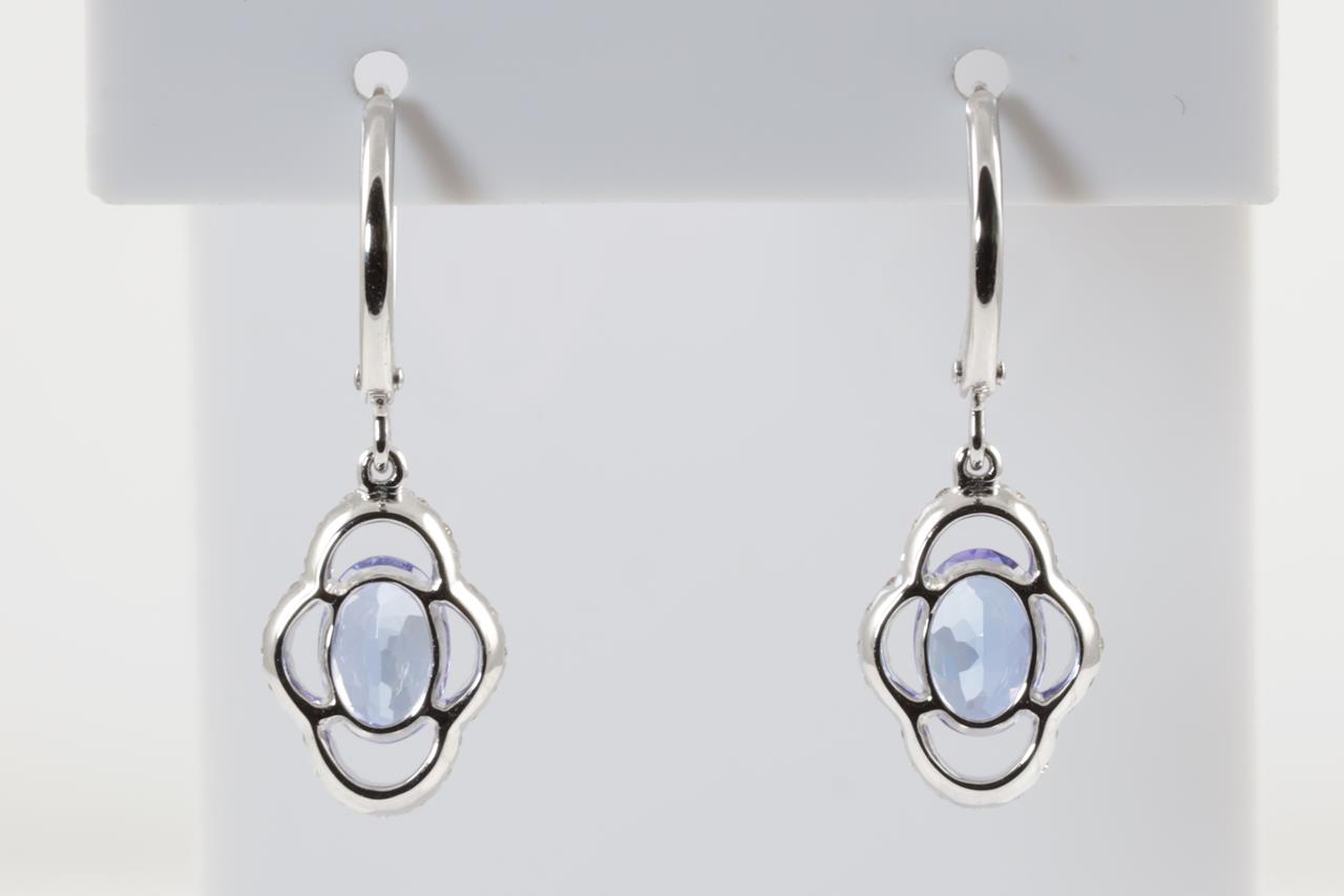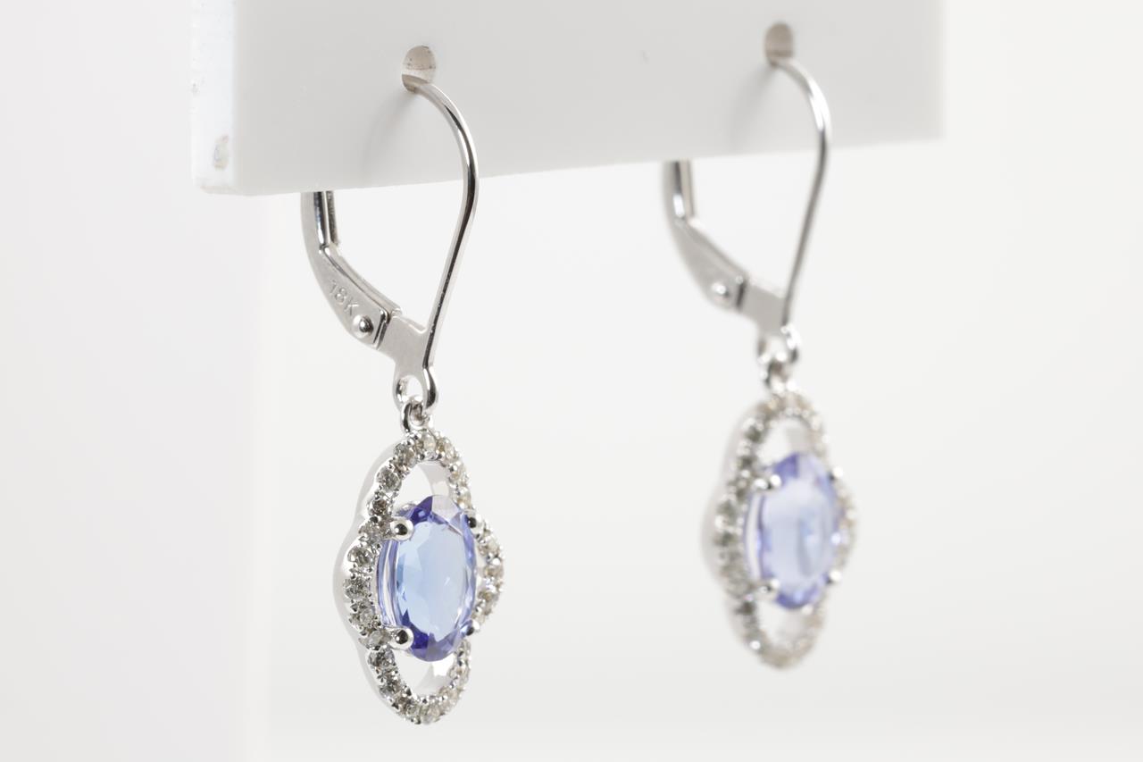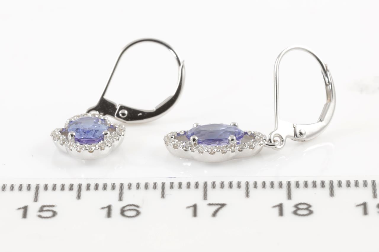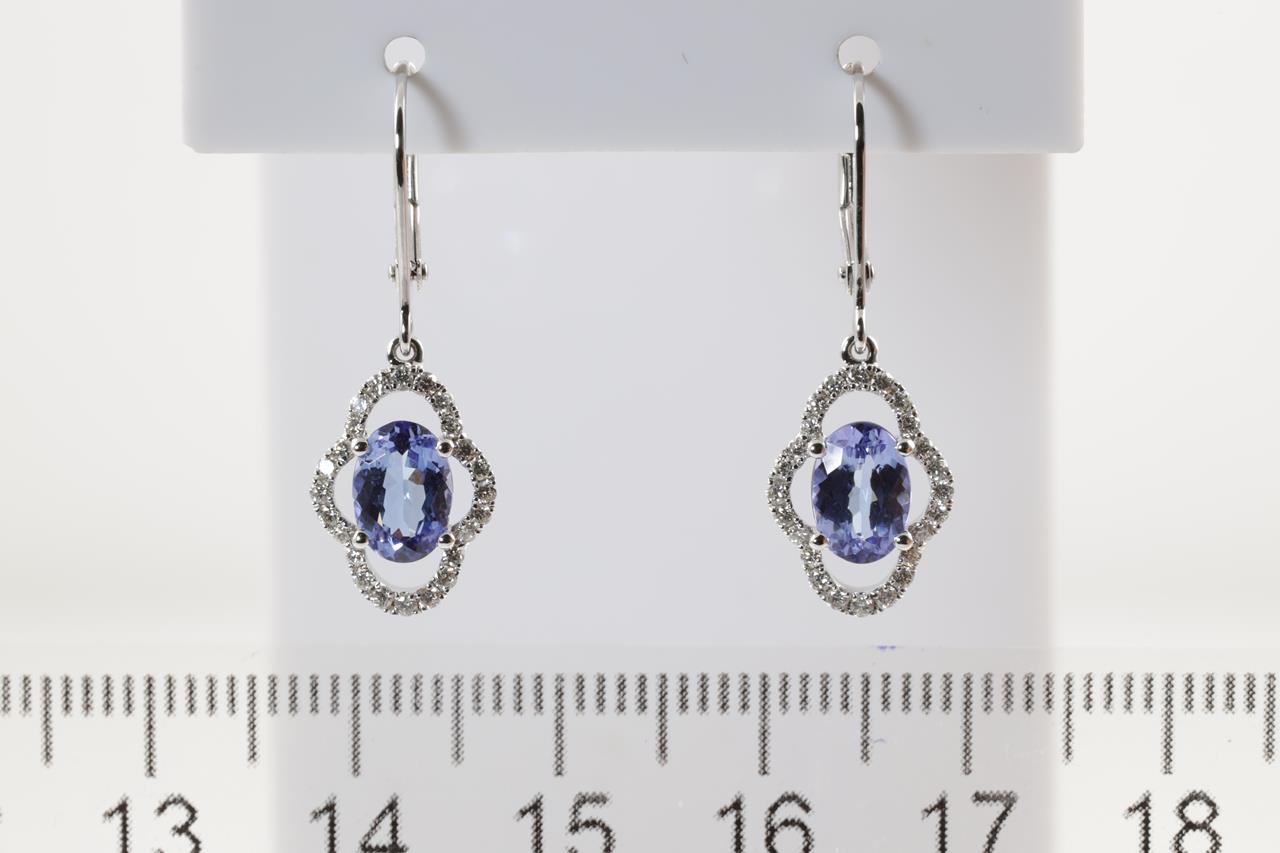 Tanzanite and Diamond leverback earrings with oval shape Tanzanite totalling 1.57cts and Diamonds totalling 0.31cts (Estimated grading: H SI). 18ct white gold. Weight: 2.4g. (New)