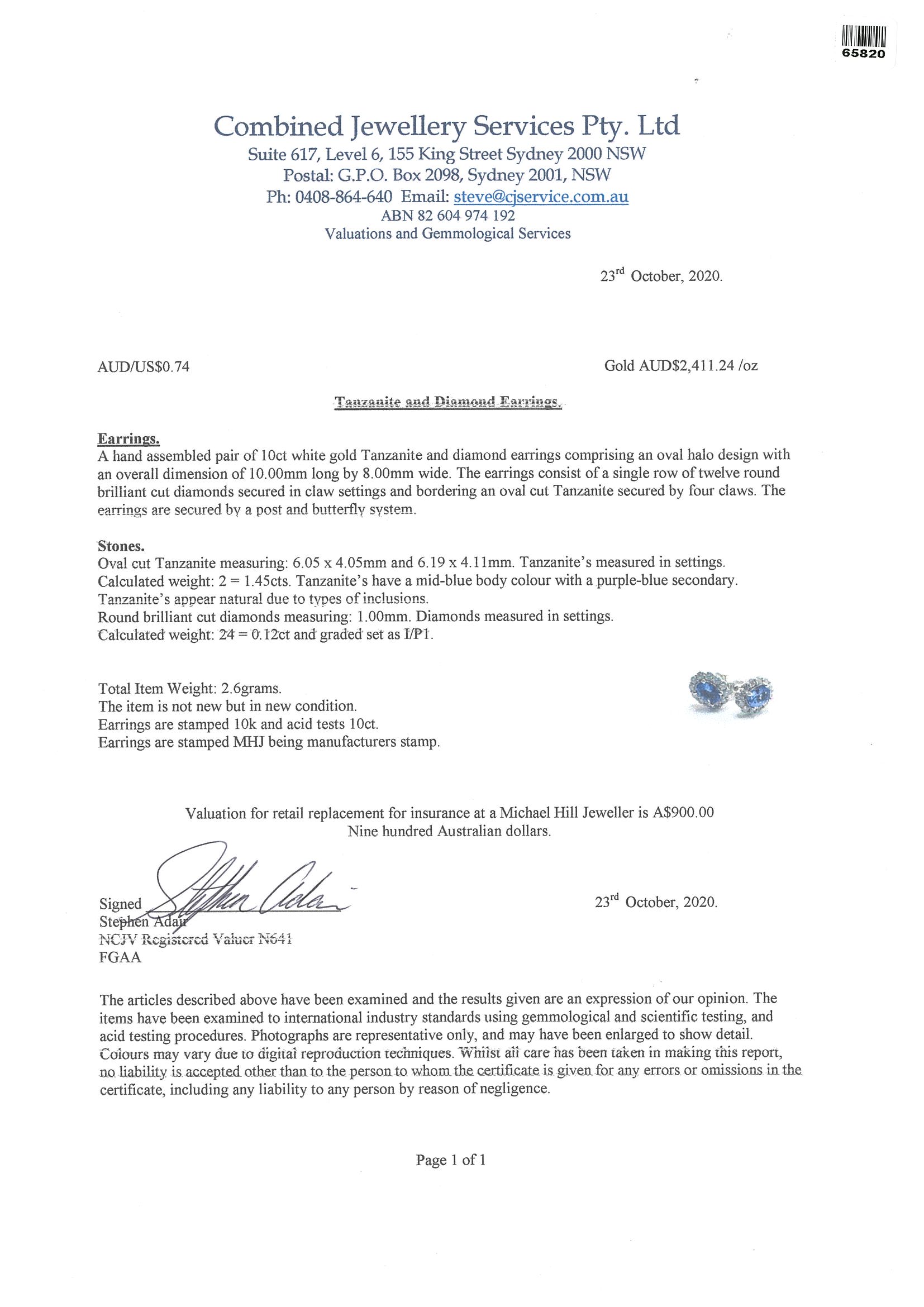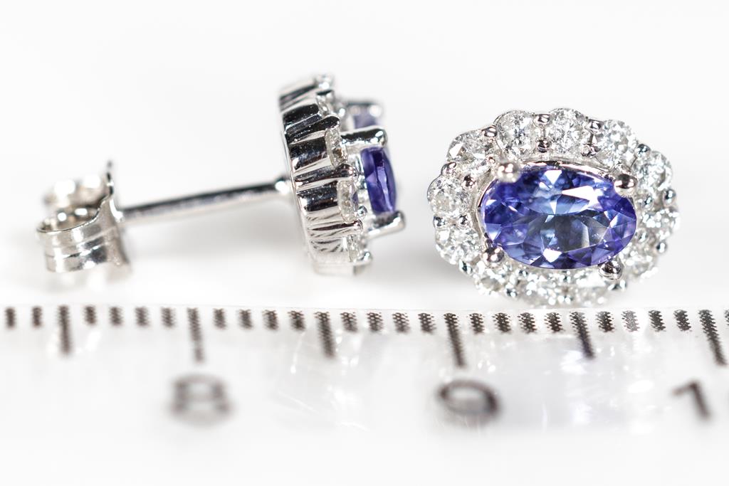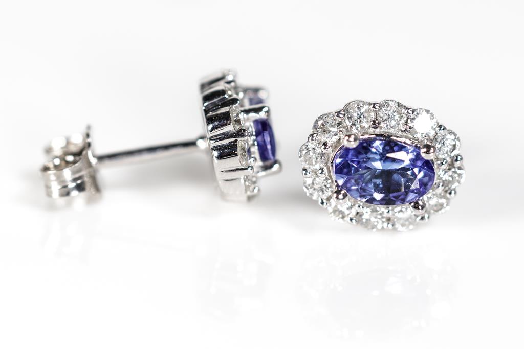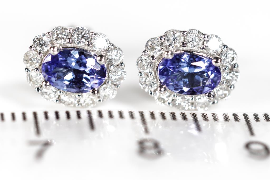 Tanzanite and Diamond Earrings with oval cut Tanzanites totalling approximately 1.45cts and round Diamonds totalling 0.12cts. 10ct white gold. Weight 2.6g. With valuation. (Pre-owned)
