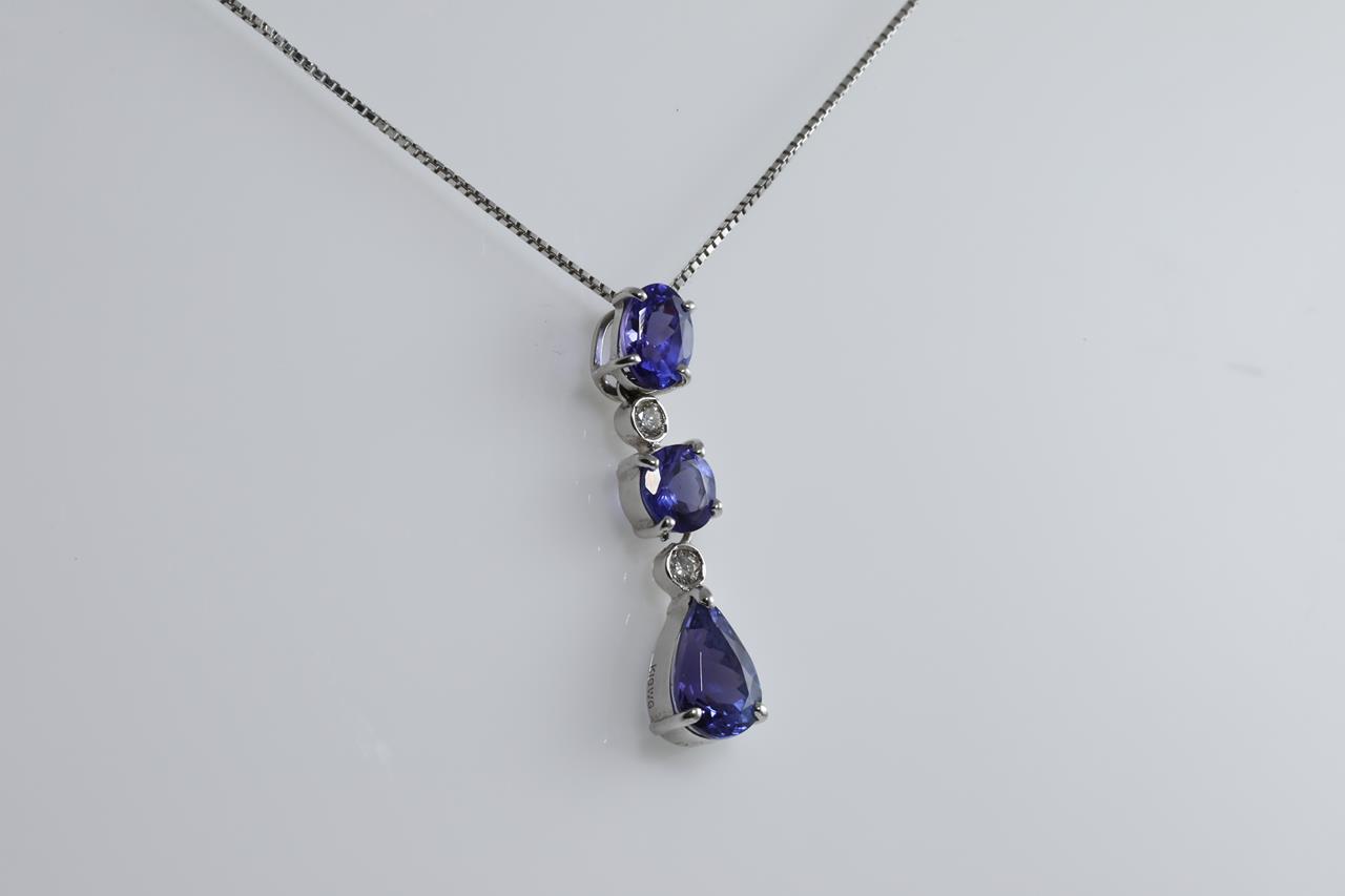 Tanzanite and Diamond pendant with oval, round & pear shape Tanzanites totalling 2.84cts and Diamonds totalling 0.08cts. 18ct white gold with 18ct gold 44cm chain. Weight: 4g (Pre-owned)
