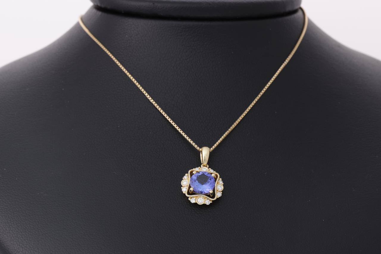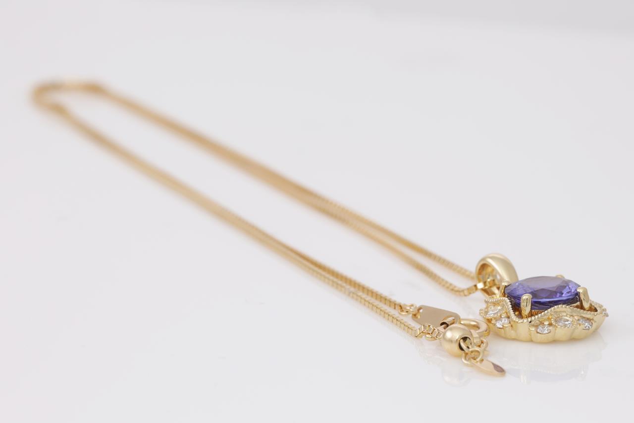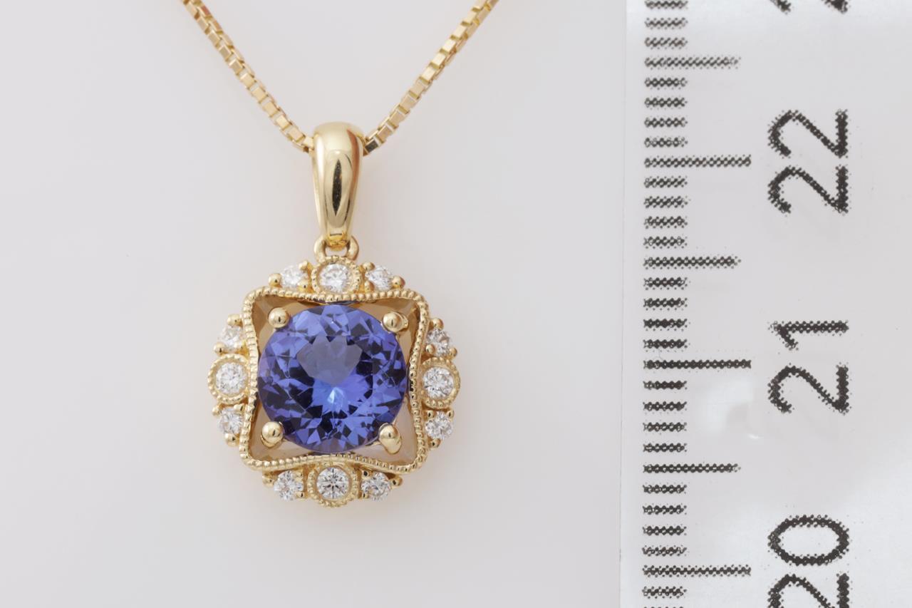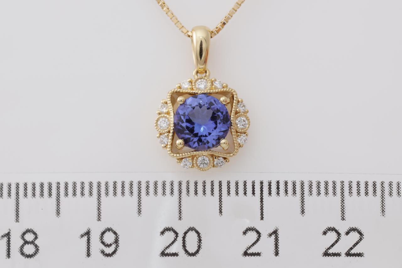 Tanzanite and Diamond pendant with a round Tanzanite of 1.21ct and Diamonds totalling 0.16cts. 18ct yellow gold with 18ct gold with 44cm adjustable chain. Weight: 4.3g. (New)