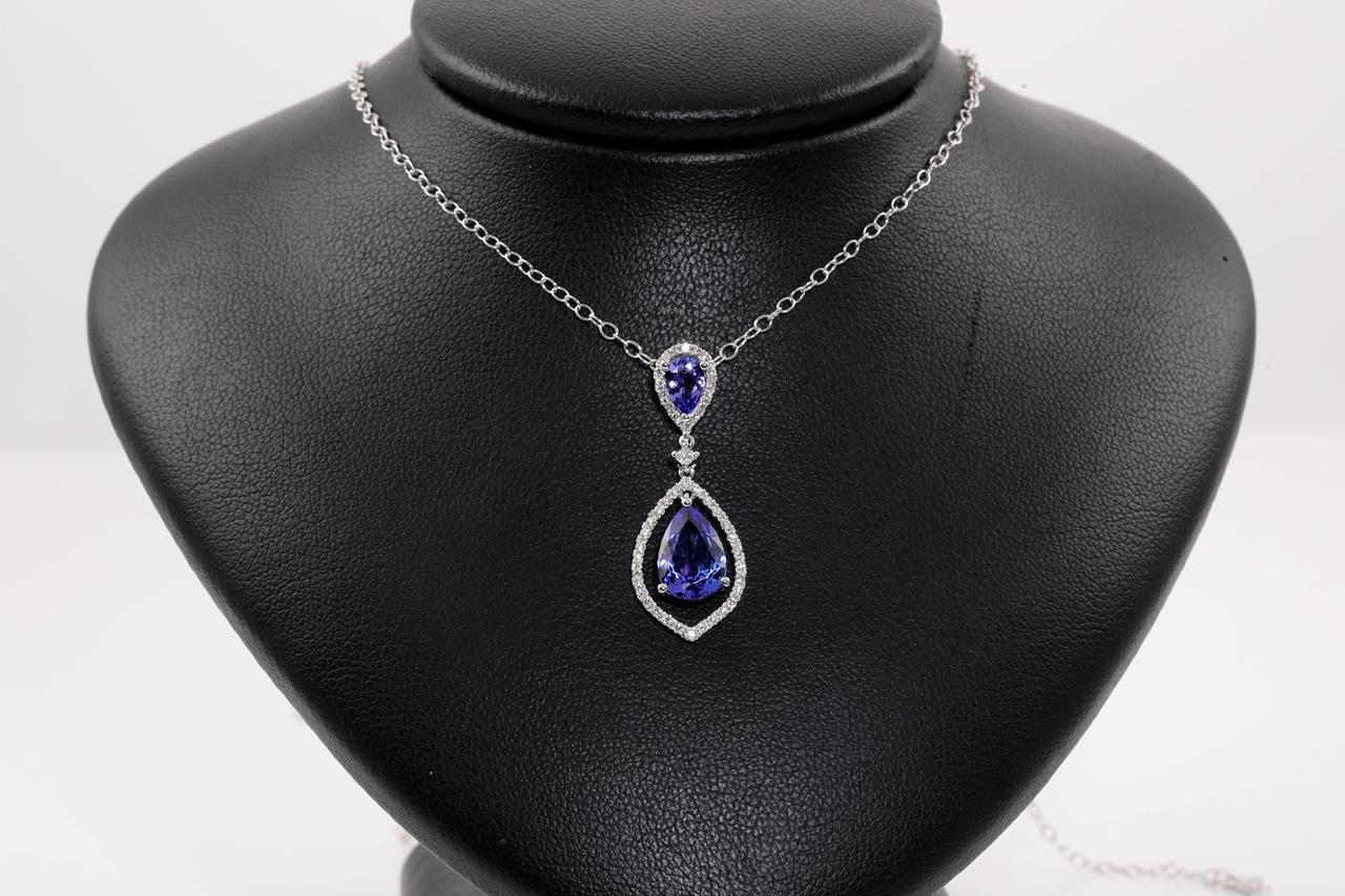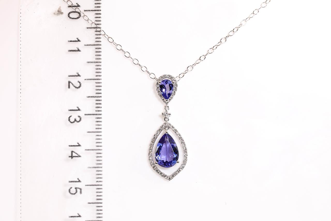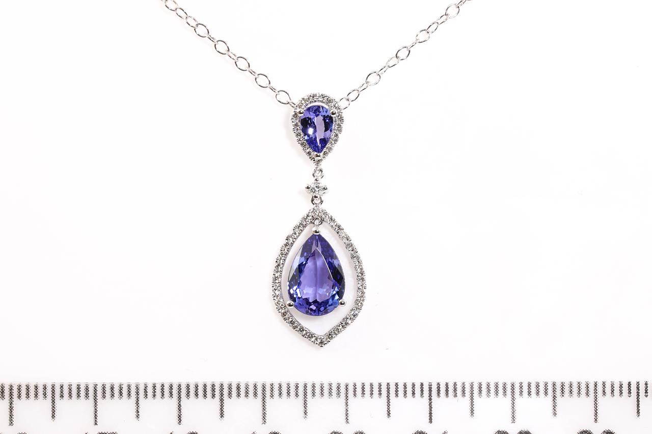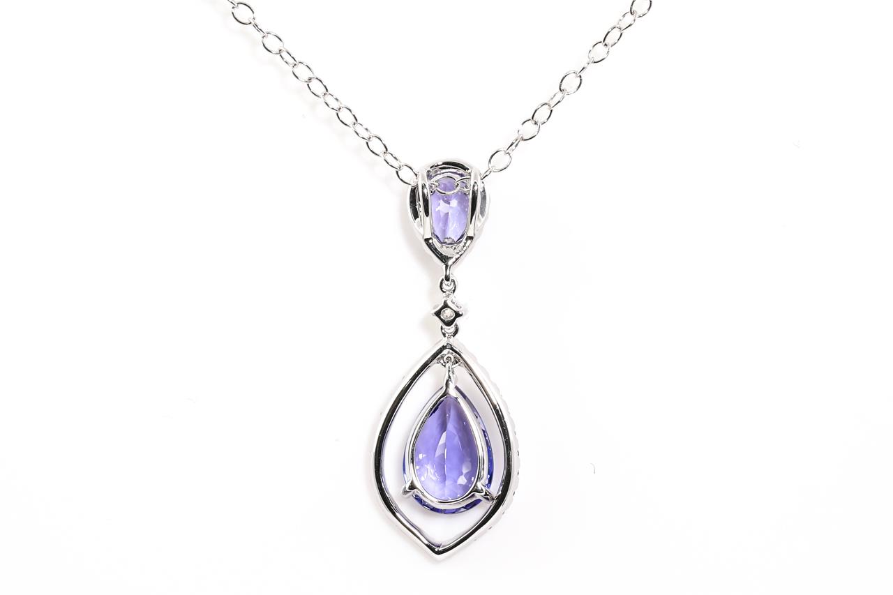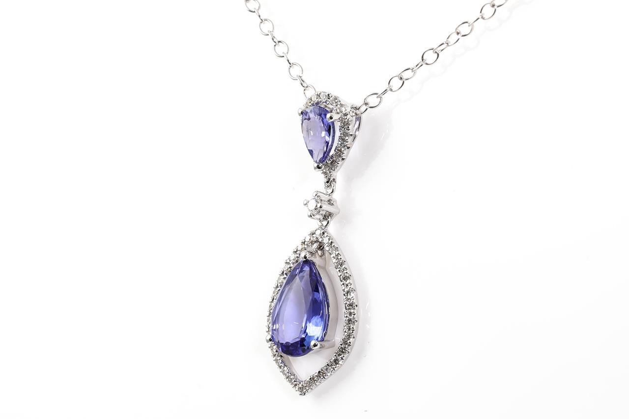 Tanzanite and Diamond pendant with a pear shape Tanzanite of 1.95ct and Diamonds totalling 0.22cts. 18ct white gold with 14ct gold 44cm chain. Weight: 3.3g. (New)