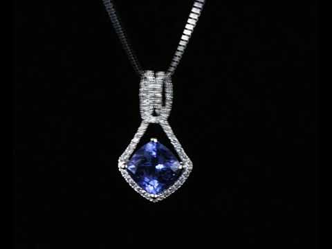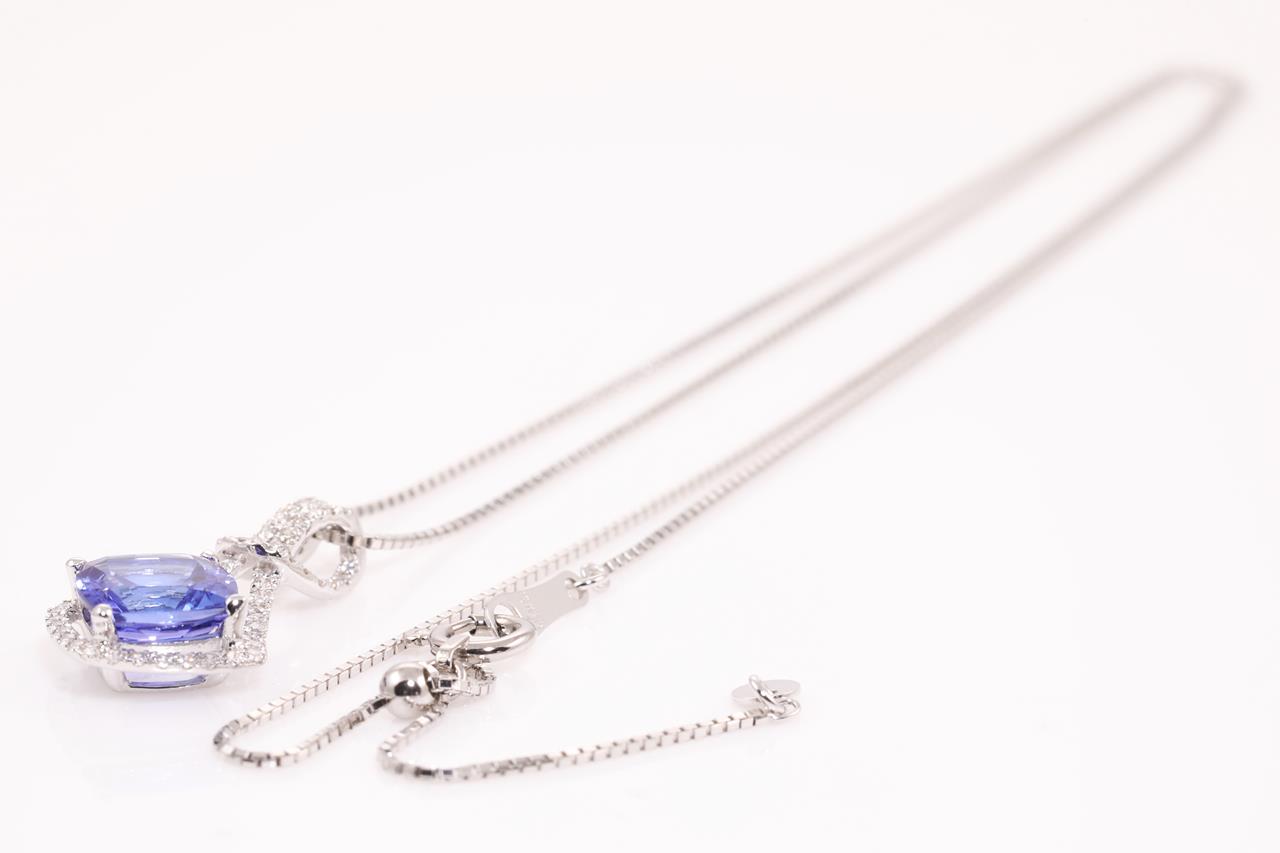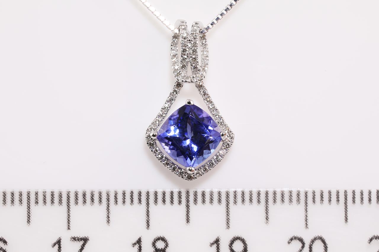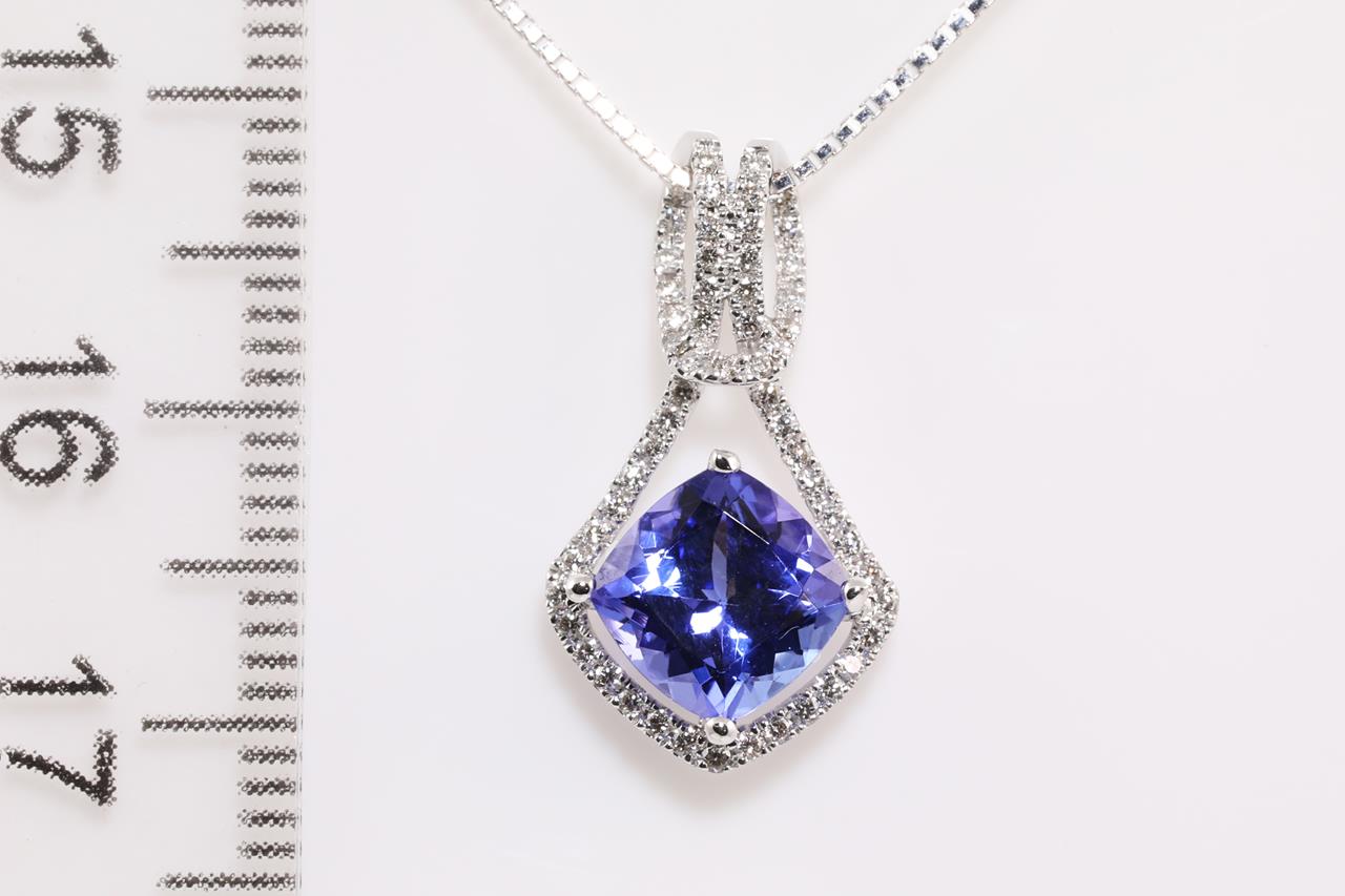Tanzanite and Diamond pendant with a cushion cut Tanzanite of 1.63ct and Diamonds totalling 0.19cts. 18ct white gold with 18ct gold 44cm adjustable chain. Weight: 3.1g. (New)