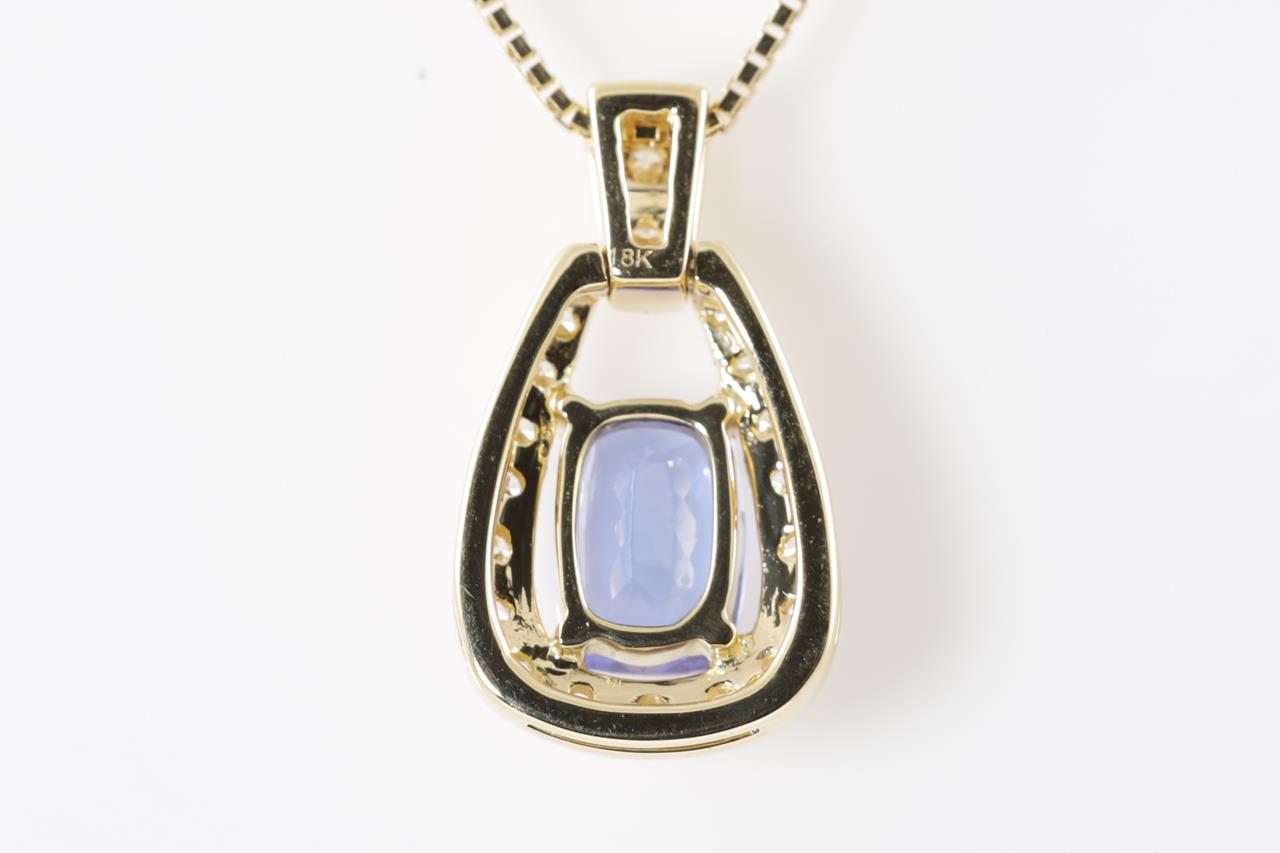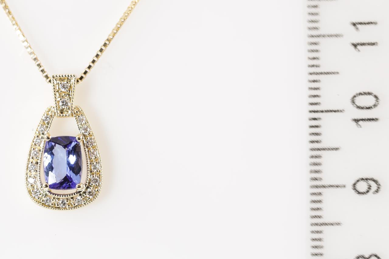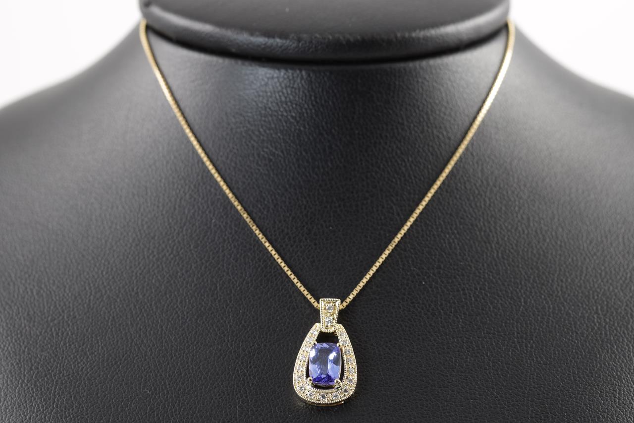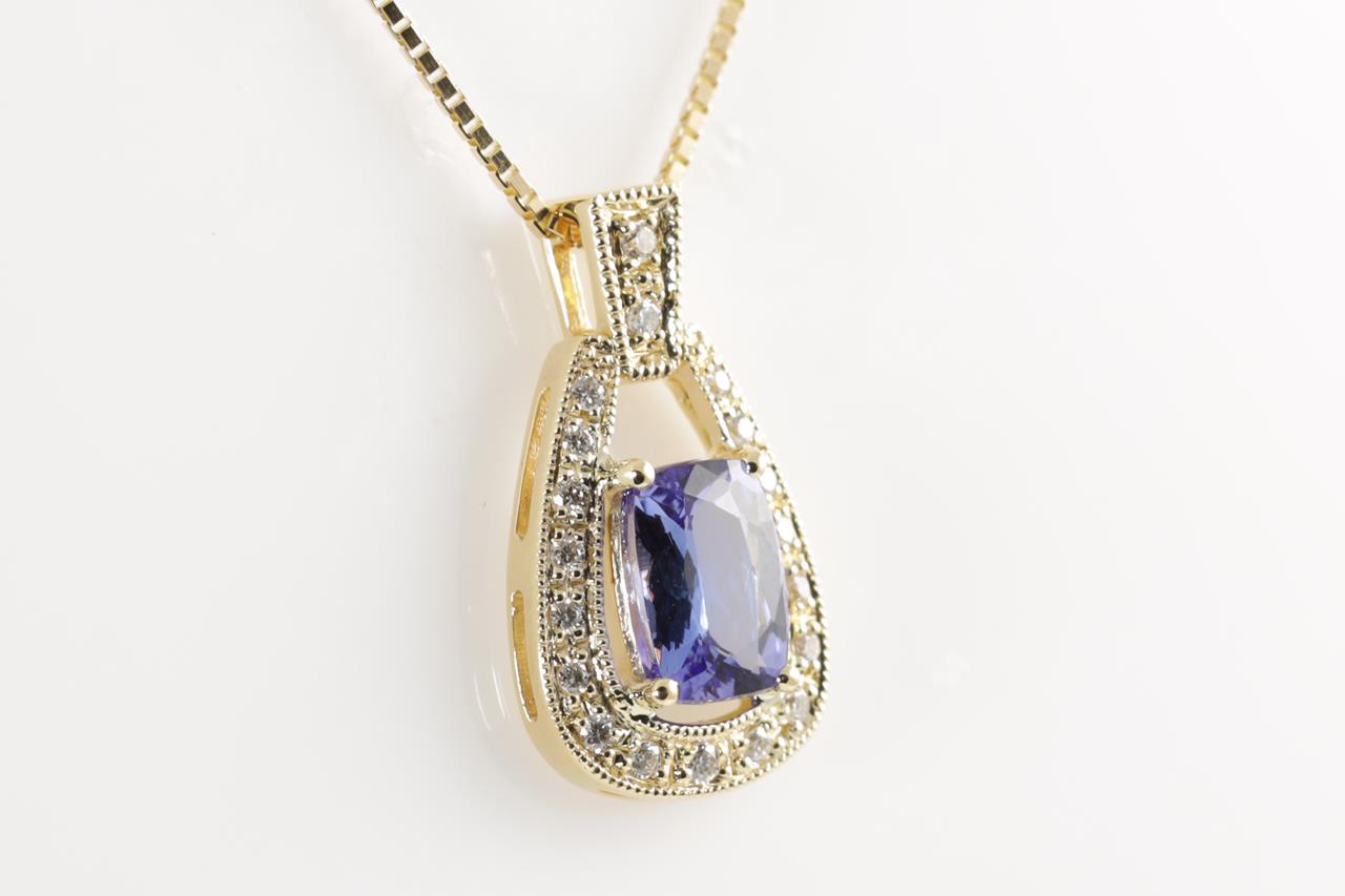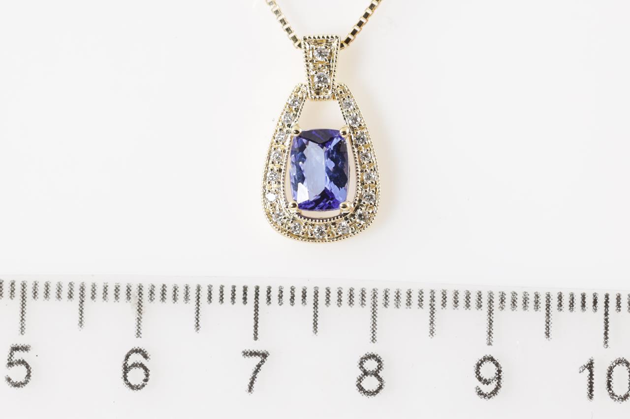 Tanzanite and Diamond pendant with a cushion cut Tanzanite of 1.02ct and Diamonds totalling 0.11cts. 18ct yellow gold with 18ct gold 44cm adjustable chain. Weight: 4.2g. (New)