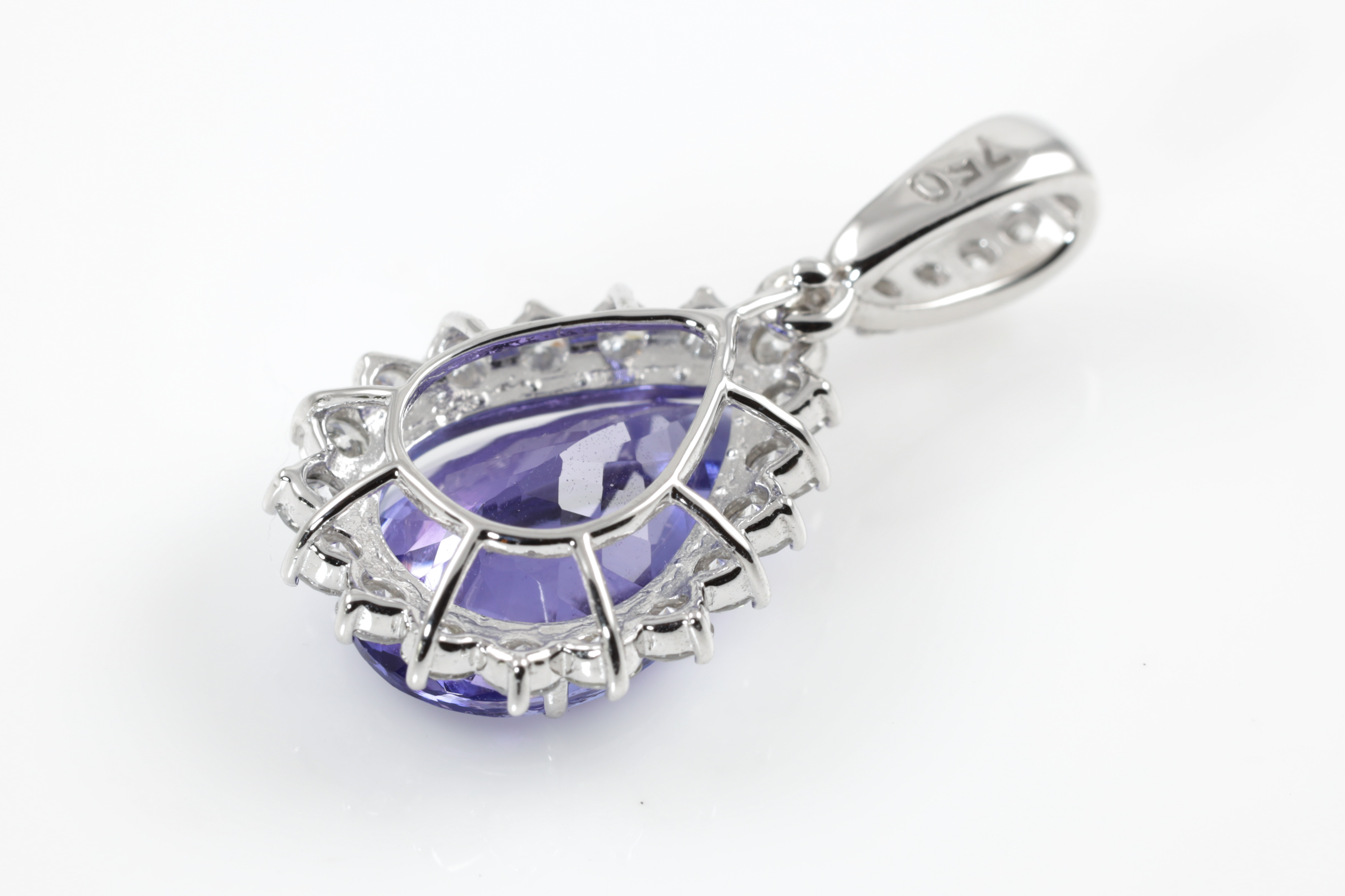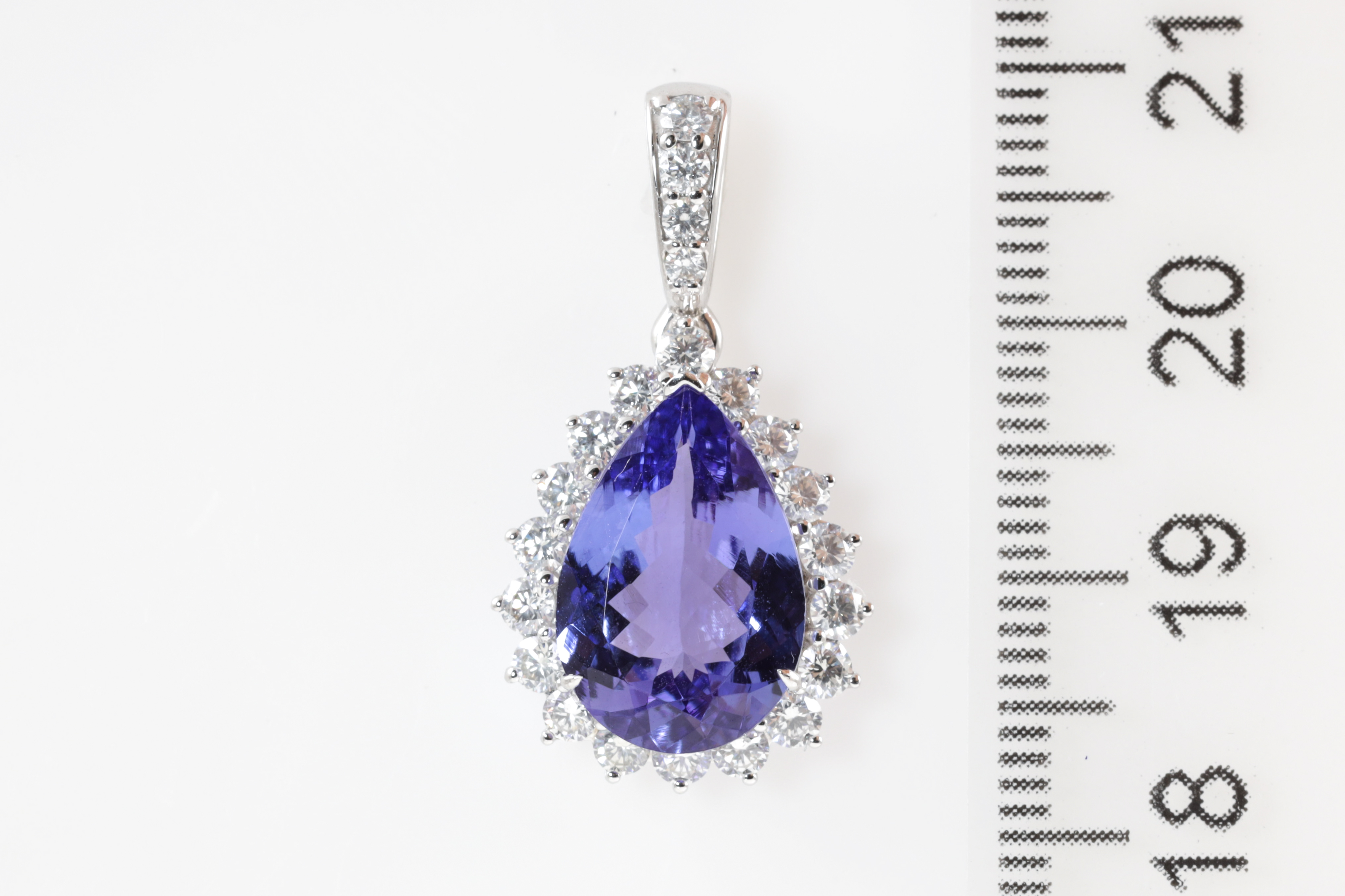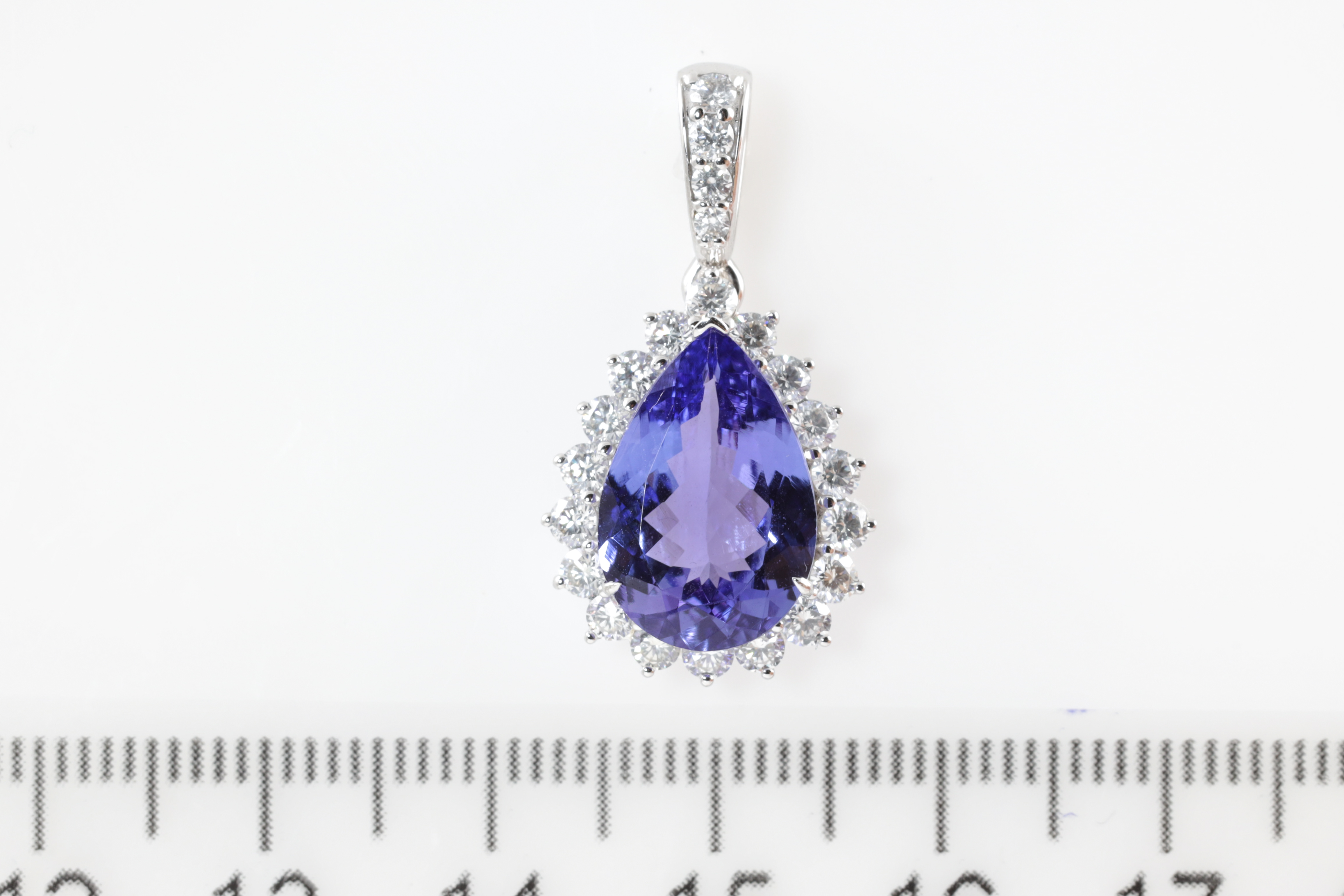 Tanzanite and Diamond Pendant with pear shape tanzanite of 4.76ct and round Diamonds totalling 0.92cts (Estimated grading: G-H SI). 18ct white gold. Length 2.5cm. No chain. Weight 3.0g. (Pre-owned)