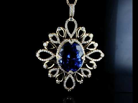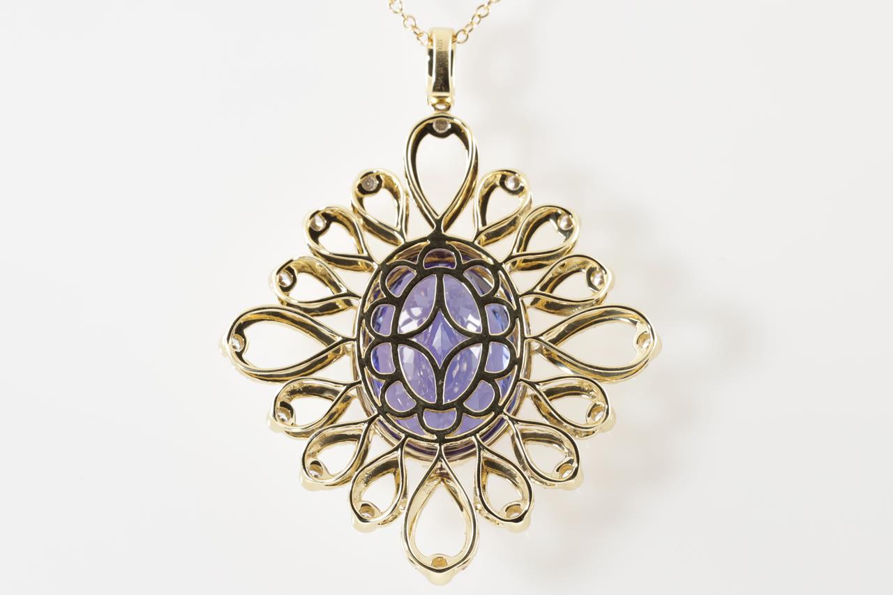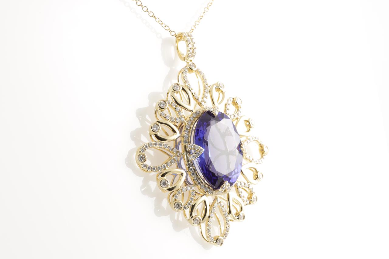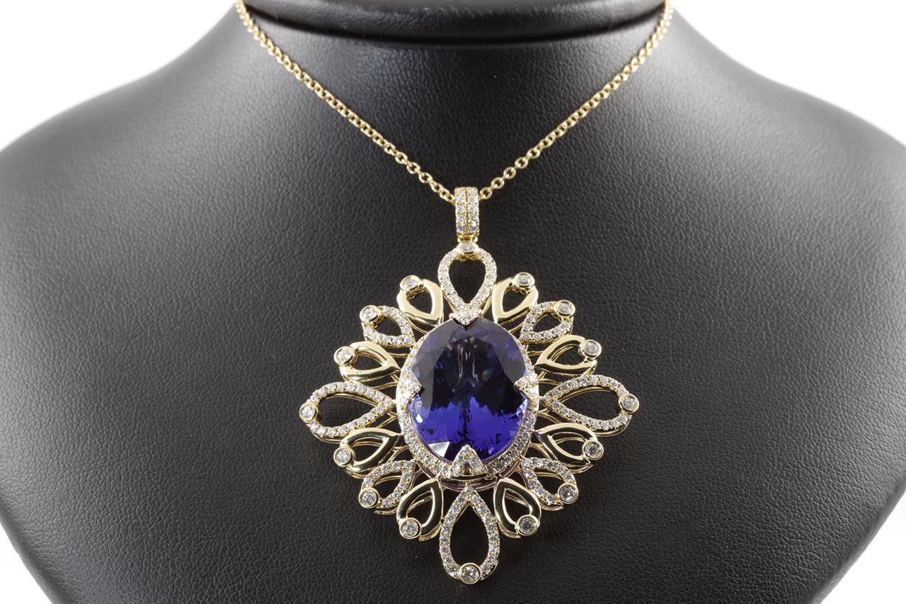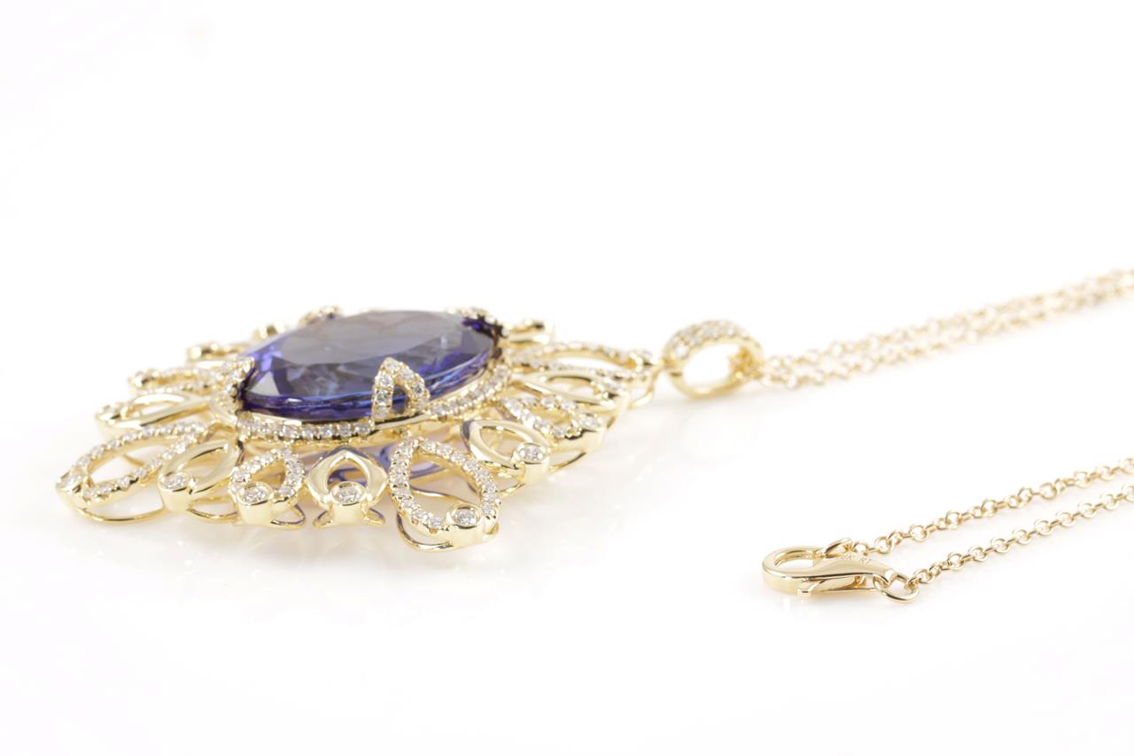 Tanzanite and Diamond pendant with oval shape Tanzanite of 24.52ct and Diamonds totalling 1.99cts (Estimated grading: H-I SI). 18ct yellow gold with 45cm chain. Length: 45cm. Weight: 23.7g. With Certificate #414682. (As new)