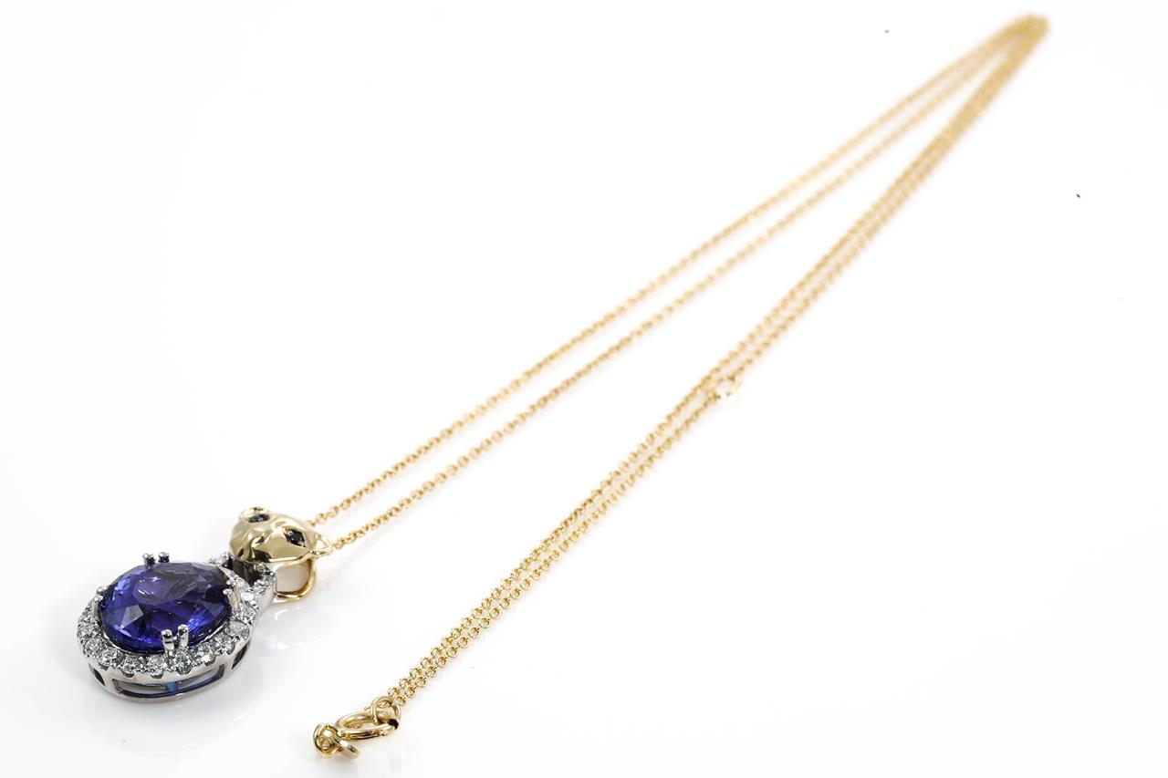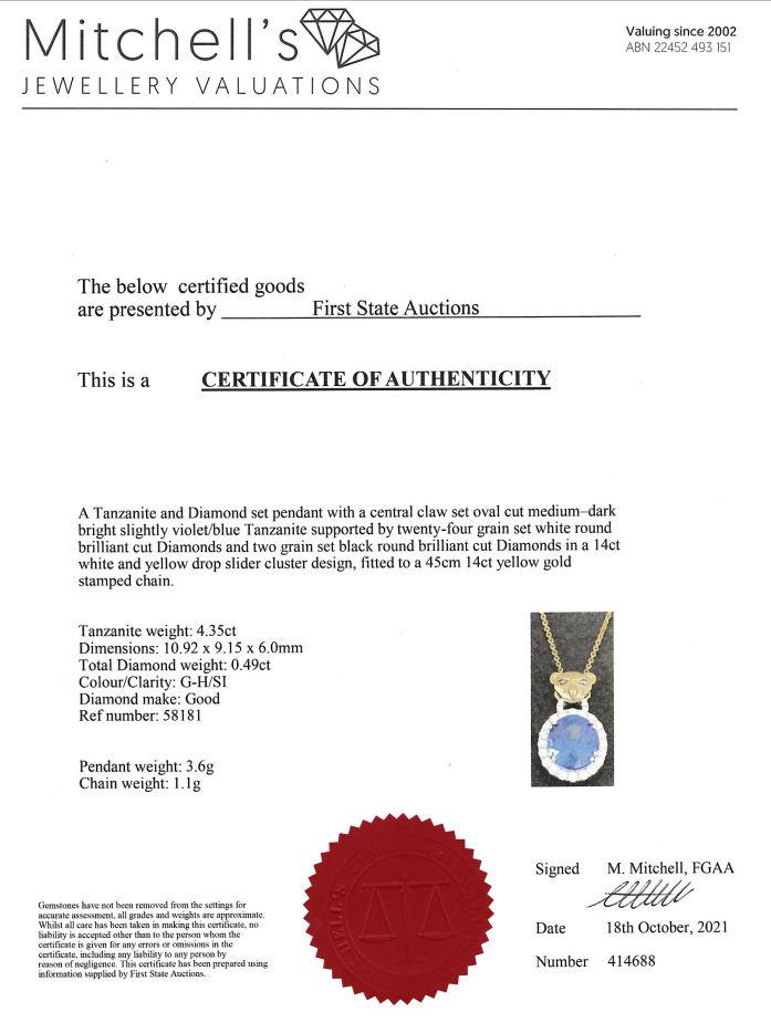 Tanzanite and Diamond pendant with Tanzanite of 4.35ct and Diamonds totalling 0.49cts (Estimated grading: G-H SI). 14ct yellow & white gold with 45cm chain. Weight: 4.7g. With Certificate #414688. (As new)