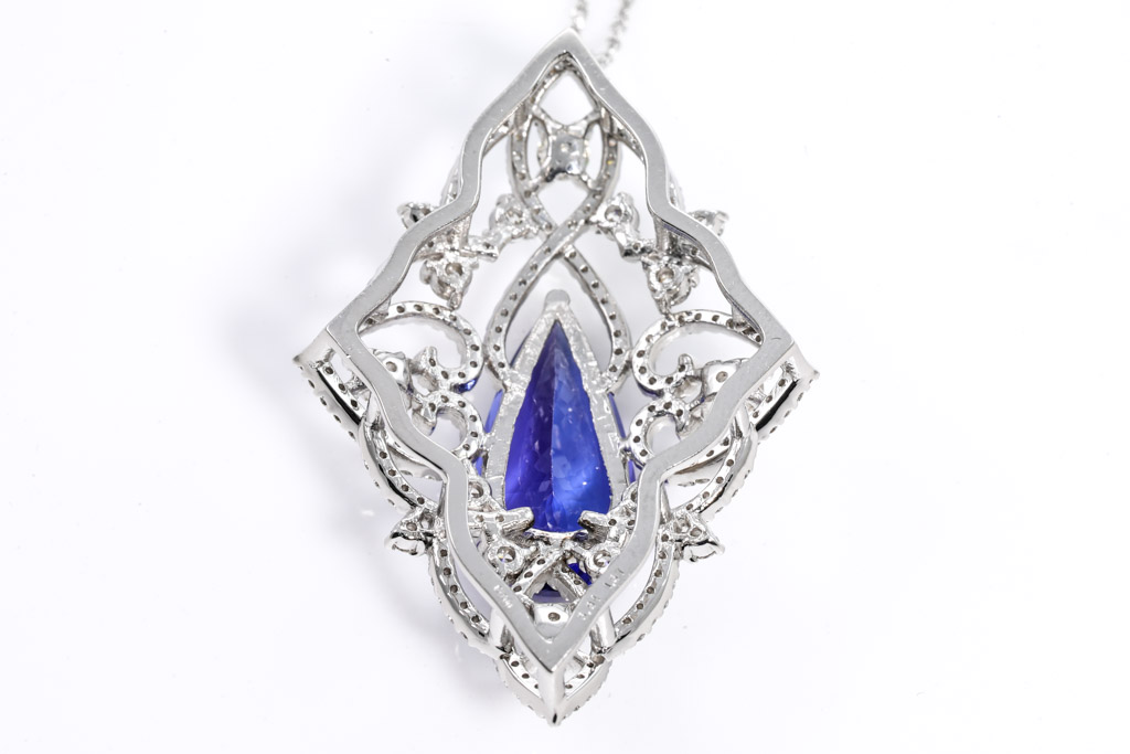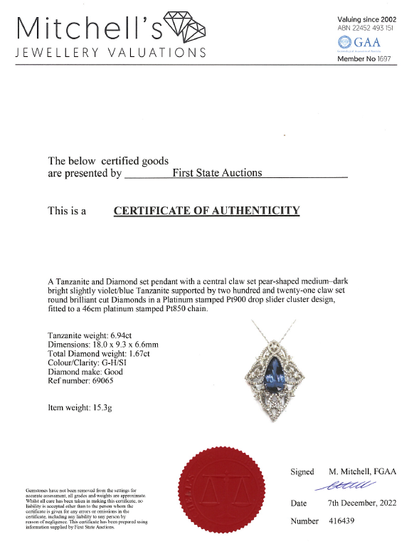 Tanzanite and Diamond pendant with pear shape Tanzanite of 6.94ct and round Diamonds totalling 1.67cts (Estimated grading: G-H SI). Platinum with 45cm platinum chain. Weigh: 15.3g. With Certificate #416439. (Pre-owned)