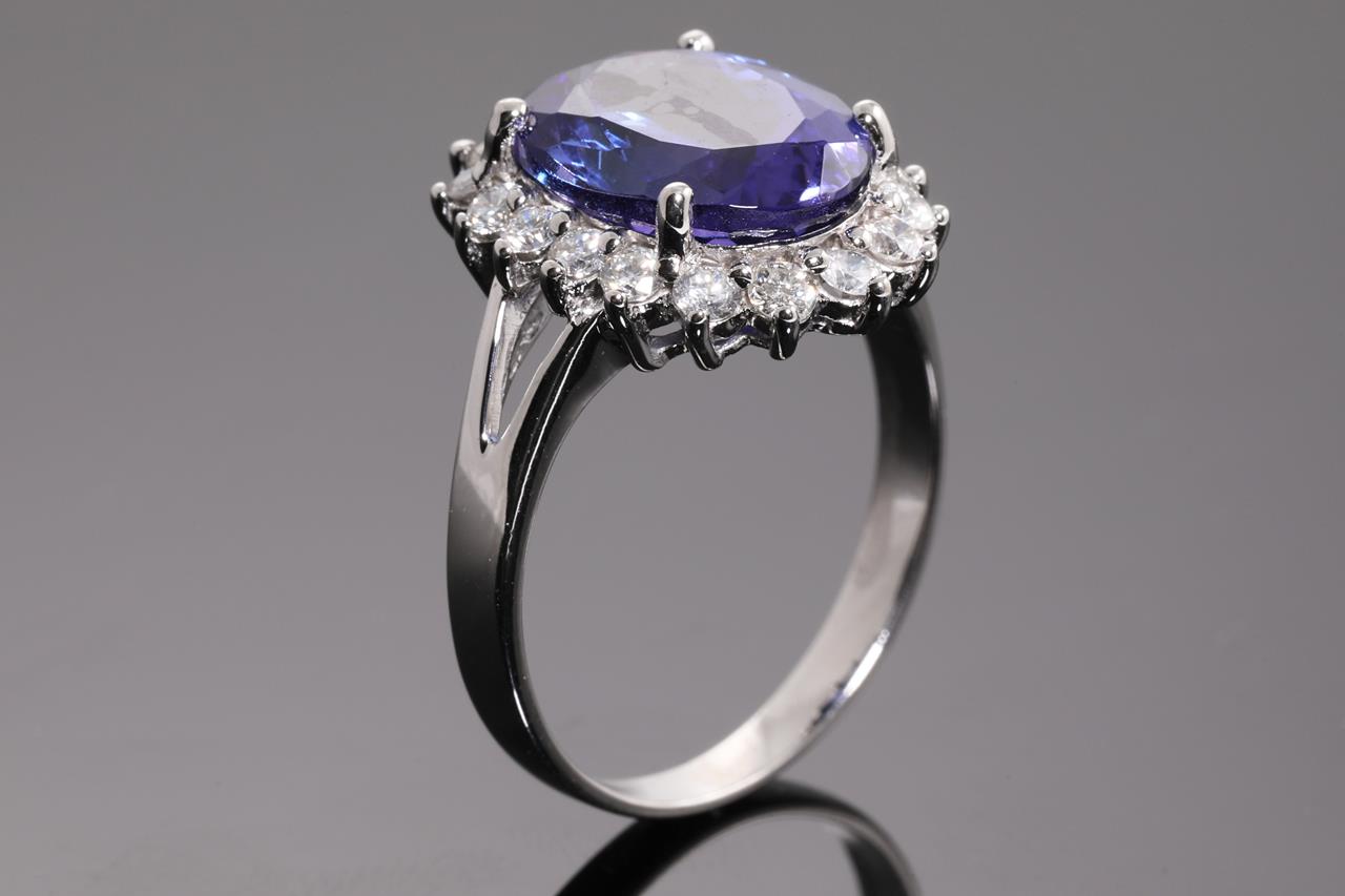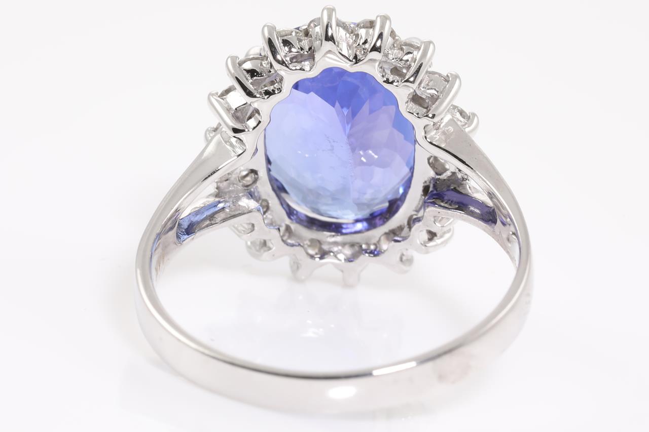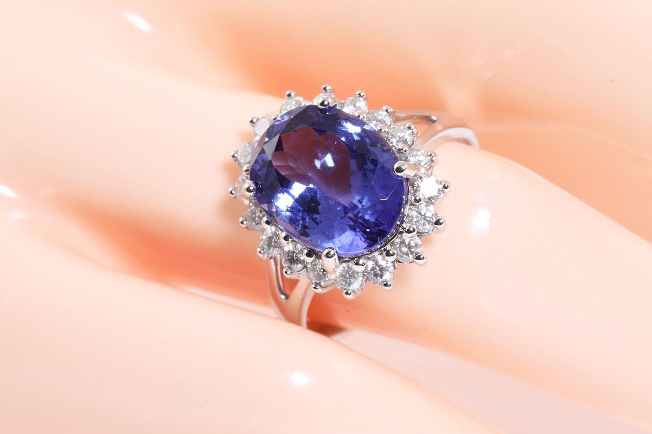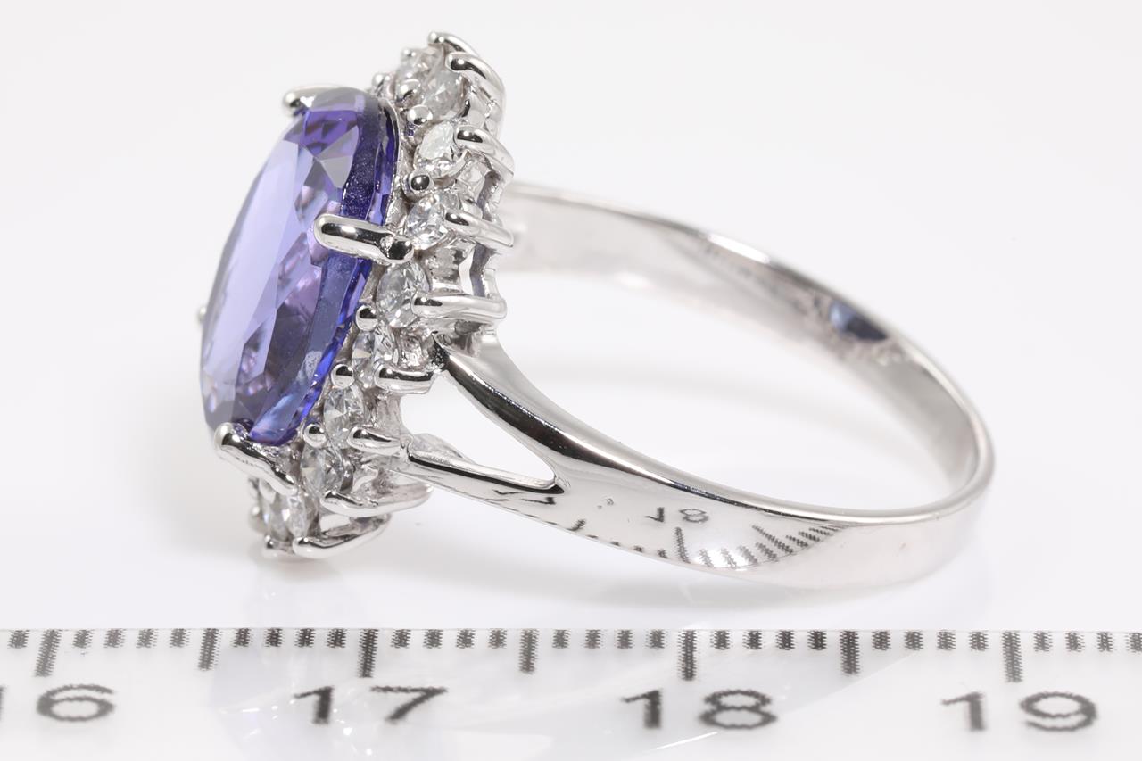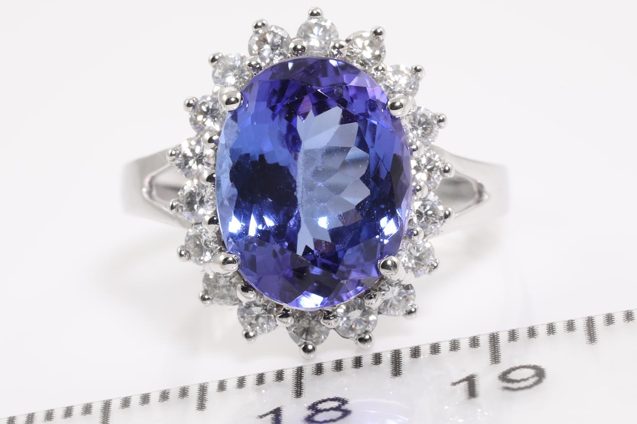 Tanzanite and Diamond Ring with oval cut Tanzanite of 6.34ct and round Diamonds totalling approximately 0.72cts (estimated grading TBA). 14ct white gold. Ring size Q. Weight 5.2g. (Pre-owned)