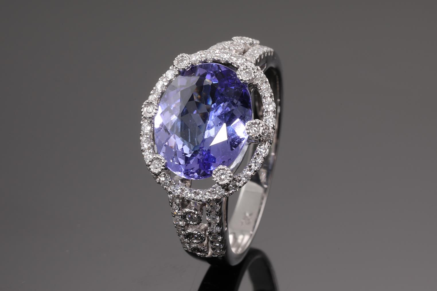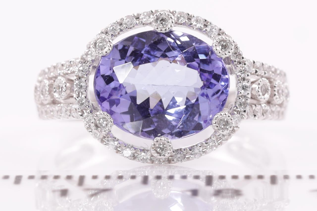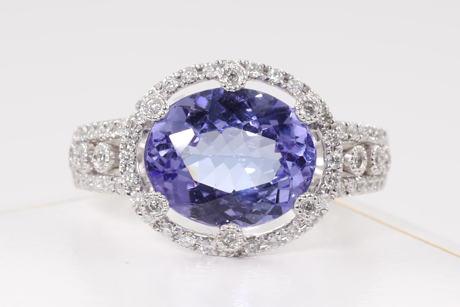 Tanzanite and Diamond Ring with oval Tanzanite of 3.30cts and round Diamonds totalling 0.33cts (Estimated grading: I P1-2). 18ct white gold. Ring size N. Weight 4.6g. (As New)