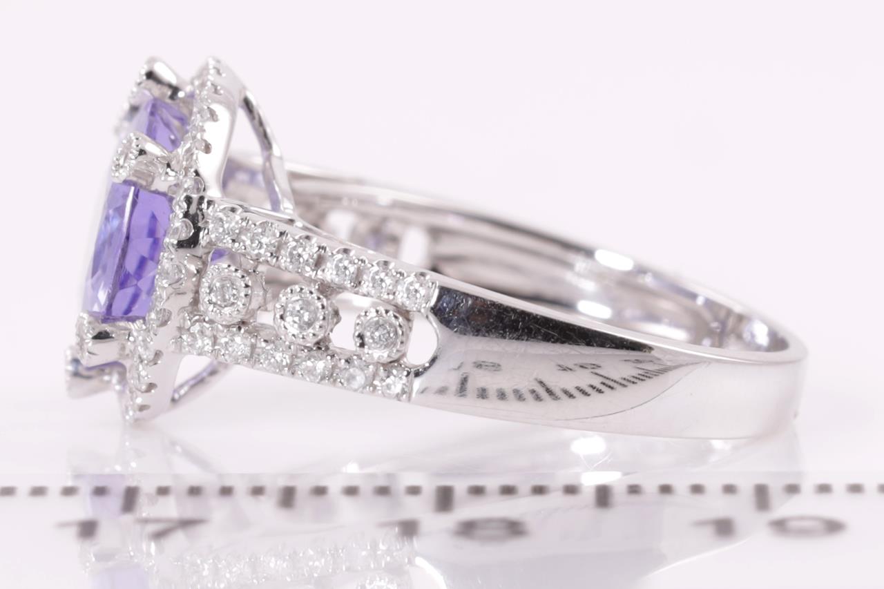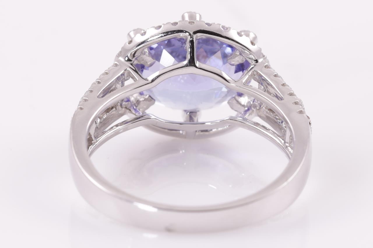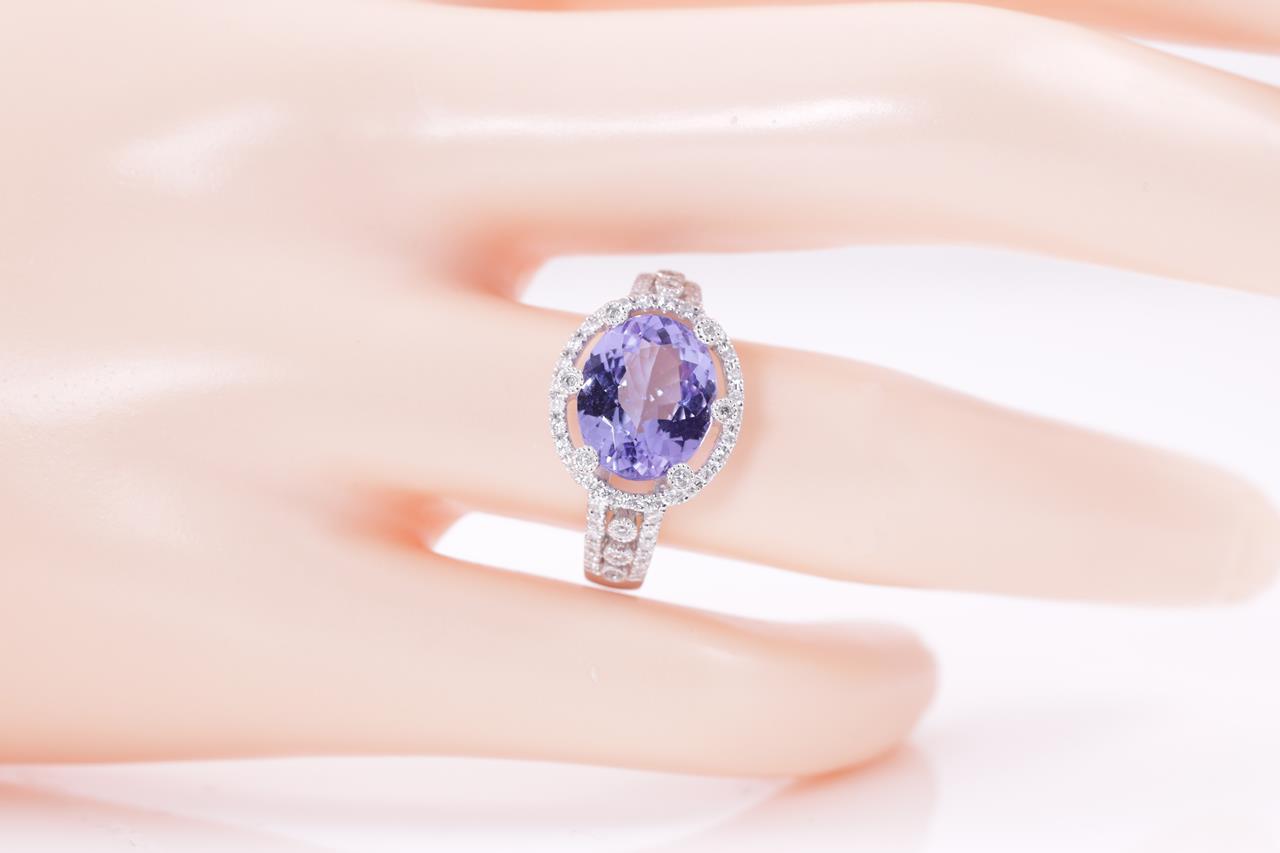 Tanzanite and Diamond Ring with oval Tanzanite of 3.30cts and round Diamonds totalling 0.33cts (Estimated grading: I P1-2). 18ct white gold. Ring size N. Weight 4.6g. (As New)