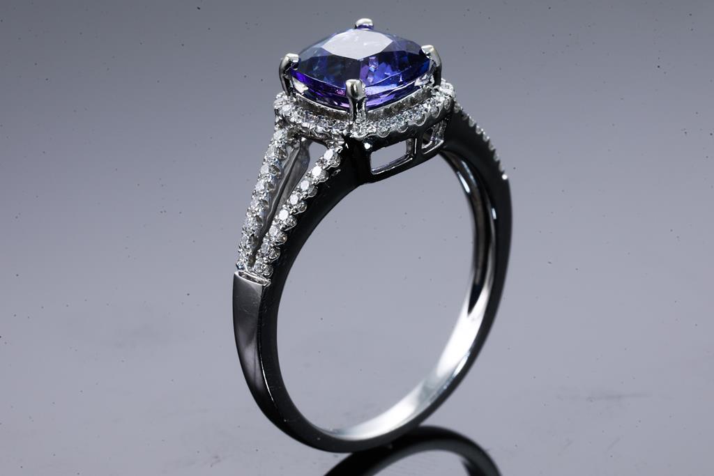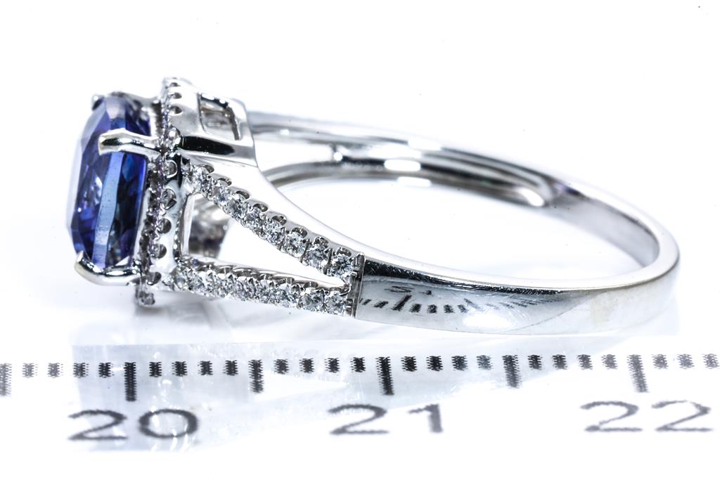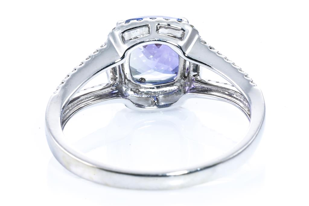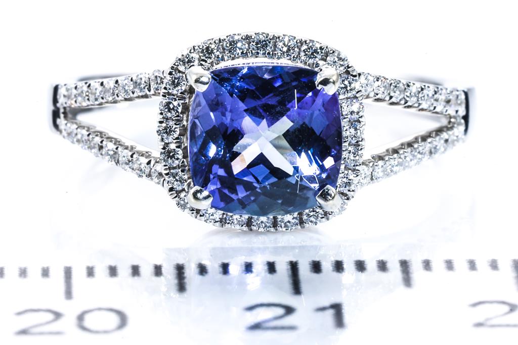 Tanzanite and Diamond ring with cushion checkerboard Tanzanite of approximately 1.30cts and Diamonds totalling 0.25cts. 14ct White gold. Ring size N1/2 - can only be resized up by a maximum of 3 sizes. Weight 3.1g. (Pre-owned)