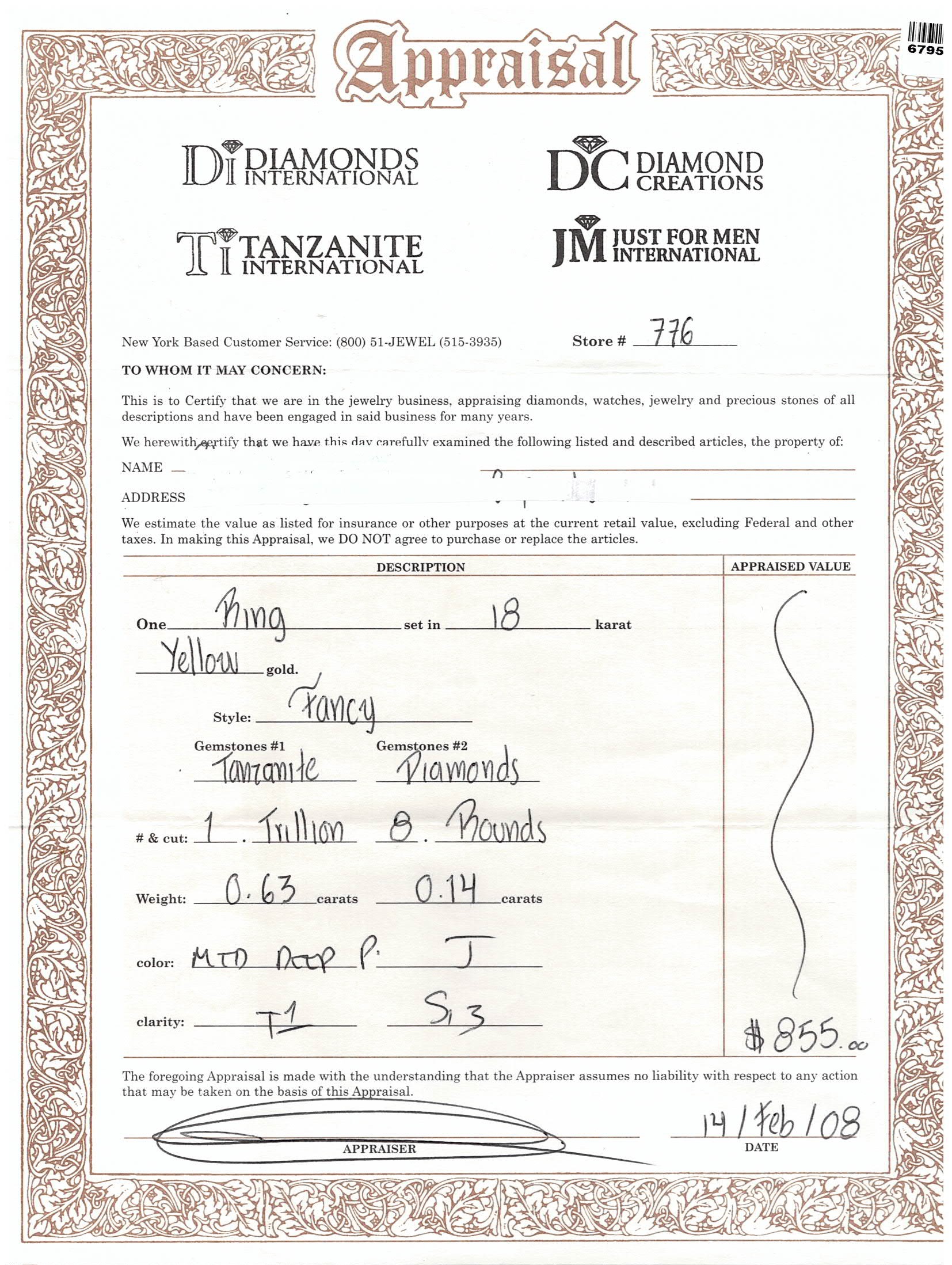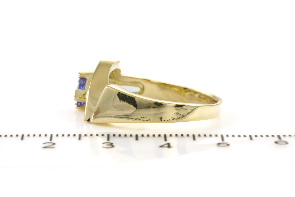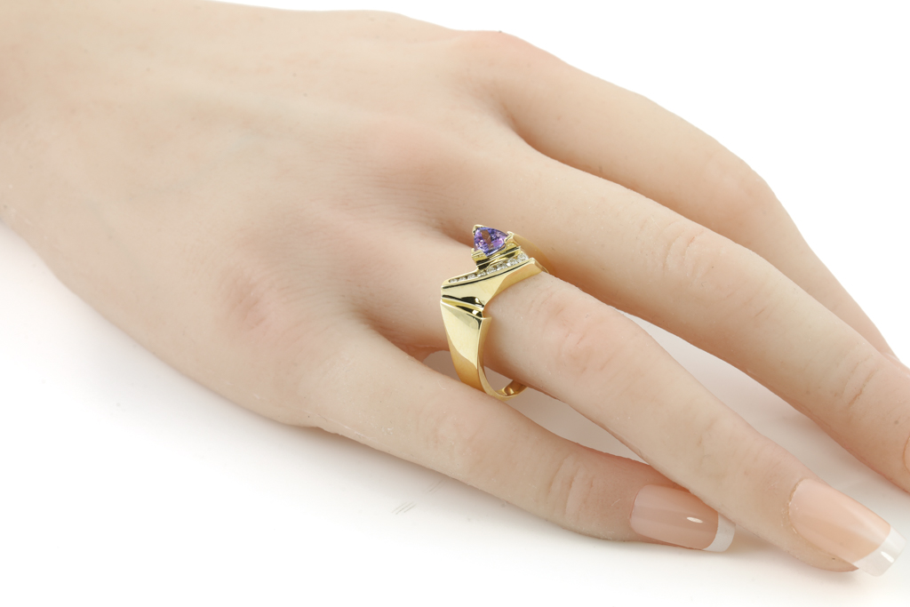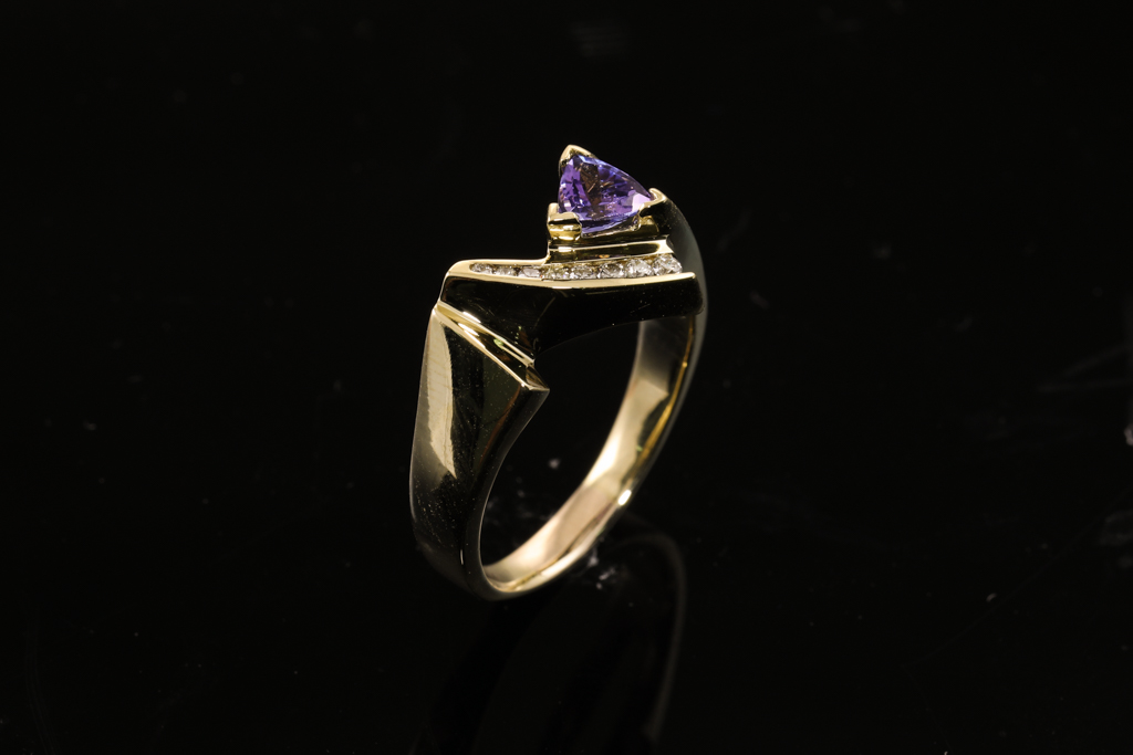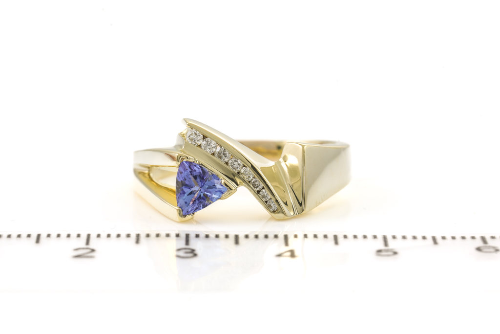 Tanzanite and Diamond Ring with trilliant cut Tanzanite of approximately 0.63ct and round Diamonds totalling approximately 0.14cts. 18ct yellow gold. Ring size U - ring resizing not recommended. Weight 8.4g. With Appraisal. (Pre-owned)