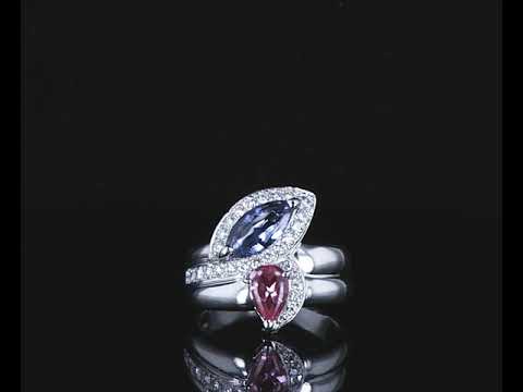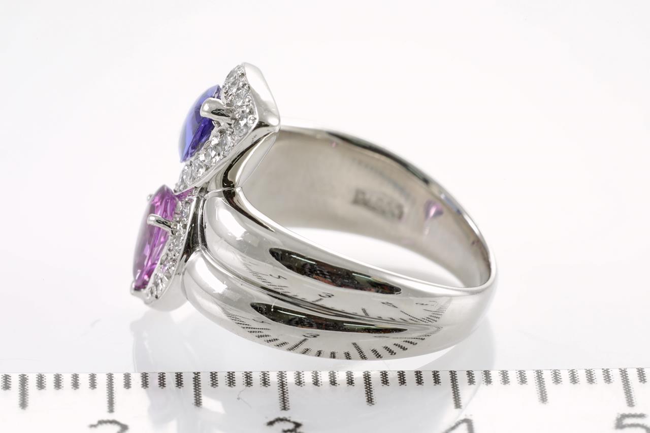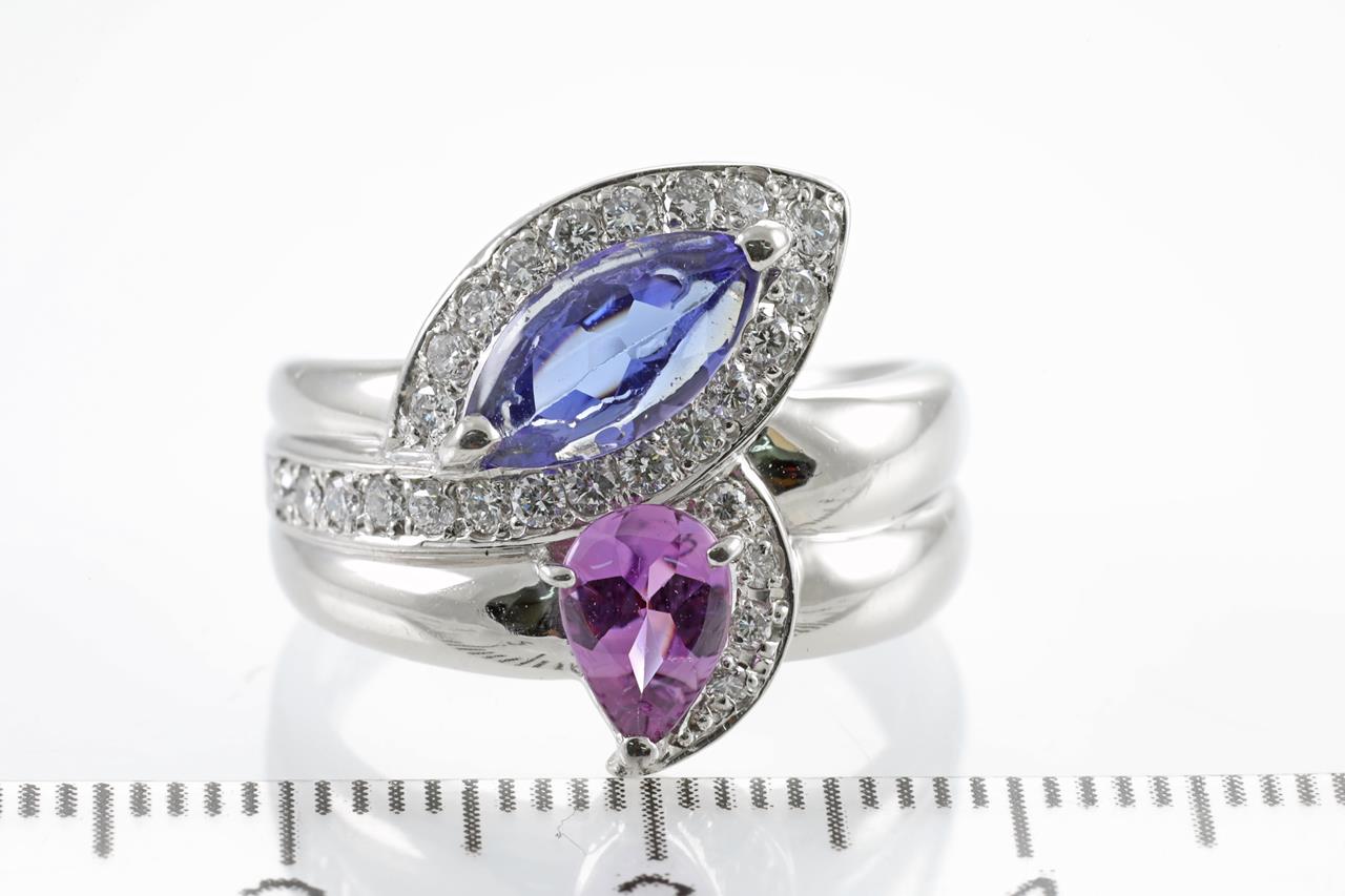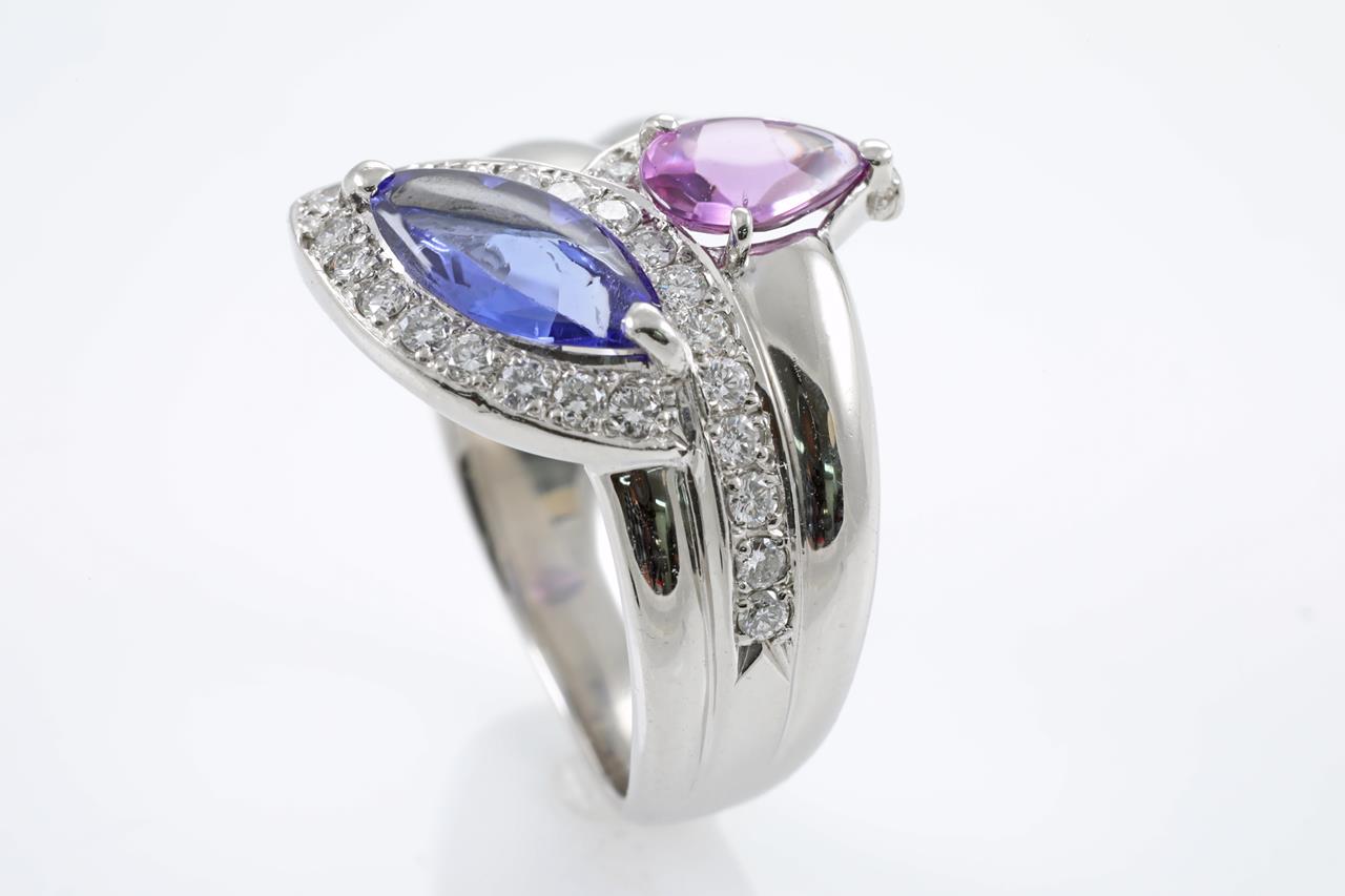 Ring with a marquise cut cabochon Tanzanite of 0.94ct, pear shape pink cabochon Sapphire of 0.71ct and round Diamonds totalling approximately 0.65cts (Estimated grading: H SI). Platinum. Weight: 12.7g. Ring size L1/2 . (Pre-owned)